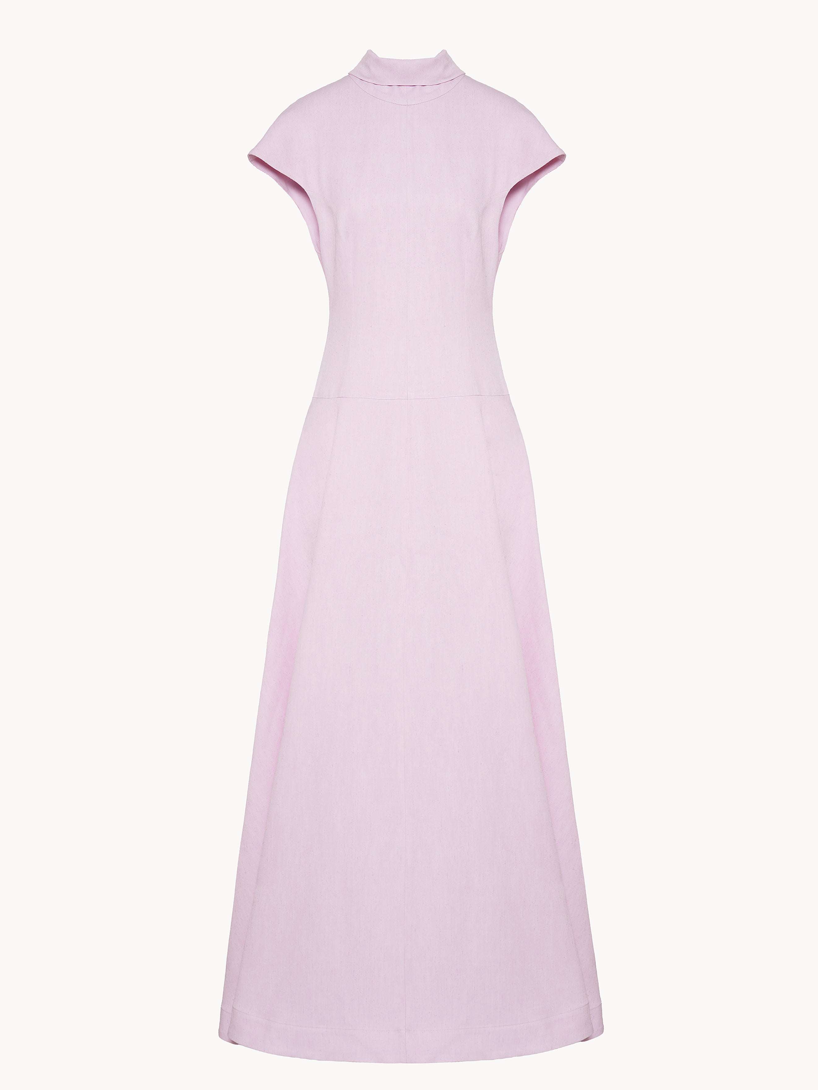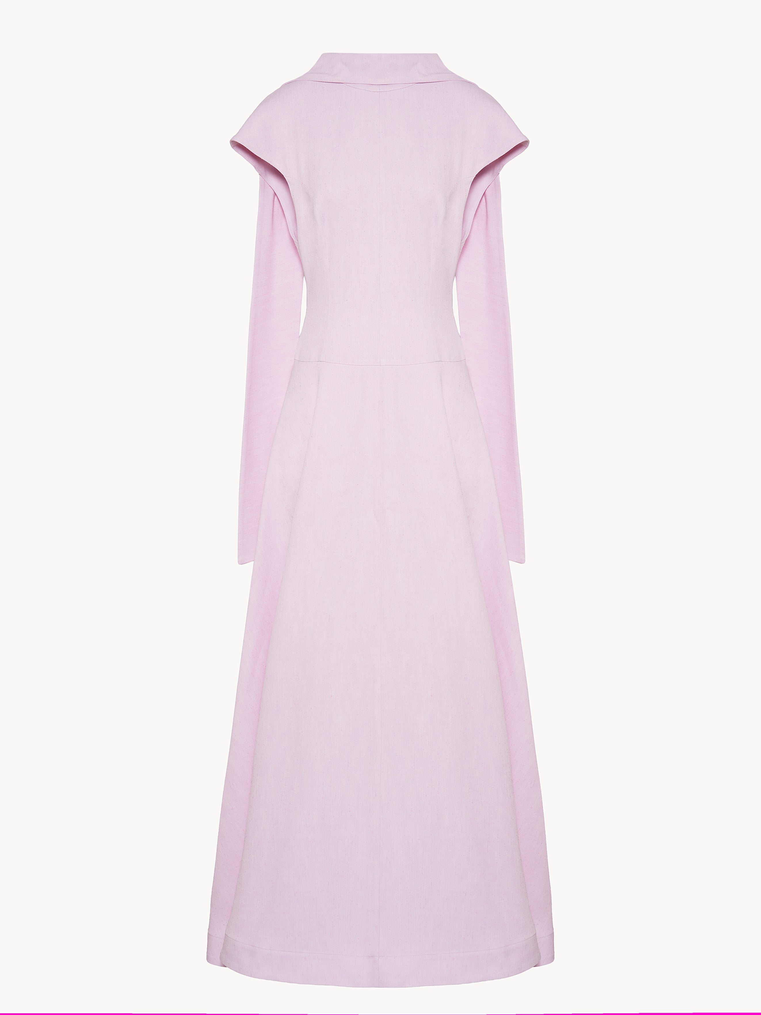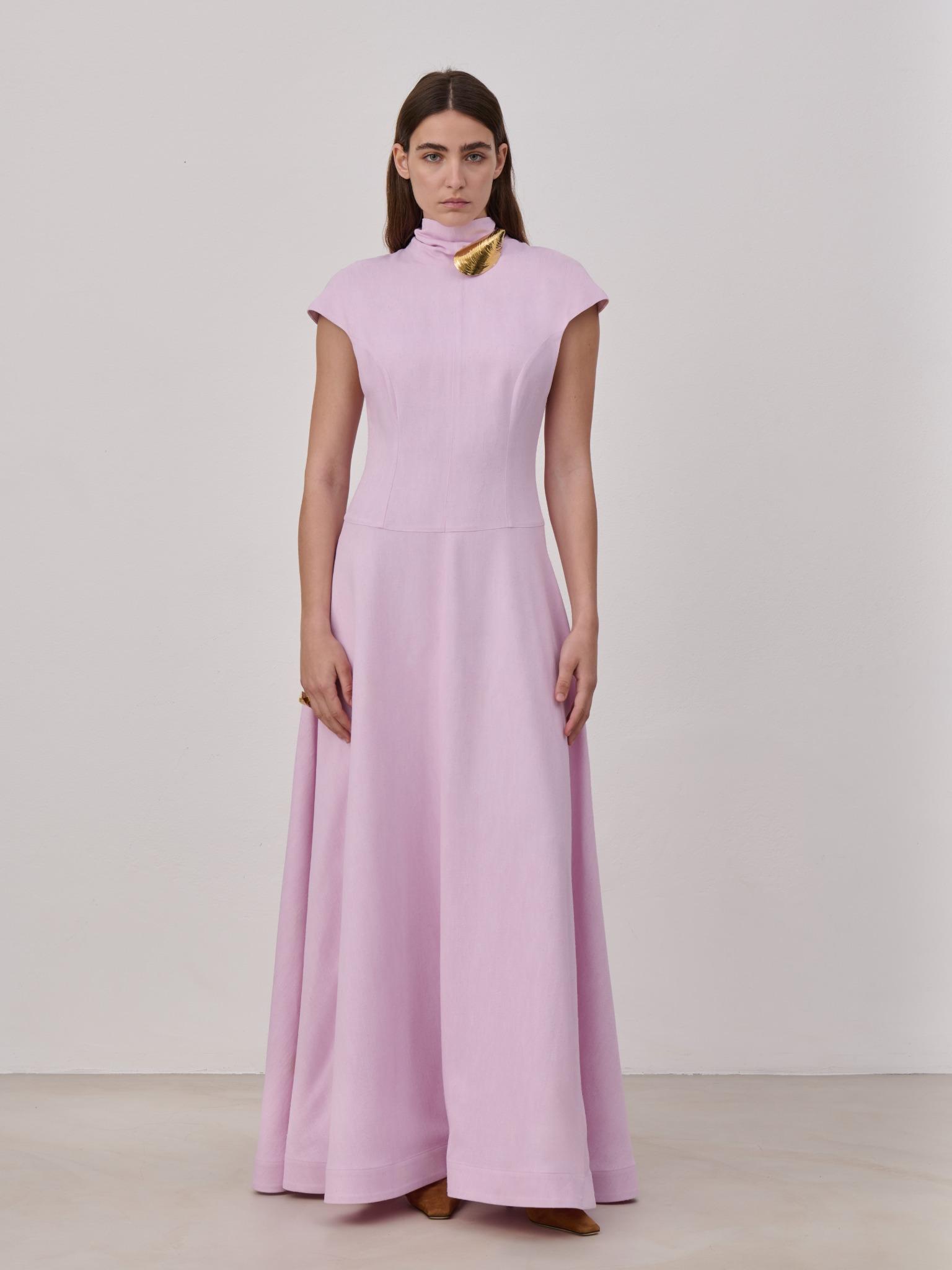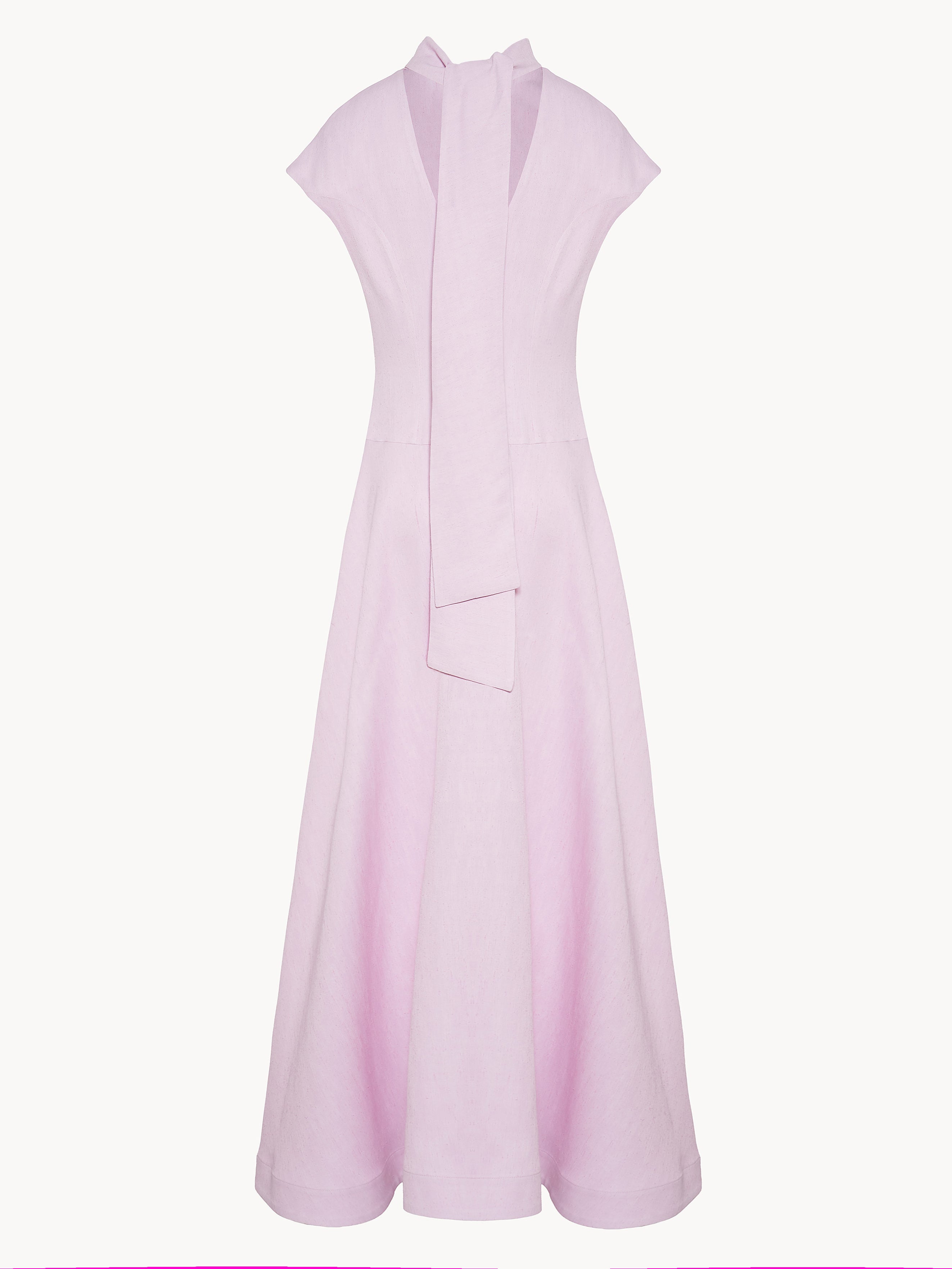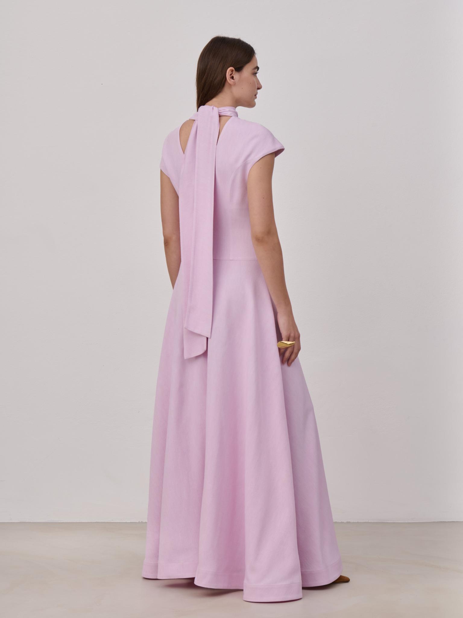 Long dress in viscose featuring a sculpted, form-fitting upper silhouette that opens into a flowing, full circle skirt , side pockets,invisible back zipper closure and an inverted collar construction that extends into two loosie ties at the back, allowing for adjustable and creative styling and. Unlined. Made in Italy.