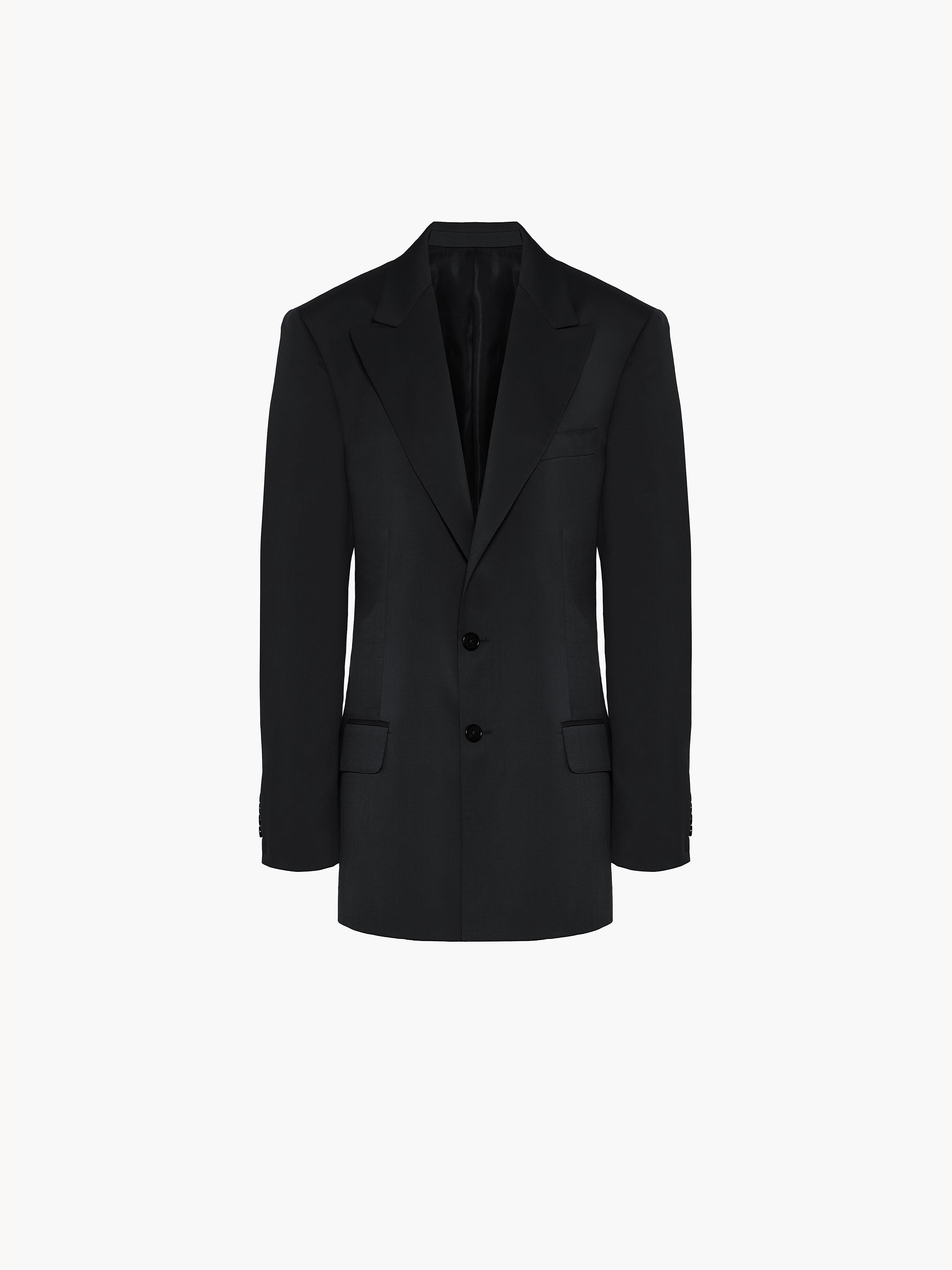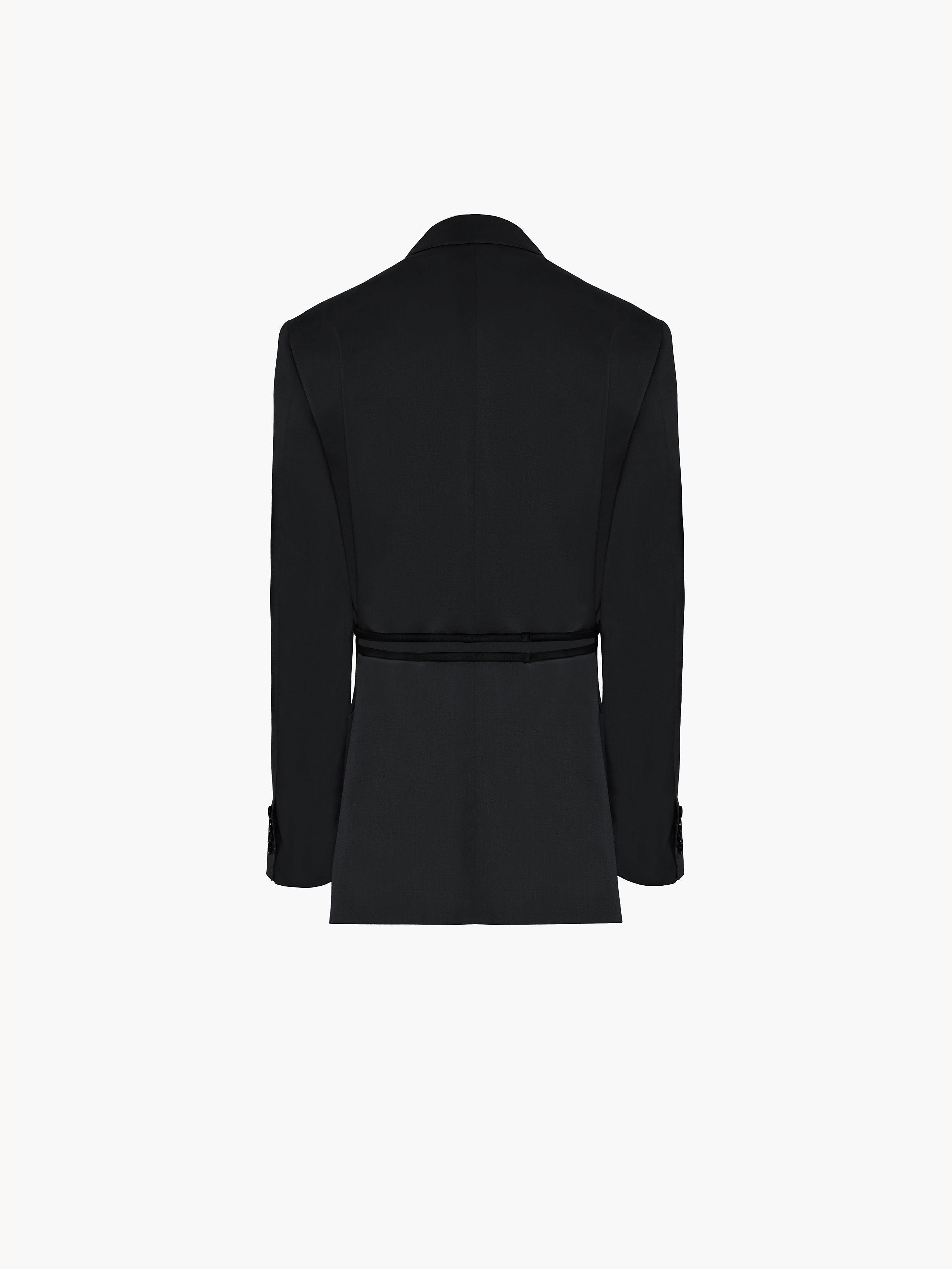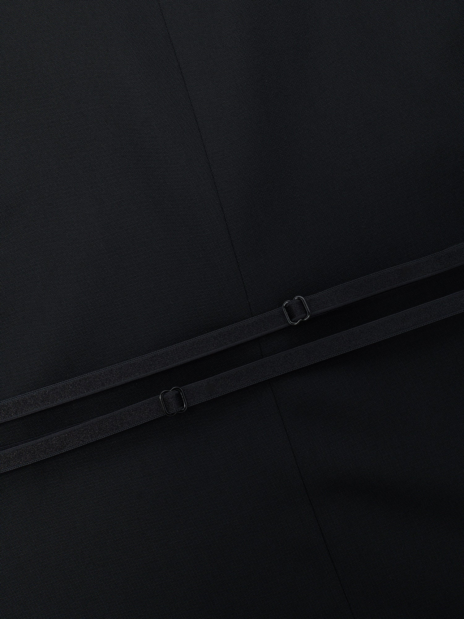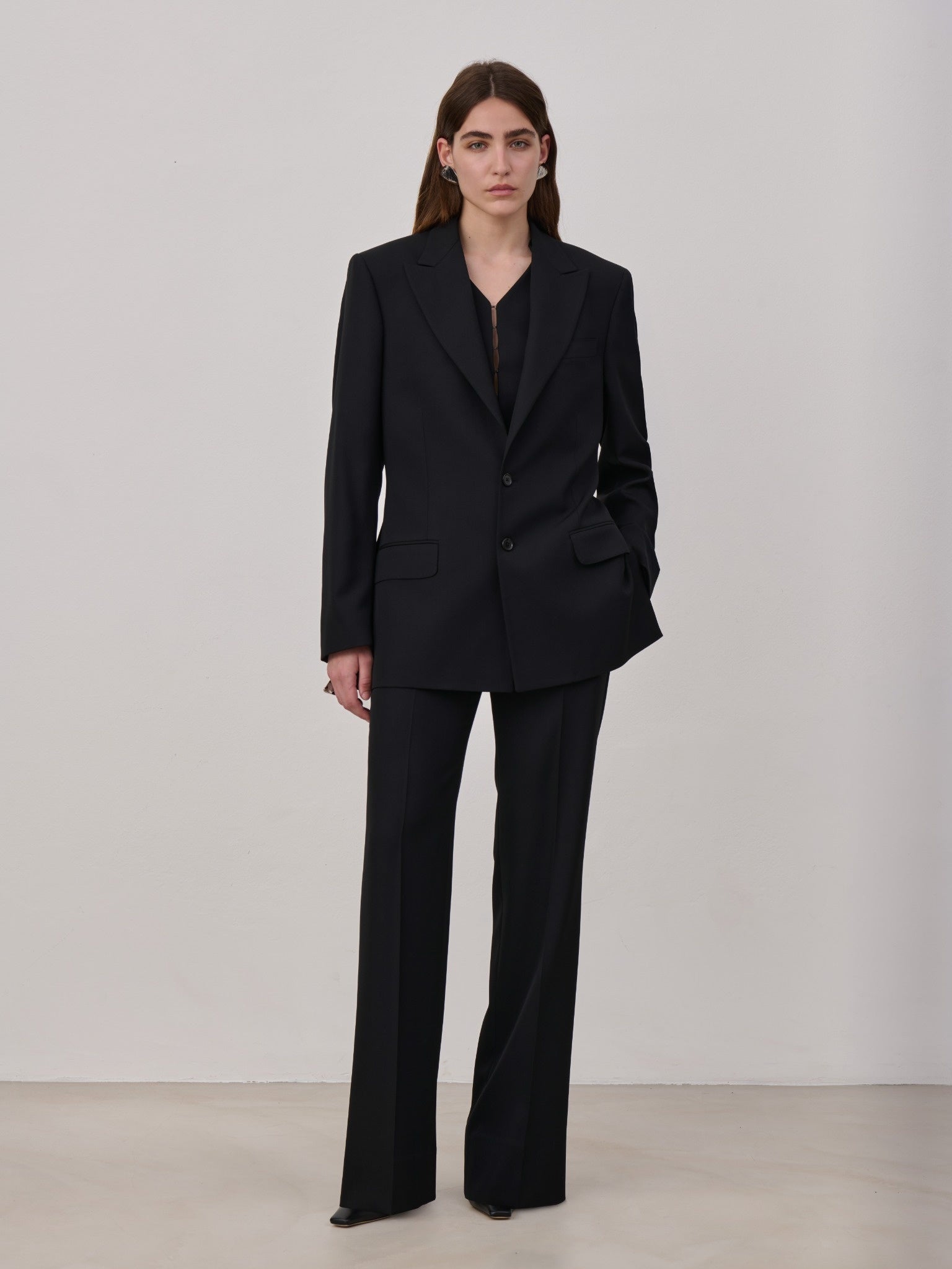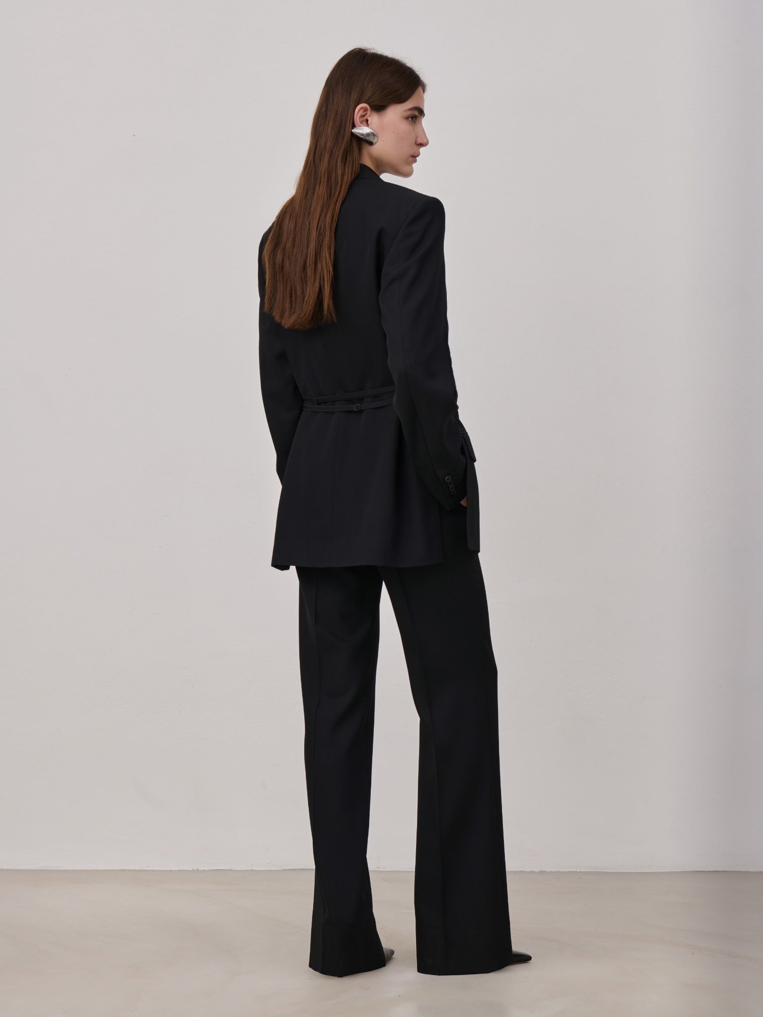 Tailored single-breasted menswear inspired jacket in virgin wool with peak lapel, chest pocket, front flap pockets, interior pockets and lateral back vent. Featuring two elastic straps that enhance the fit and allow for a more defined waistline, ideal for those seeking a sleek, feminine silhouette. 100% Virgin Wool. Lining 100% Cupro. Horn buttons. Made in Italy.