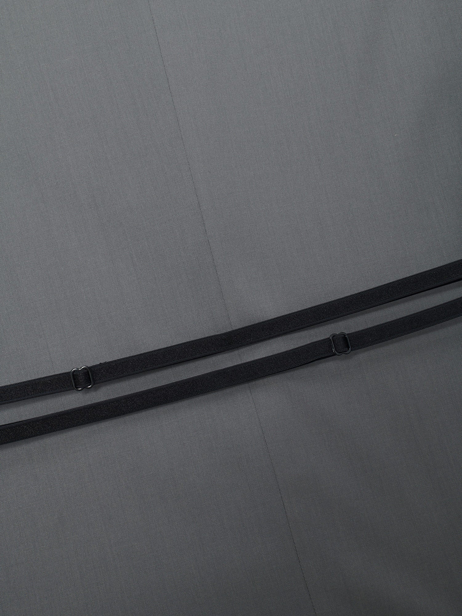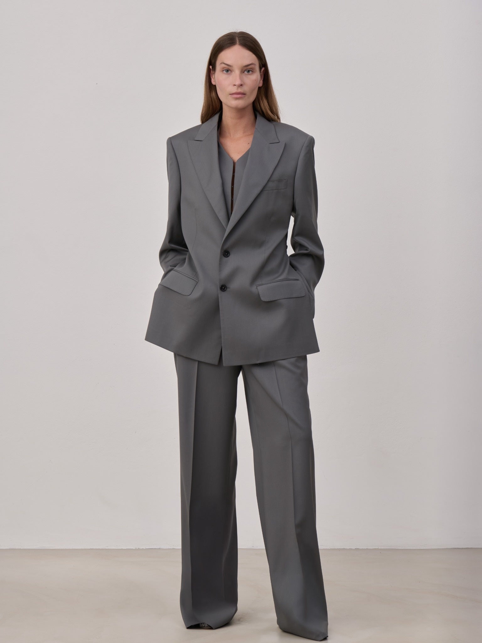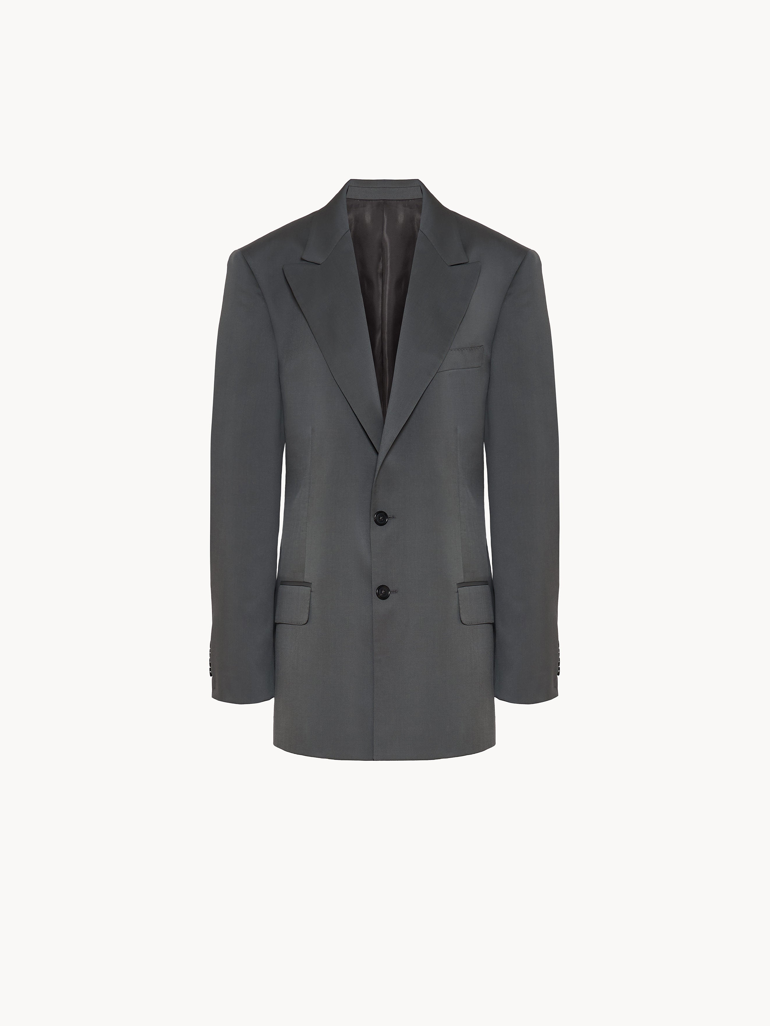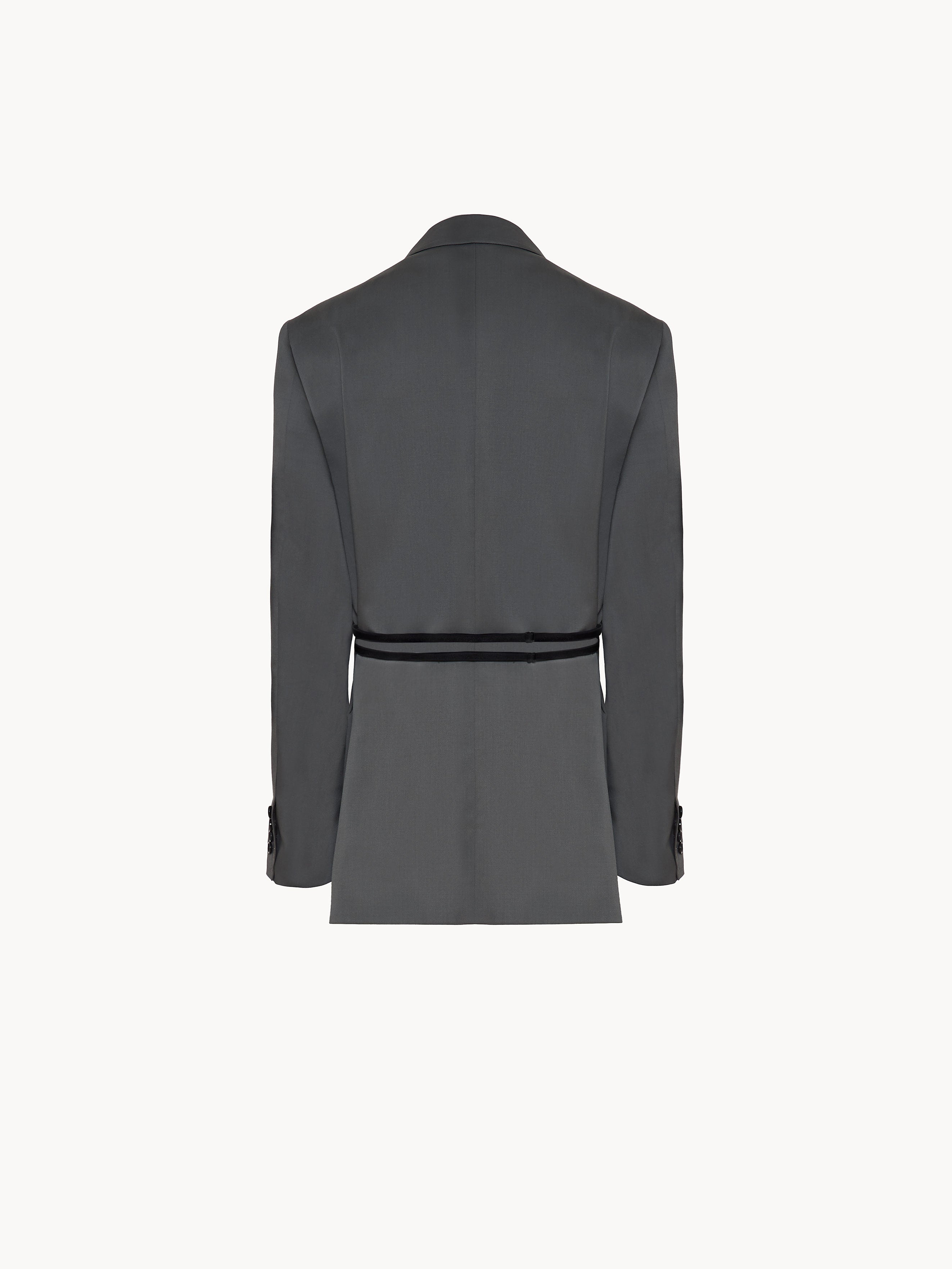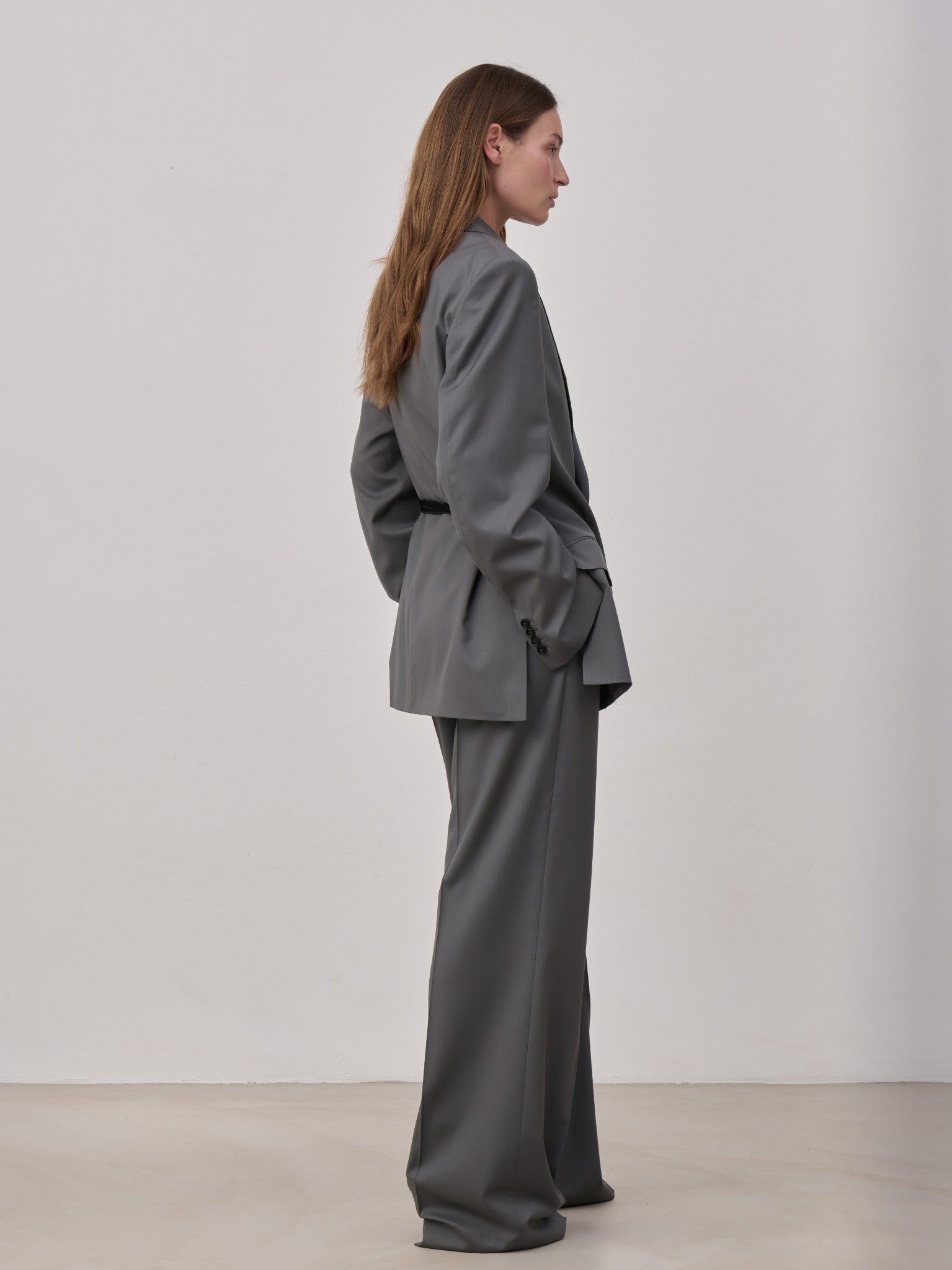 Tailored single-breasted menswear inspired jacket in light-weight virgin wool with peak lapel, chest pocket, front flap pockets, interior pockets and lateral back vent. Featuring two elastic straps that enhance the fit and allow for a more defined waistline, ideal for those seeking a sleek, feminine silhouette. 100% Virgin Wool. Lining 100% Cupro. Horn buttons. Made in Italy.