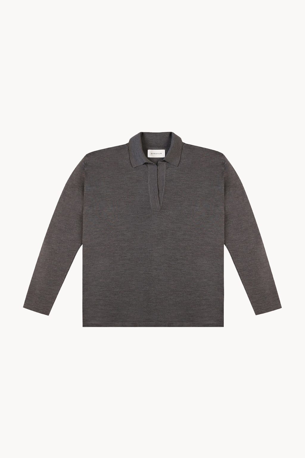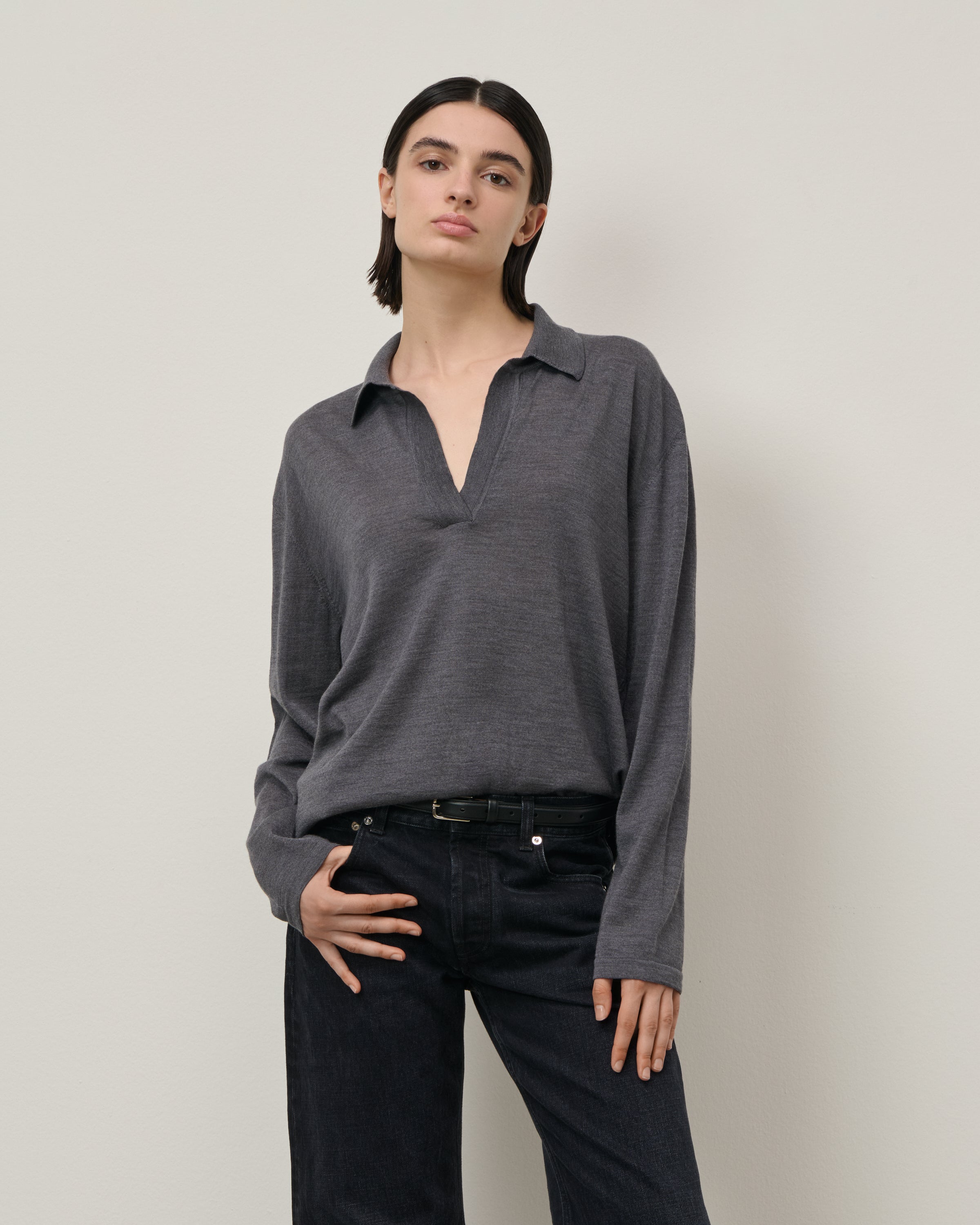 Menswear-inspired oversized polo top in merino wool knit with long sleeves.
