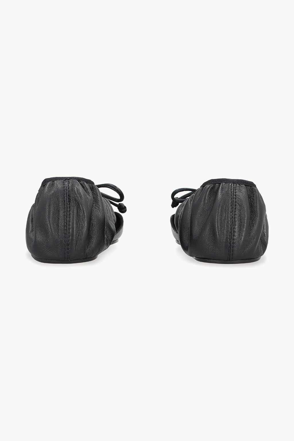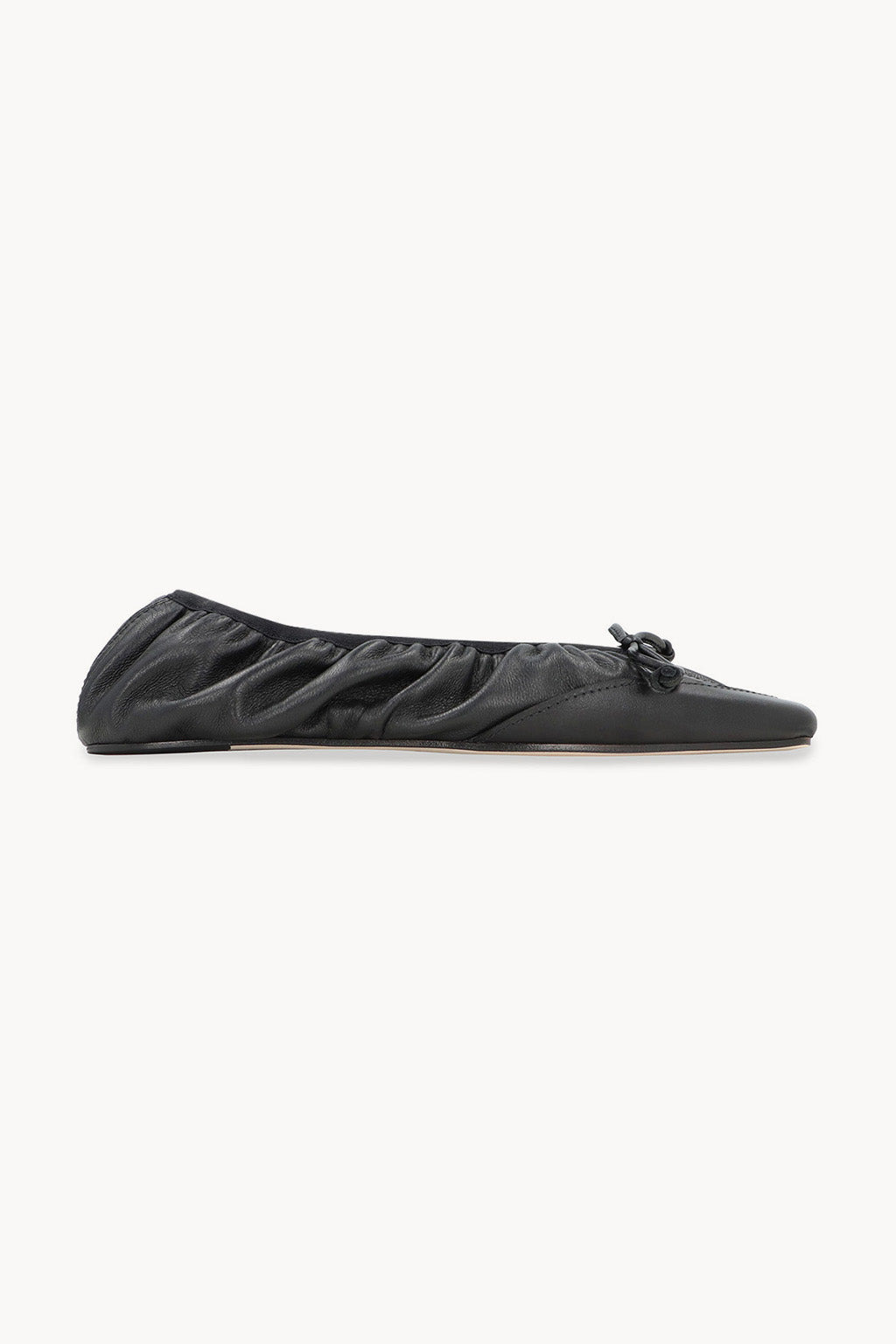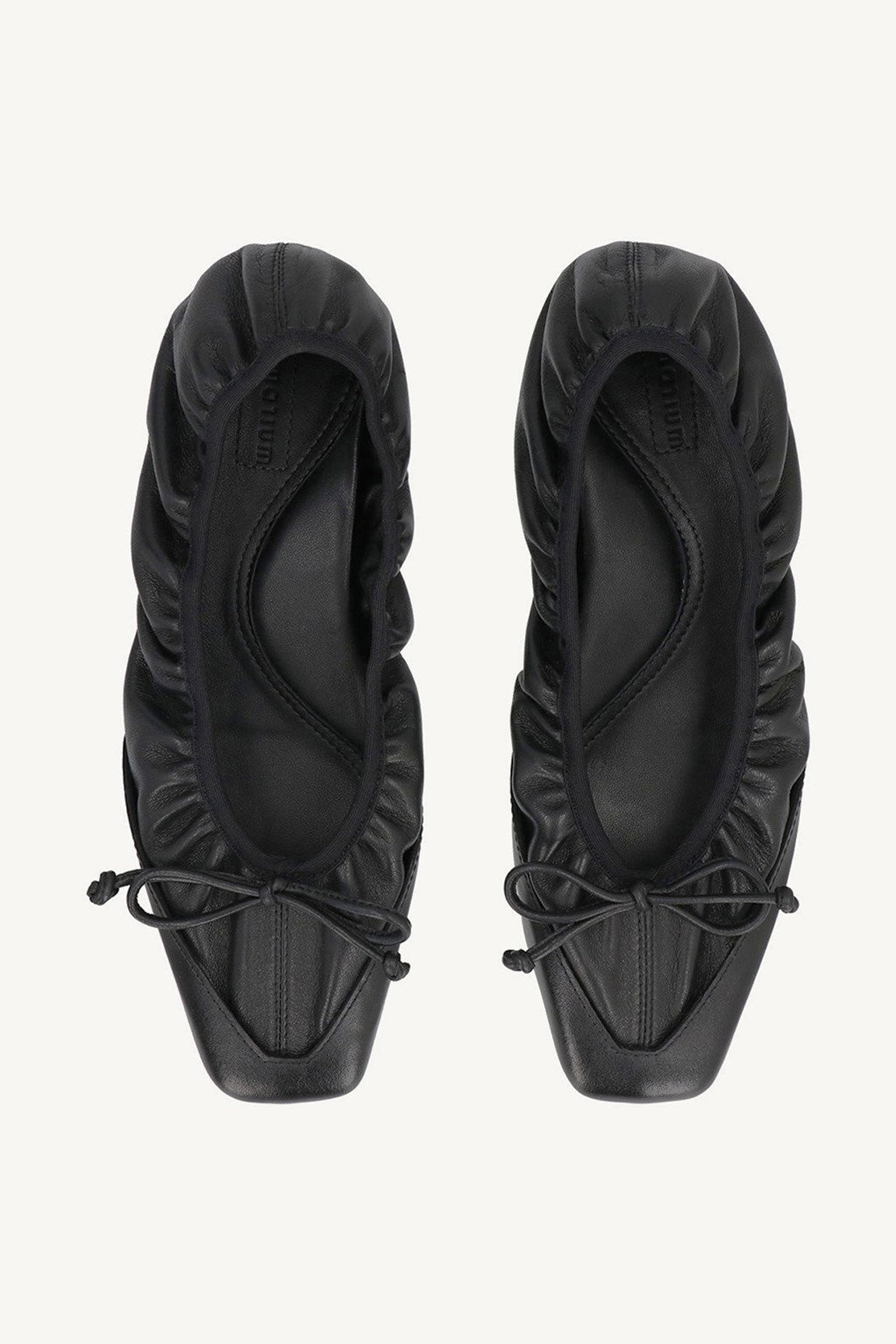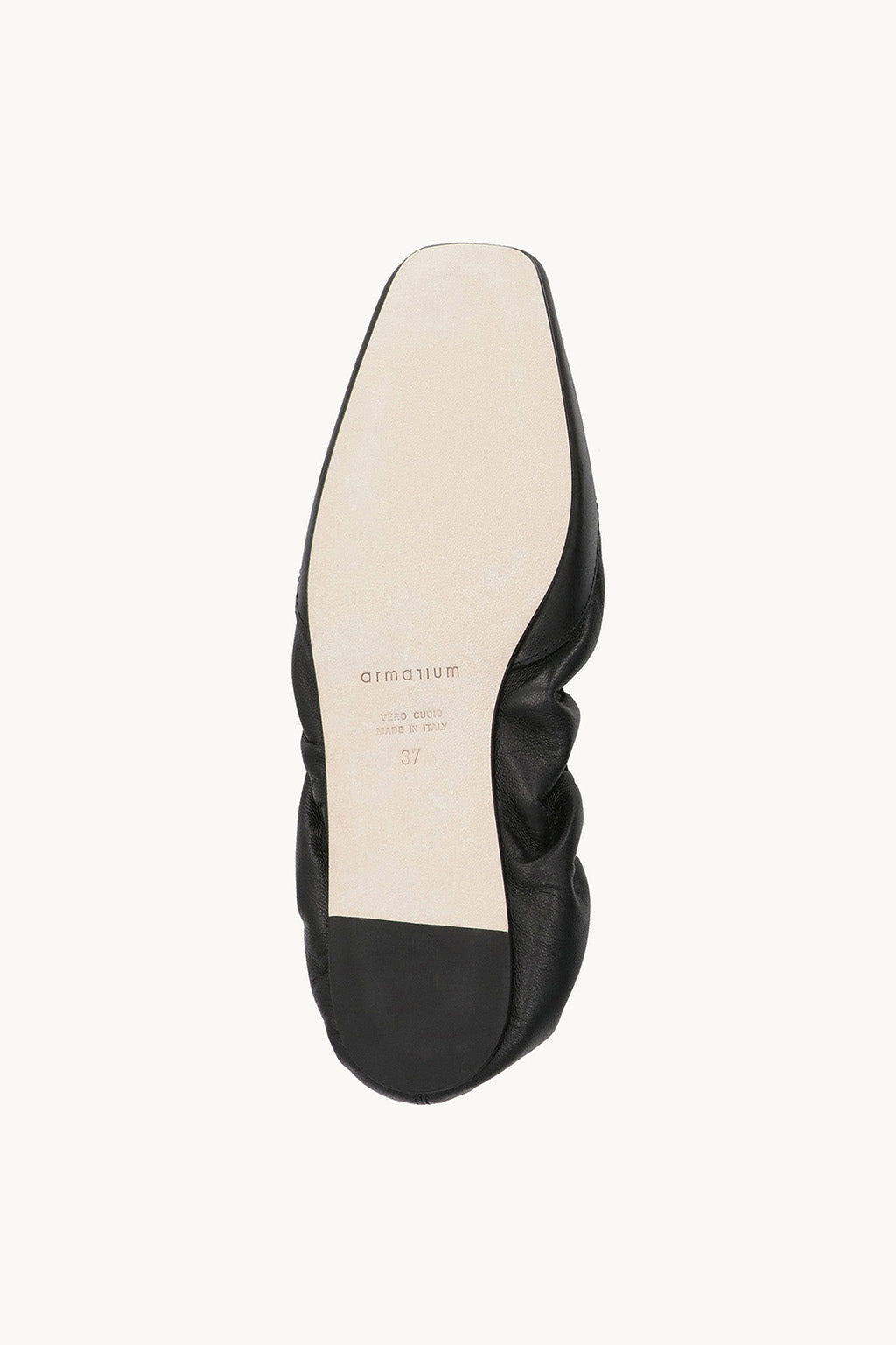 Ballerina with a squared toe made of soft nappa glove leather with delicate gathers. The toe is finished in fine calfskin, while the contrasting elastic facilitates the fit. Inside, the shoe has a footbed with a hidden 1 cm wedge, ensuring optimal comfort throughout the day. The sole, made of natural pumice leather, features a black straight milled welt, which gives to this ballerina shoe a refined and contemporary look.