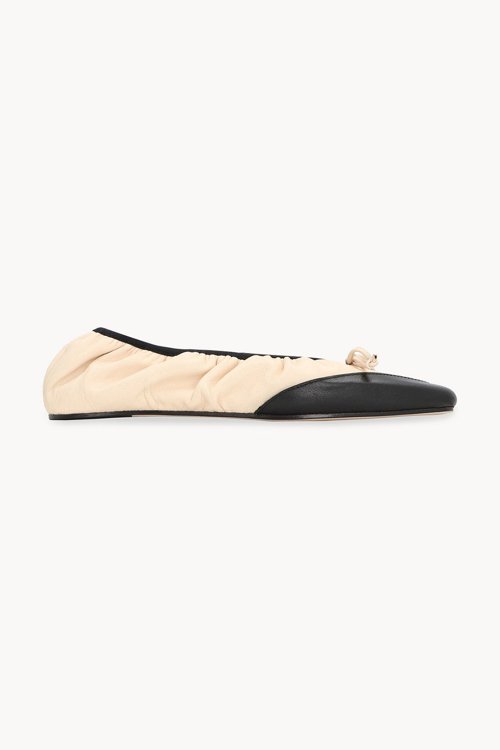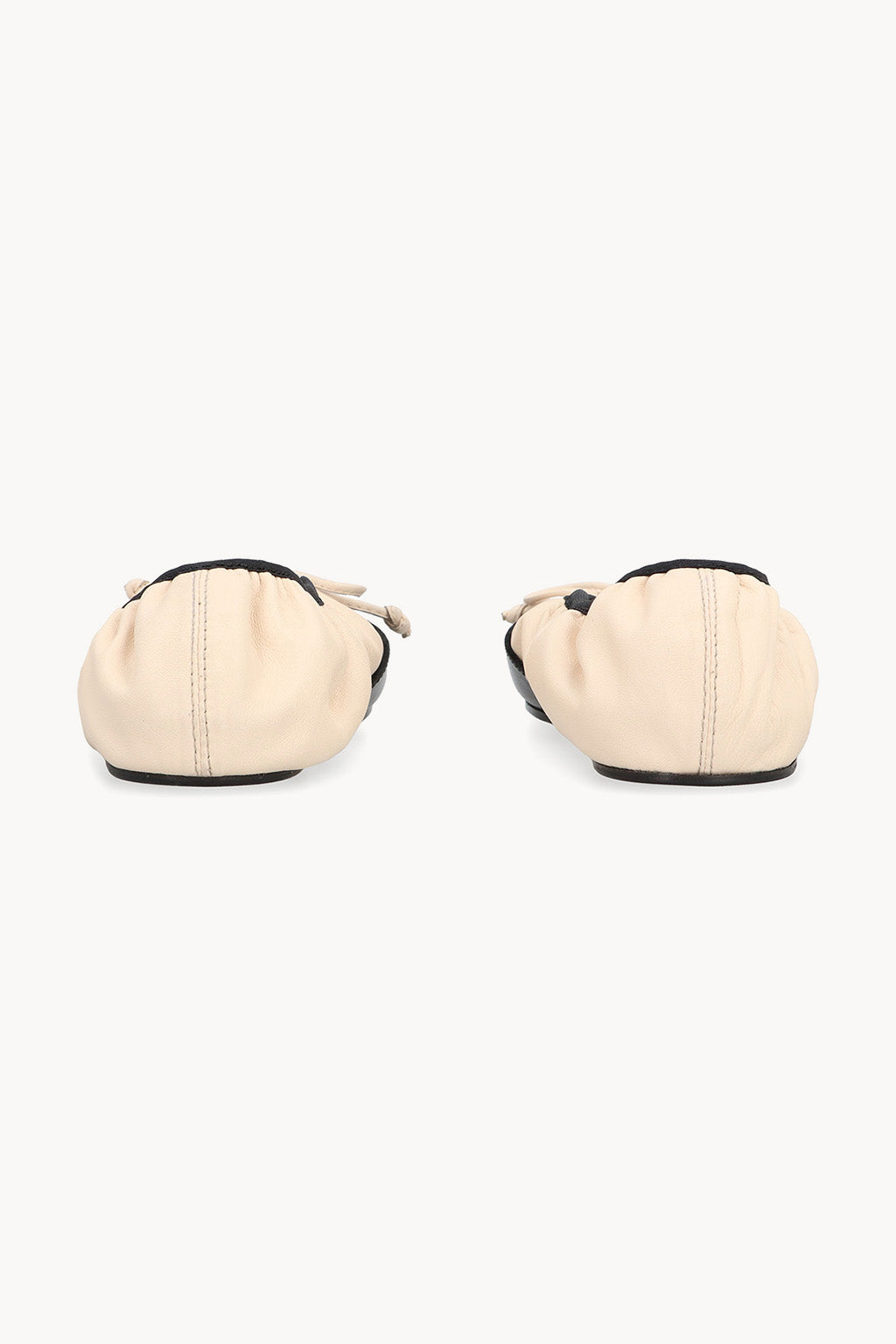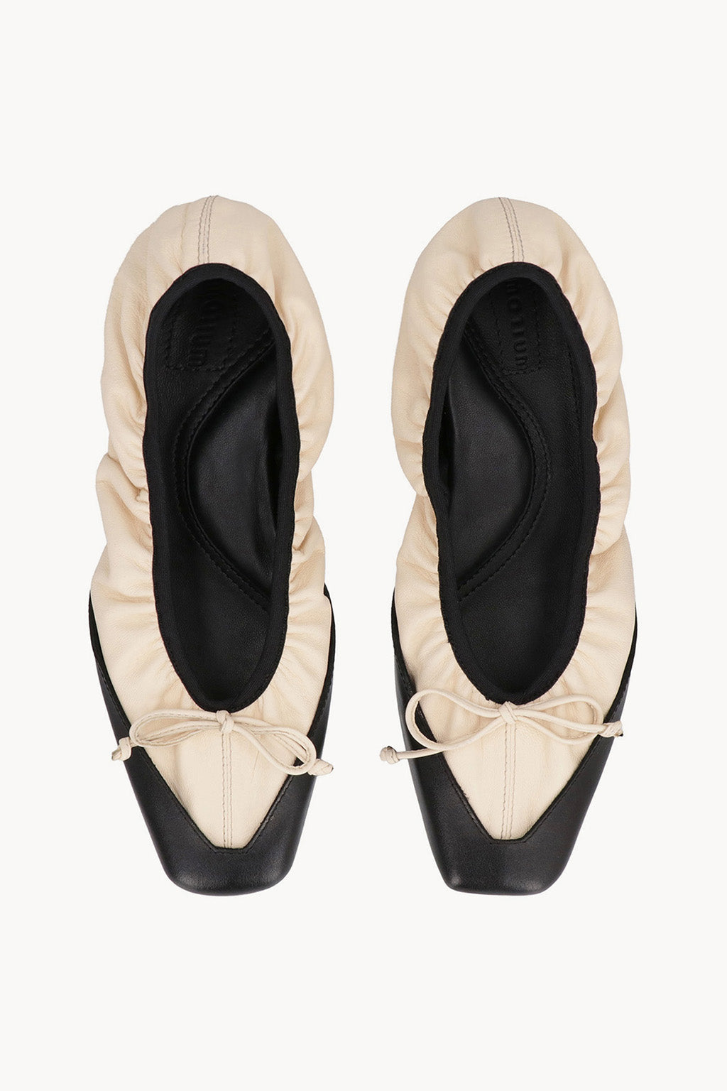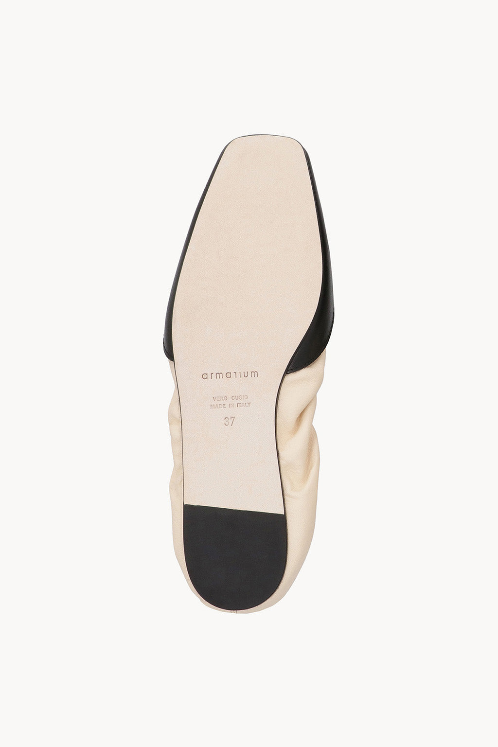 Ballerina with a squared toe made of soft nappa glove leather with delicate gathers. The toe is finished in fine calfskin, while the contrasting elastic facilitates the fit. Inside, the shoe has a footbed with a hidden 1 cm wedge, ensuring optimal comfort throughout the day. The sole, made of natural pumice leather, features a black straight milled welt, which gives to this ballerina shoe a refined and contemporary look.