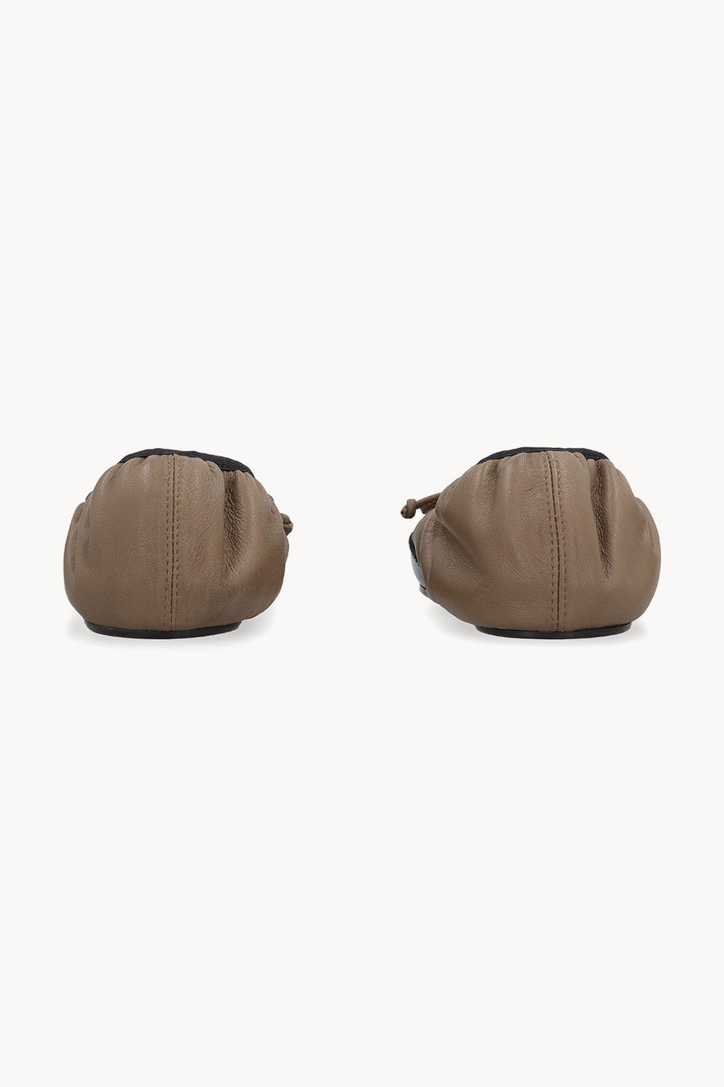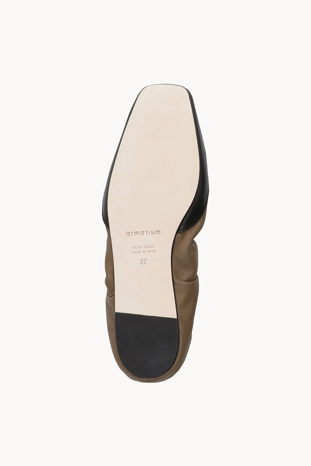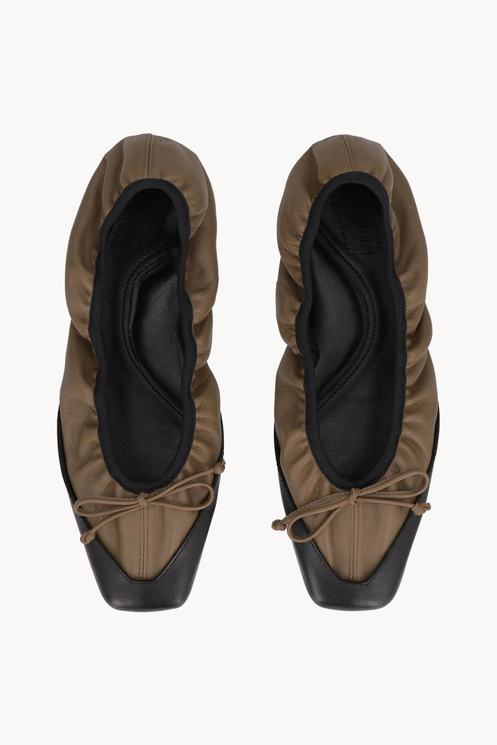 Ballerina with a squared toe made of soft nappa glove leather with delicate gathers. The toe is finished in fine calfskin, while the contrasting elastic facilitates the fit. Inside, the shoe has a footbed with a hidden 1 cm wedge, ensuring optimal comfort throughout the day. The sole, made of natural pumice leather, features a black straight milled welt, which gives to this ballerina shoe a refined and contemporary look.