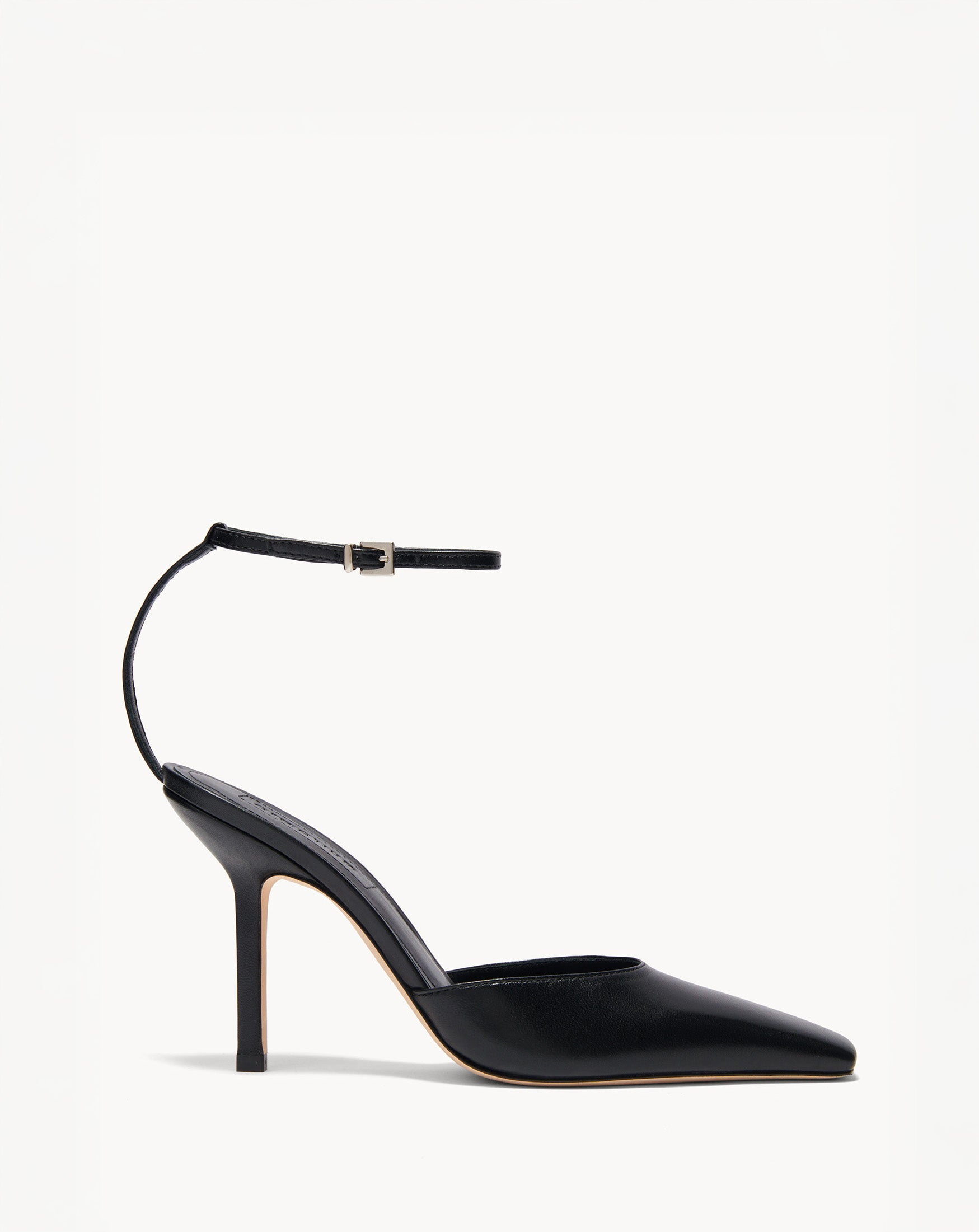The Carola pump offers a refined take on the classic D’Orsay silhouette, balancing softness and structure with effortless precision. Crafted in smooth Nappa leather, Carola is defined by its deep scooped neckline that frames the foot with subtle sensuality. The thin ankle strap, finished with a silver square buckle, adds a light, graphic detail while securing the fit with understated charm. With its sculpted cut and clean form, the Carola pump is designed to move elegantly from evening to event—quiet, poised, and distinctly modern. Made in Italy.
