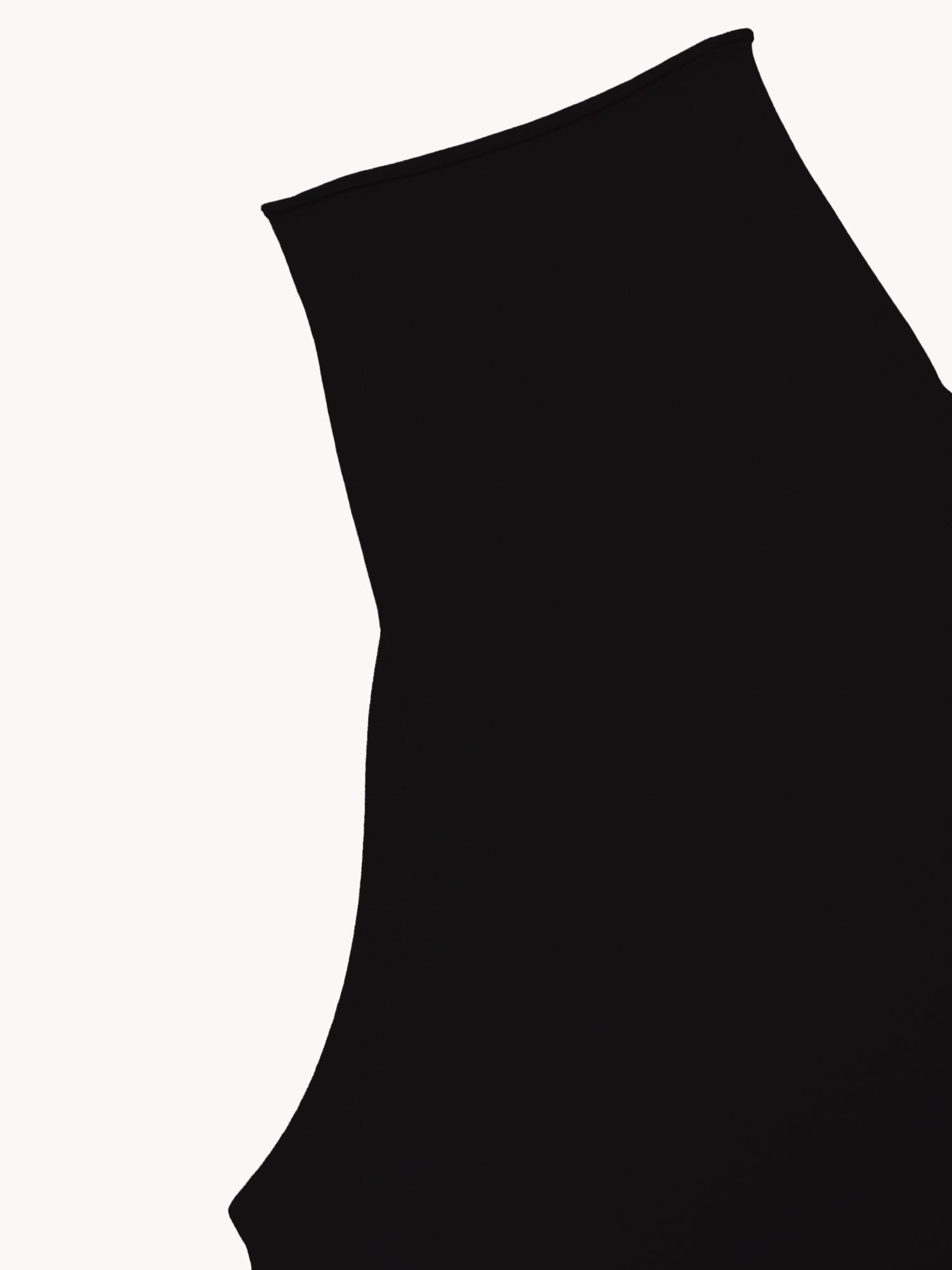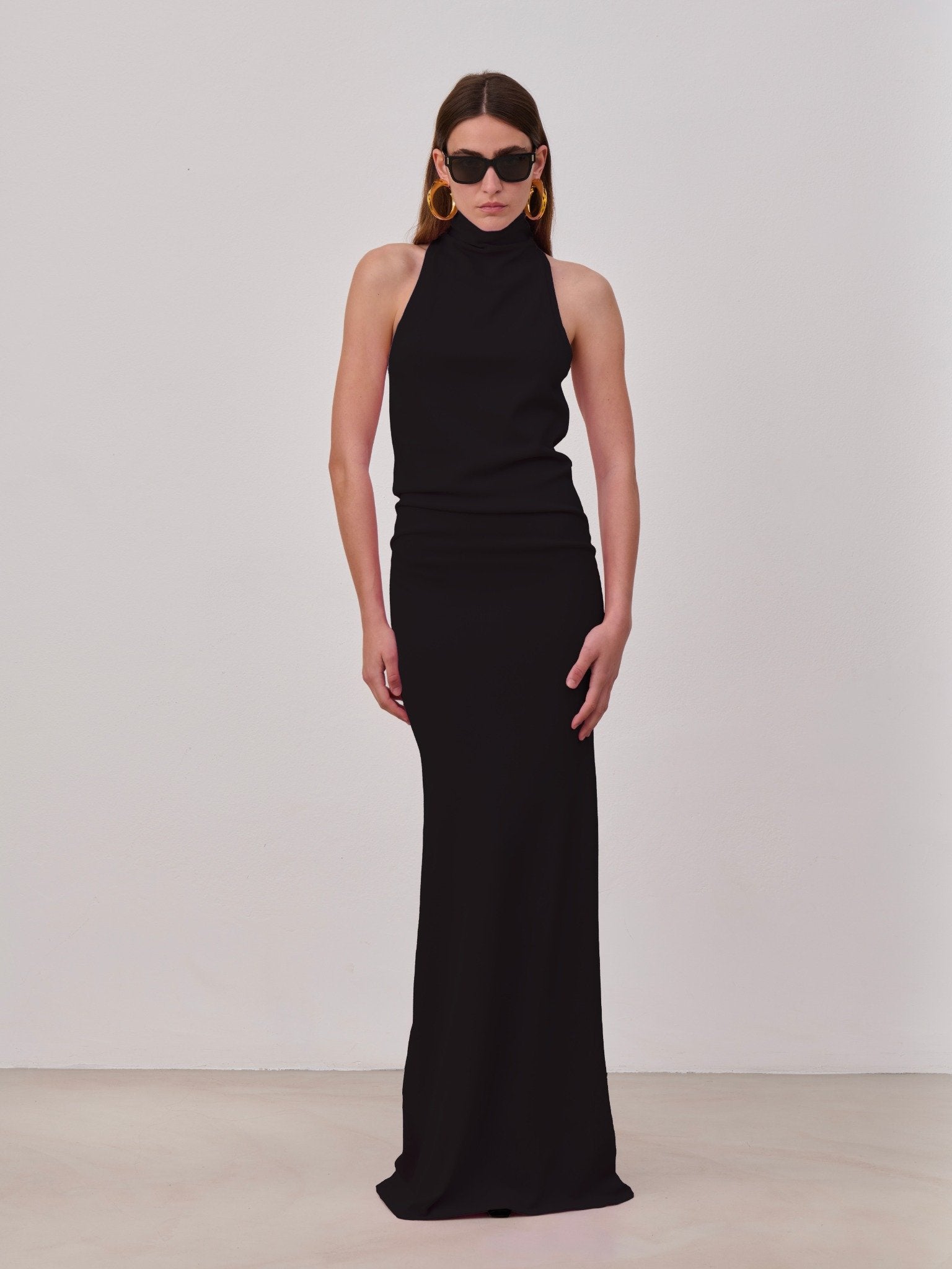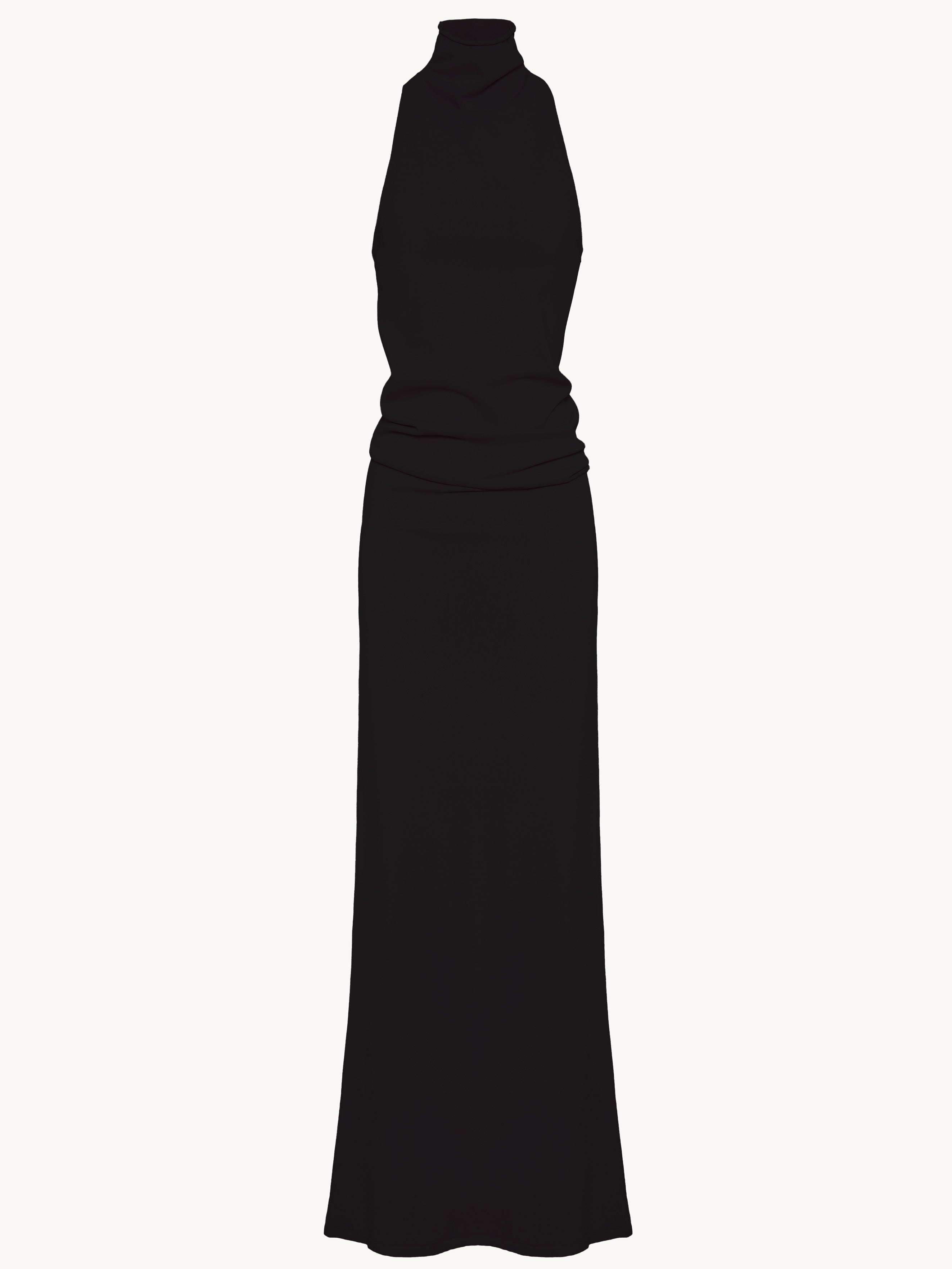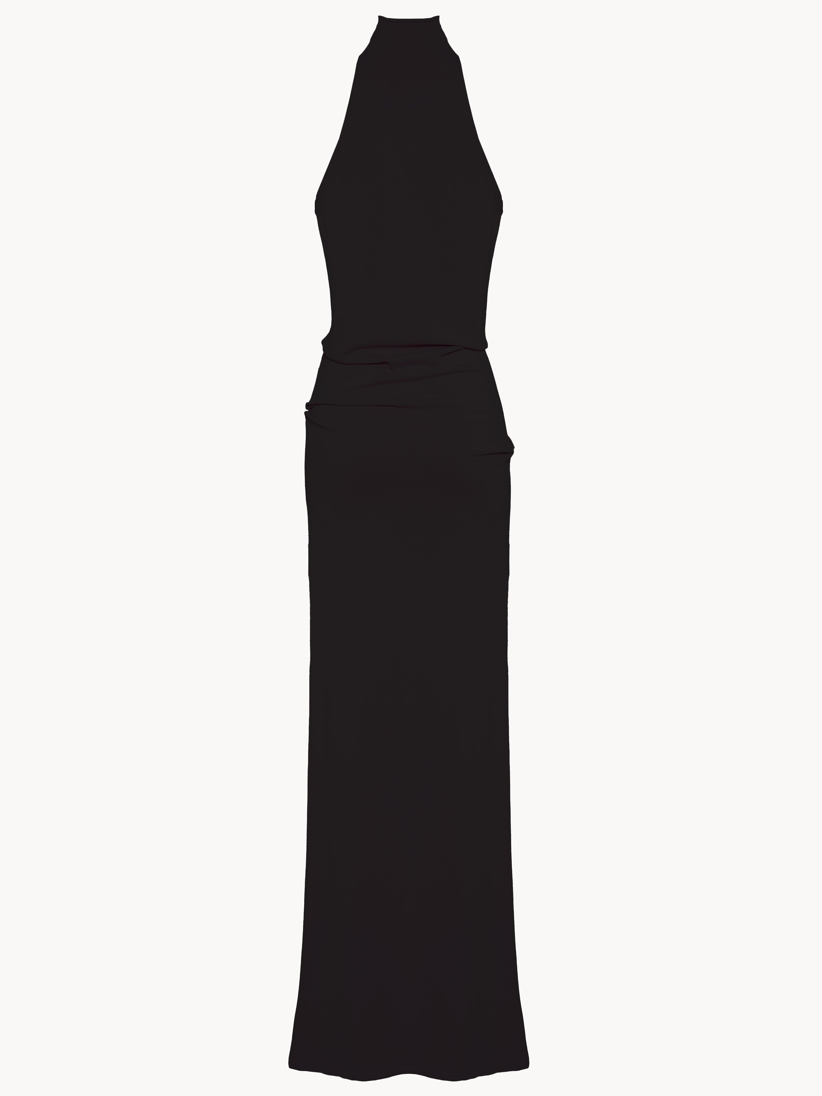 Long knit dress in viscose and nylon blend with a crater collar. Designed with a funnel shape, it hugs the hips while maintaining a relaxed fit on the upper part. Unlined. Made in Italy.