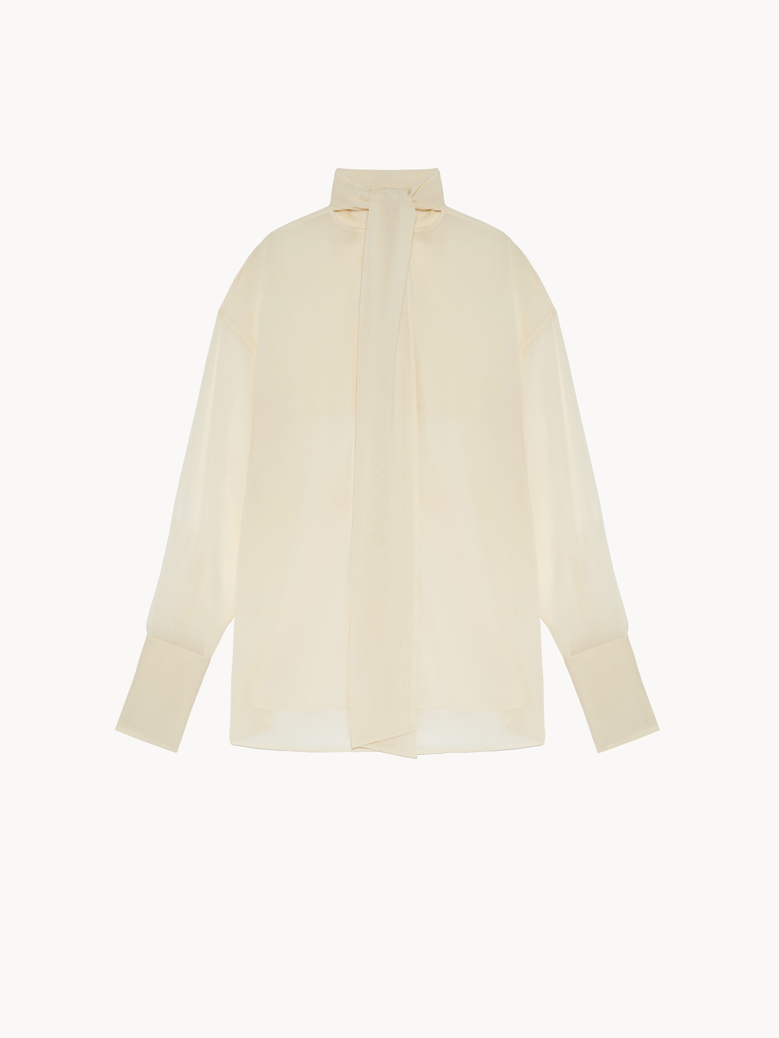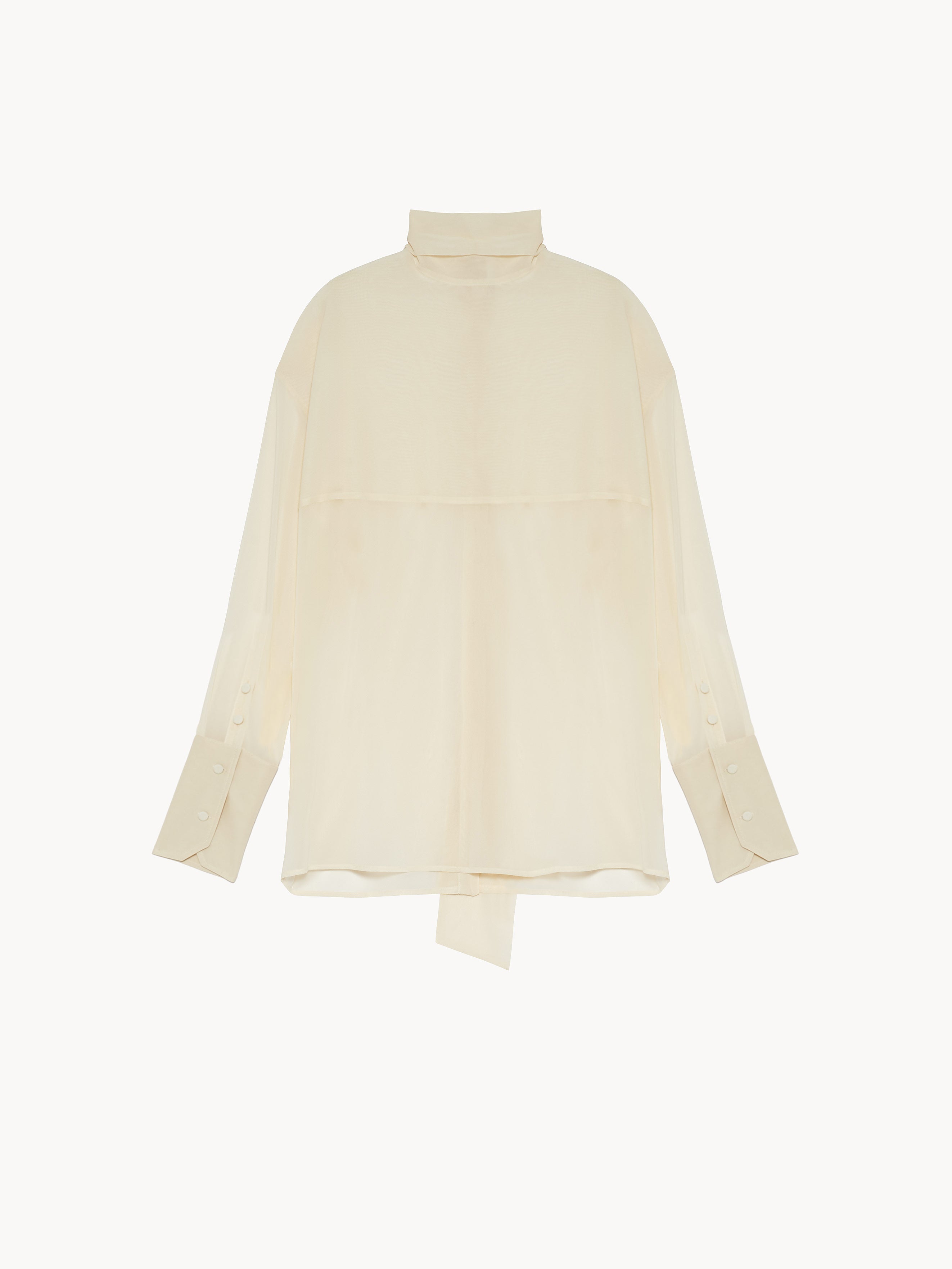 Relaxed fit shirt in silk georgette featuring a reverse construction with an exposed back button closure adorned with covered buttons and classic hem finish. The front is defined by a yoke cut, while the back is enhanced by a scarf detail that allows for versatile styling. Covered buttons in silk. Unlined. Made in Italy.