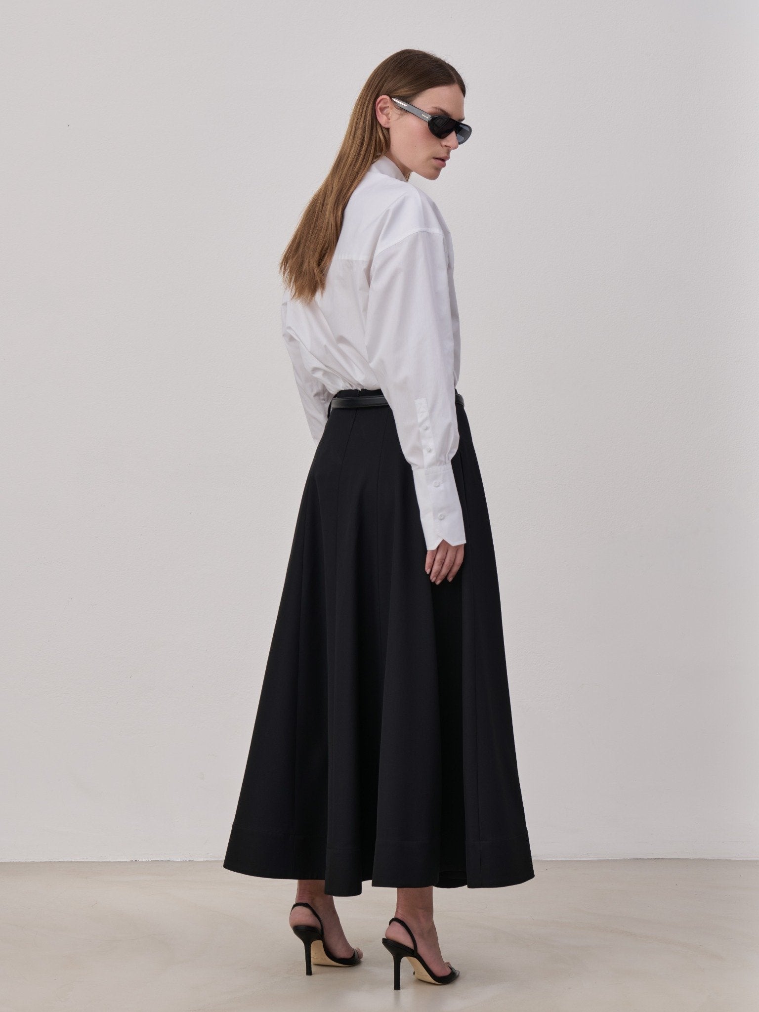Long skirt in virgin wool featuring a full volume, reinforced hem, belt loops and invisible zip at the center back. 100% Virgin Wool. Unlined. Made in Italy.