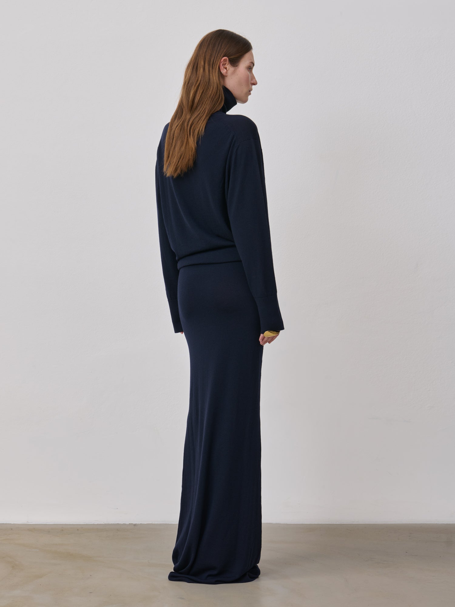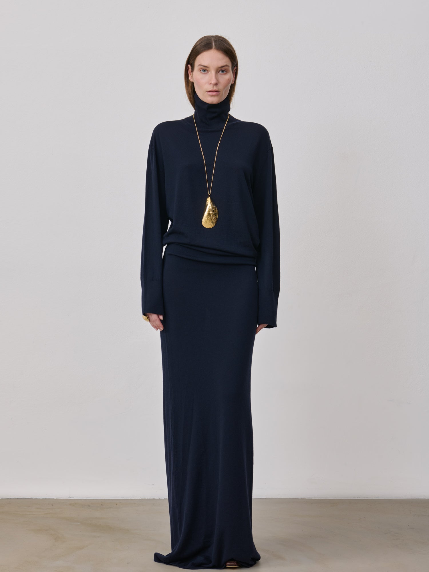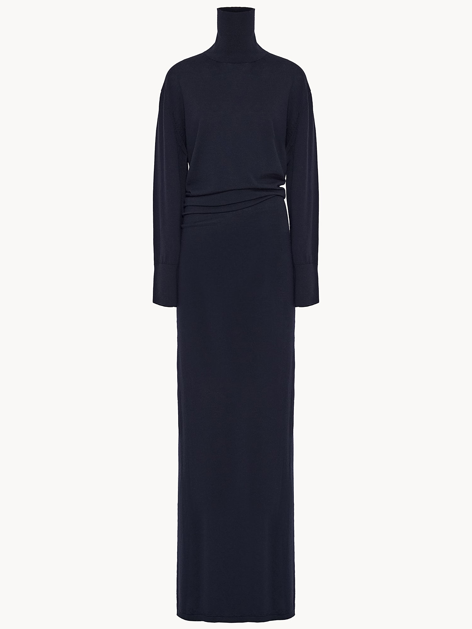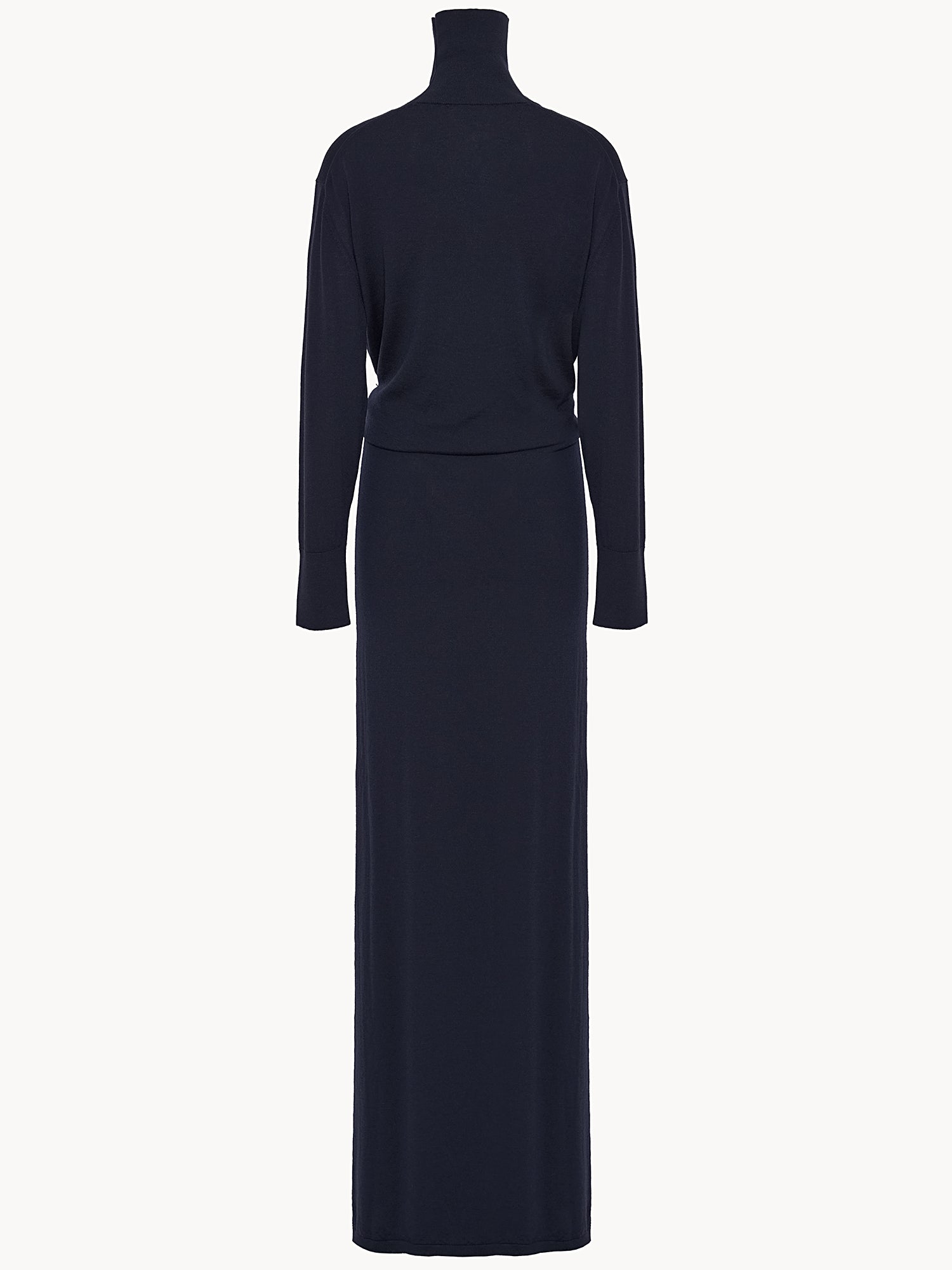 Long merino and cashmere knit dress with a high standing neckline. Designed with a funnel shape, it hugs the hips while maintaining a relaxed fit on the upper part. 90% Ultrafine Merino Wool, 10% Cashmere. Made in Italy.