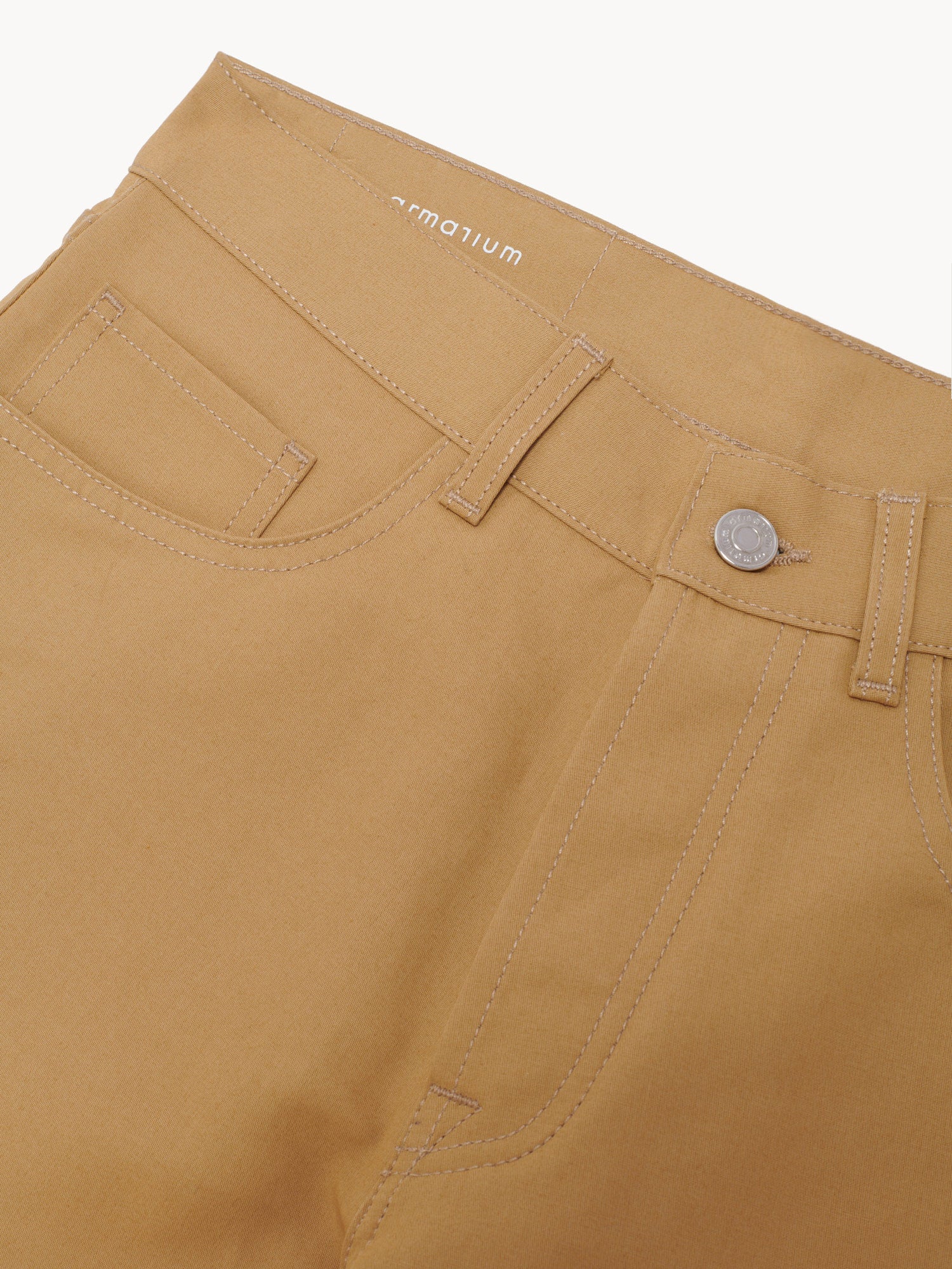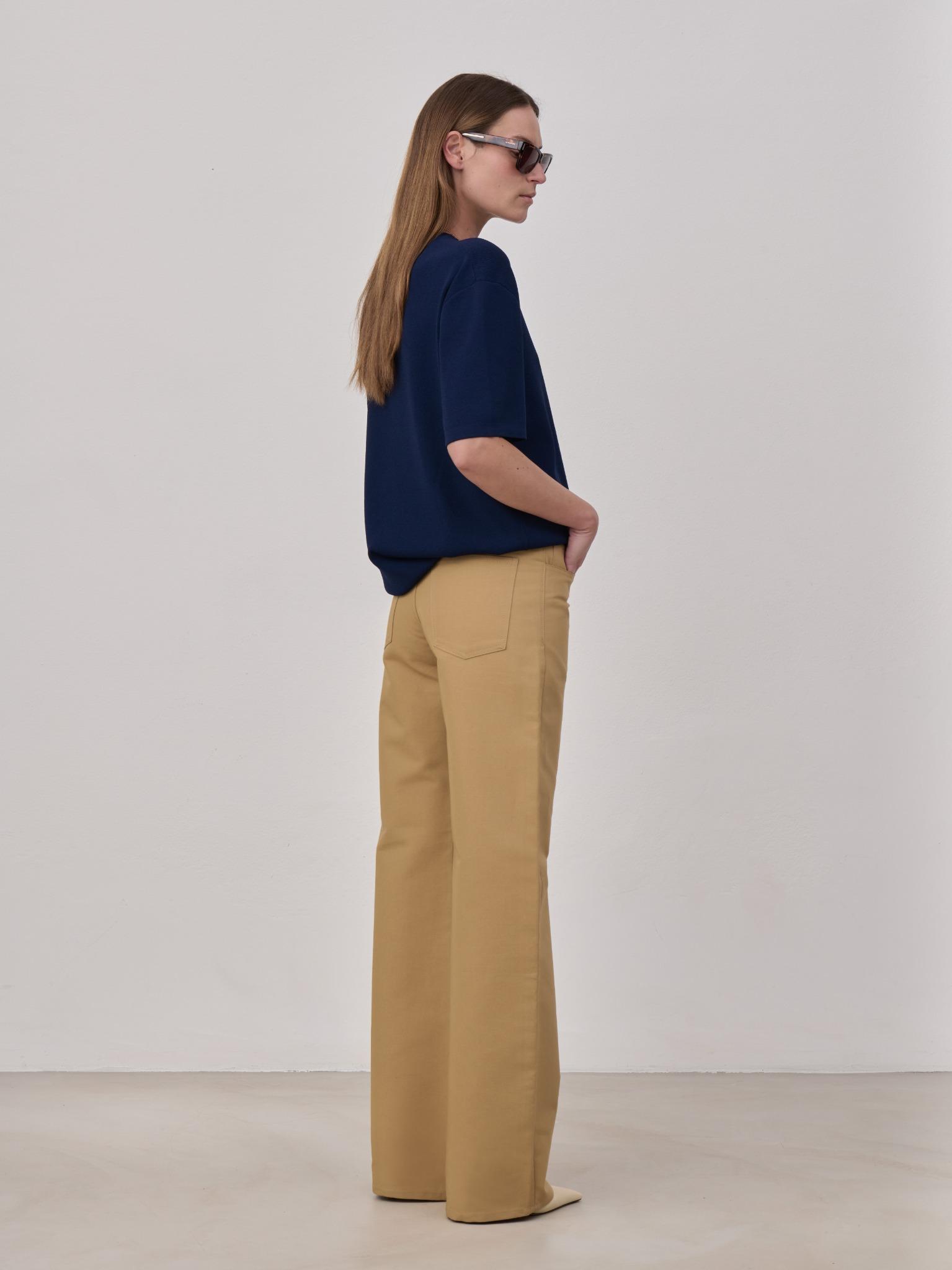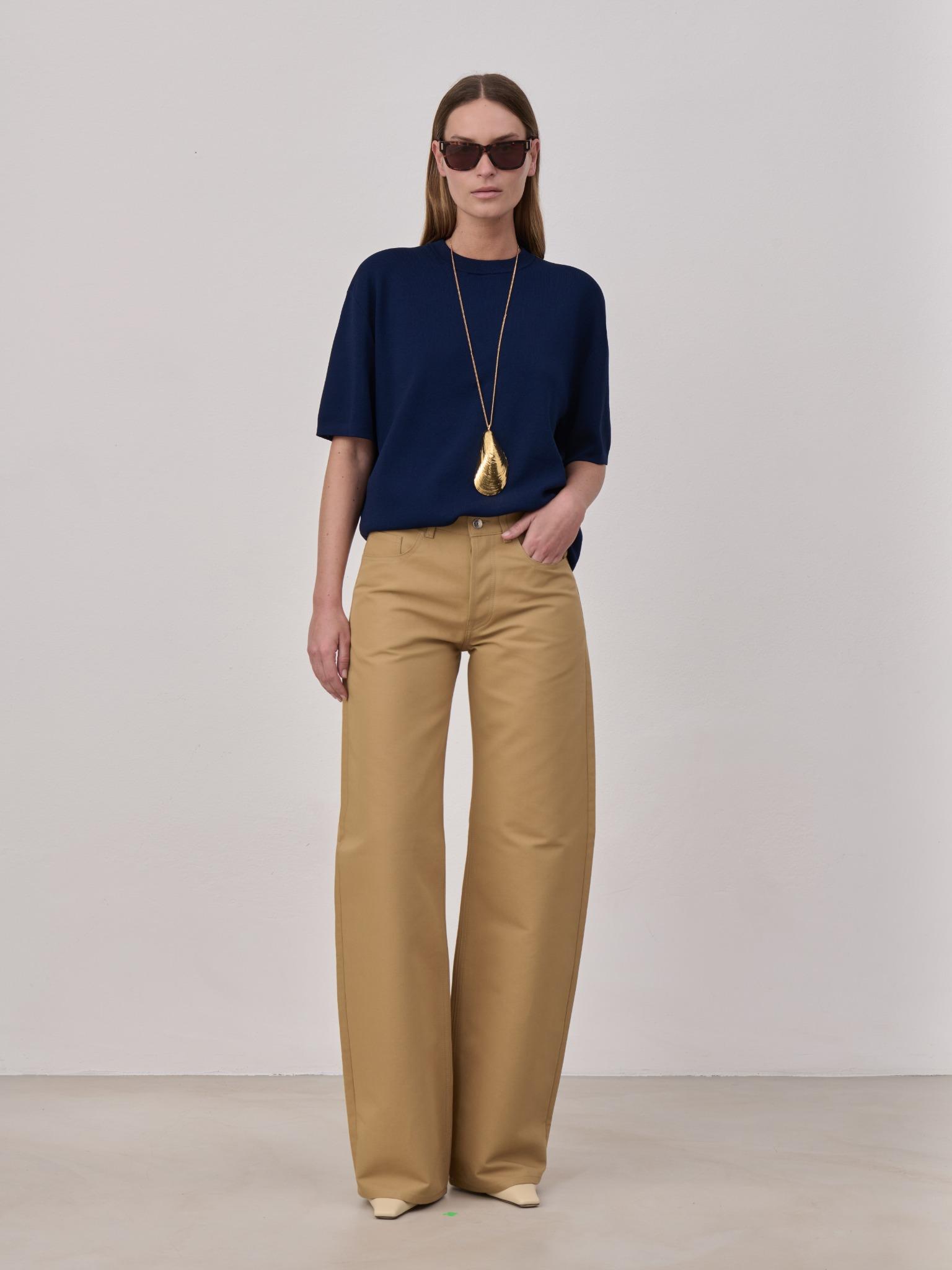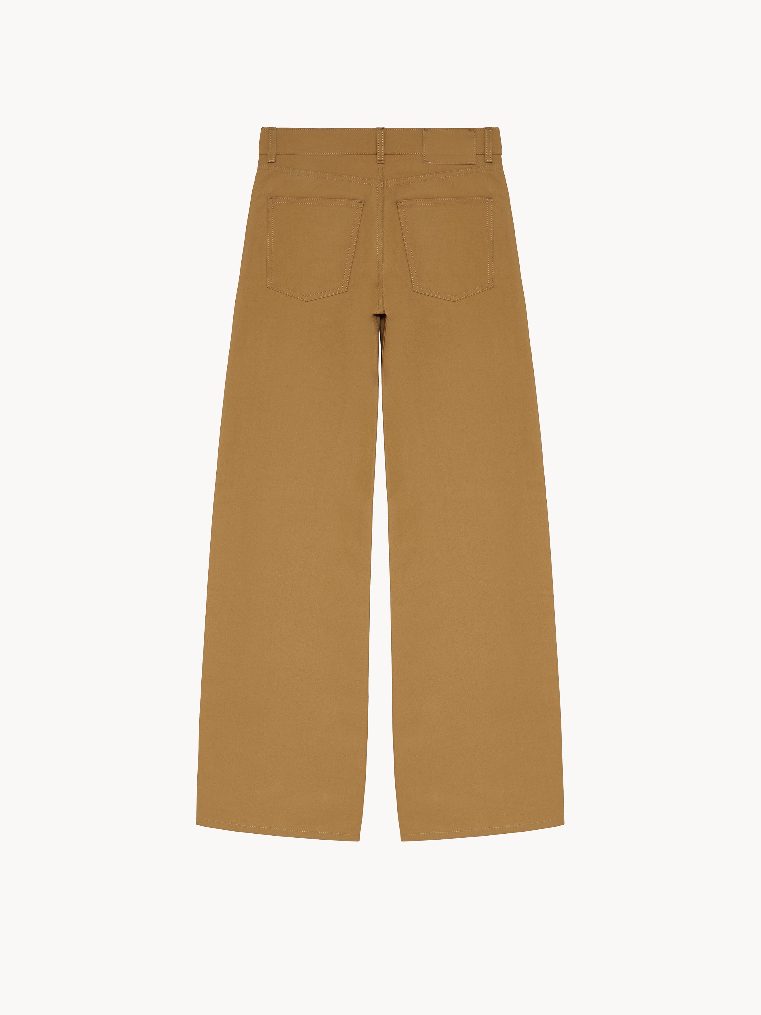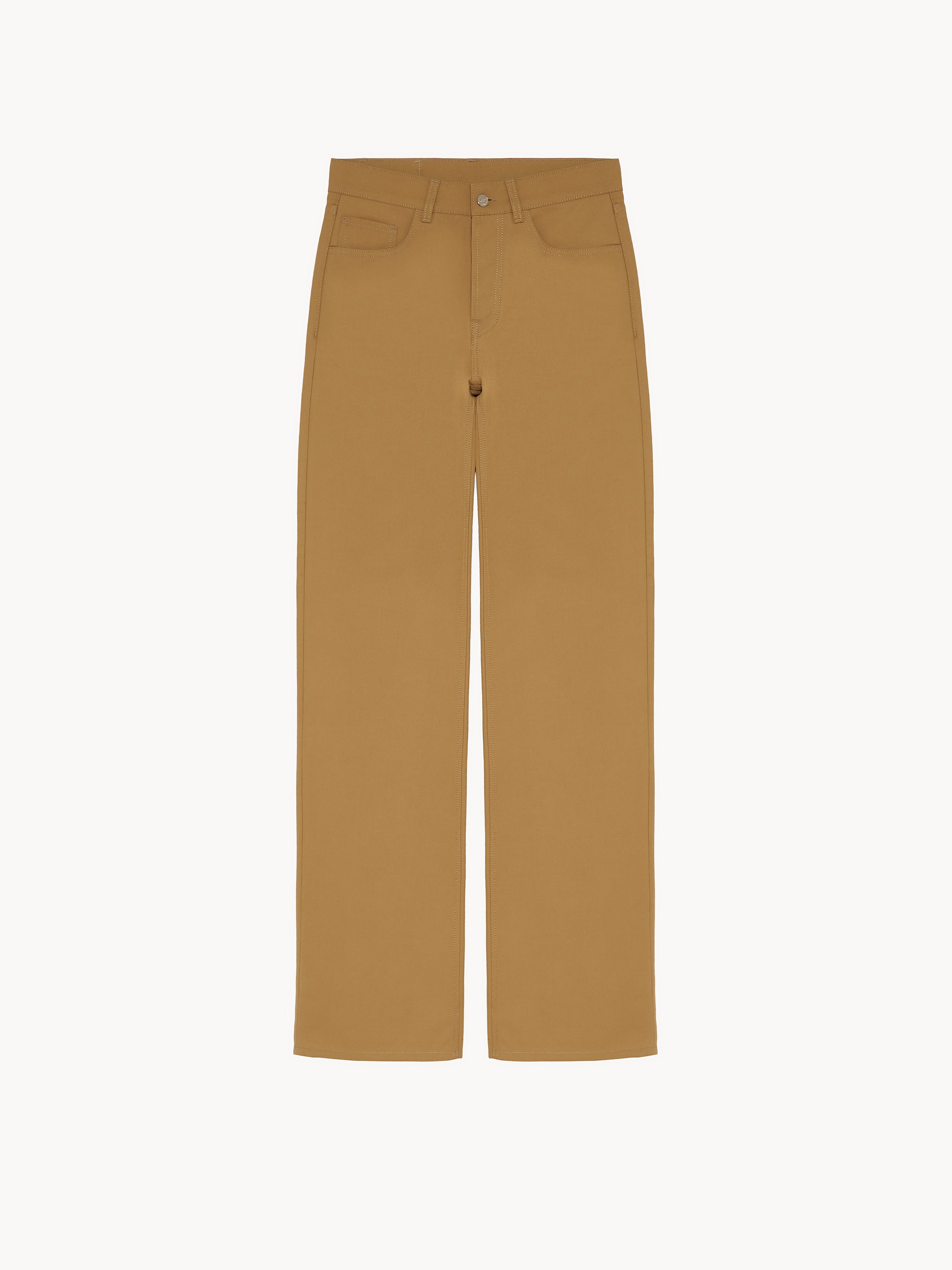 Low-rise extra long pant in cotton, relaxed fit with traditional 5 pocket styling. Metal buttons. Made in Italy