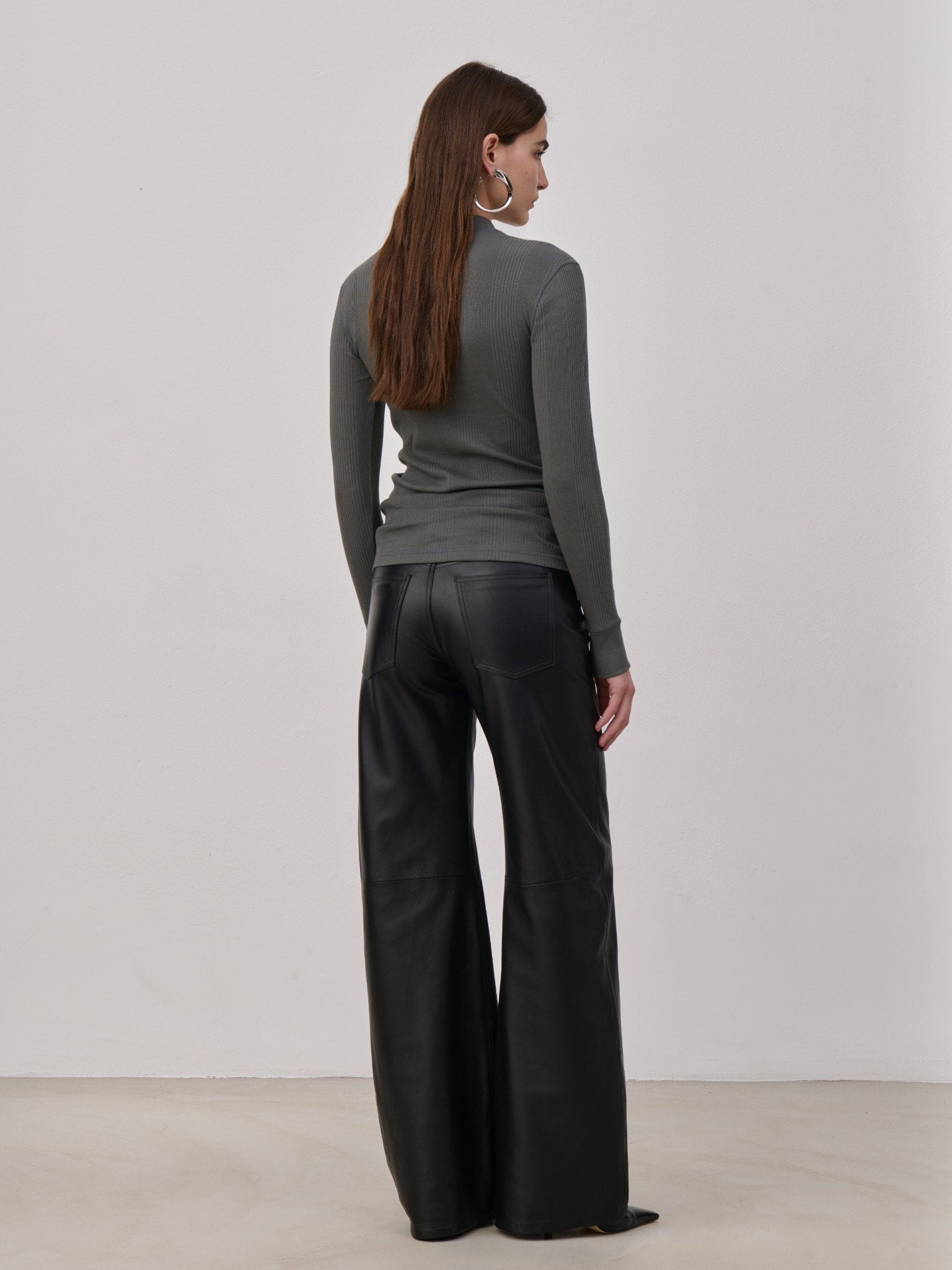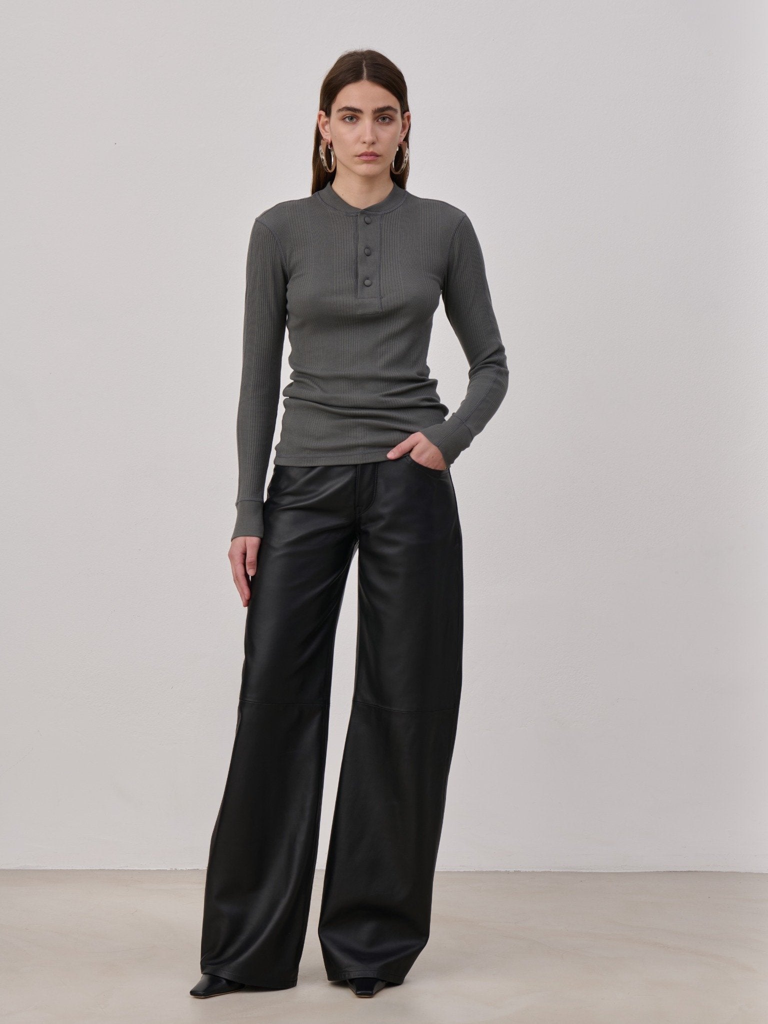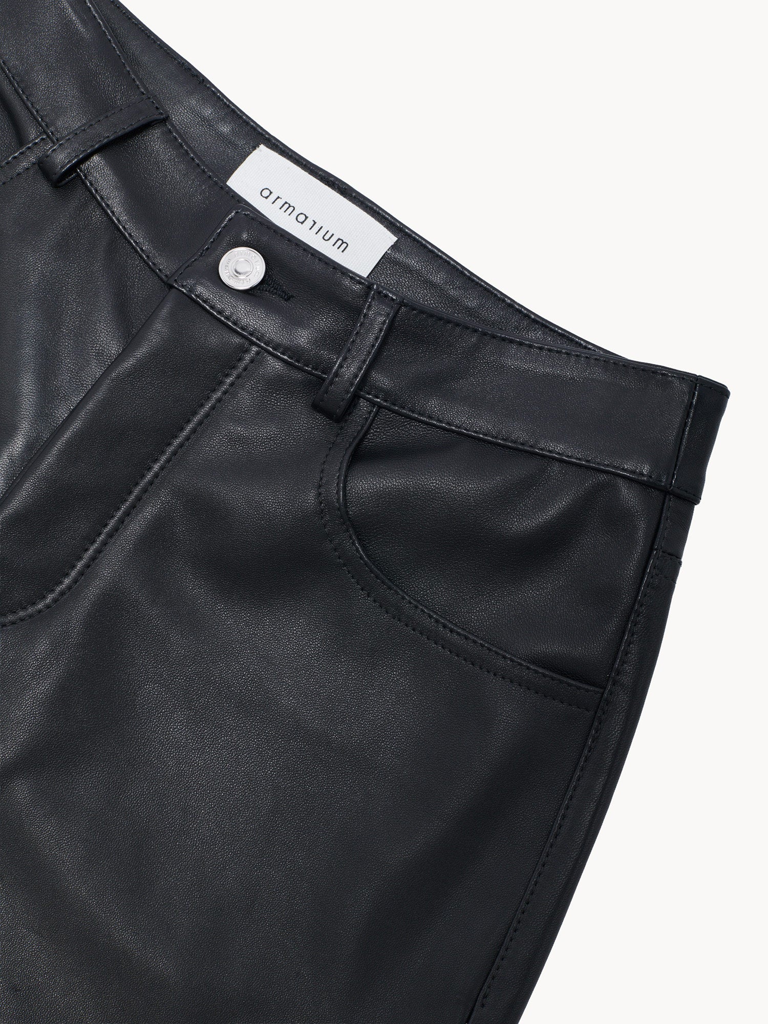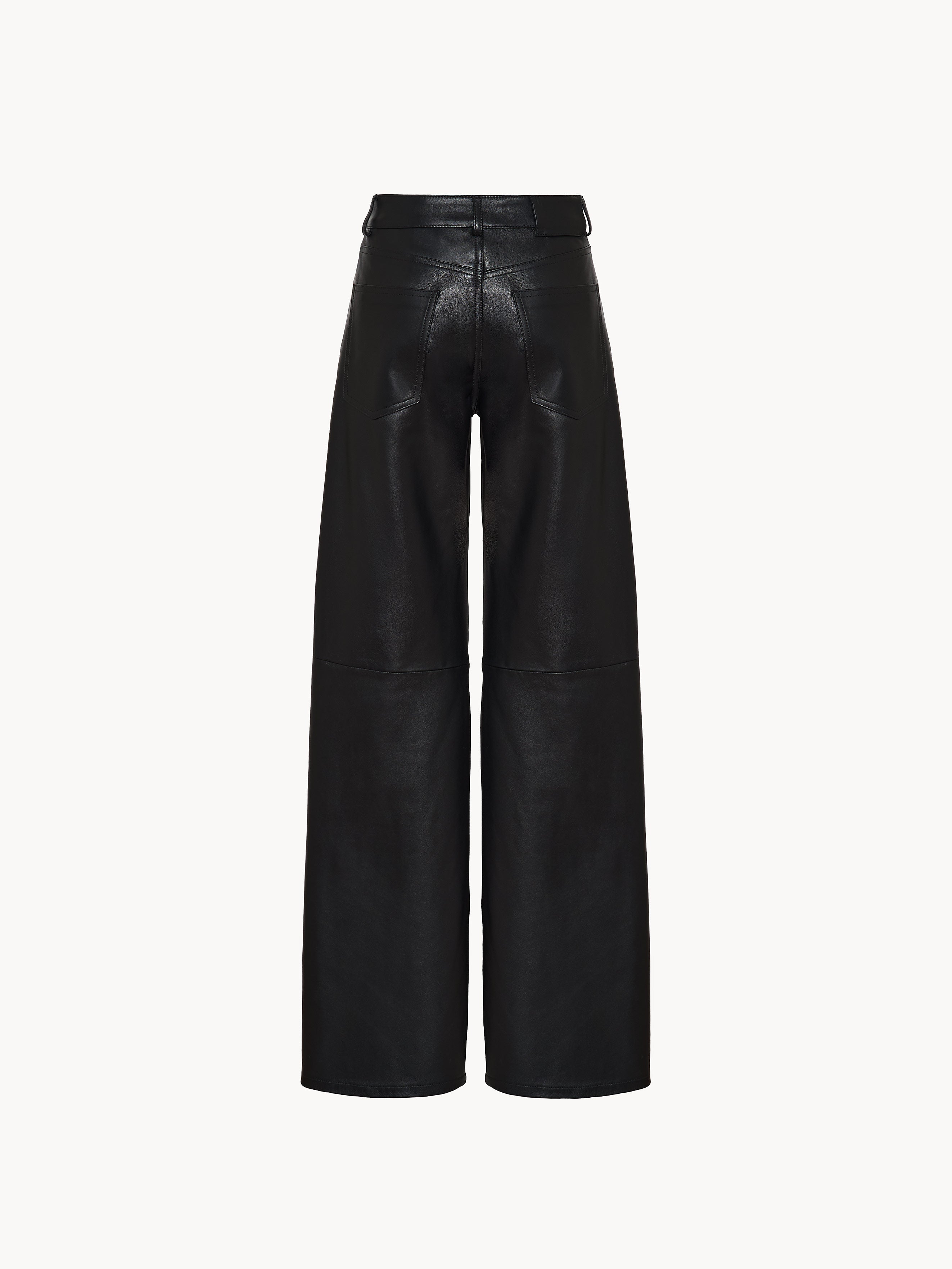 Low rise pant in nappa lambskin leather, relaxed fit with traditional 5 pocket styling. 100% Nappa Lambskin. Alf lining 100% Cupro. Metal buttons. Made in Italy.