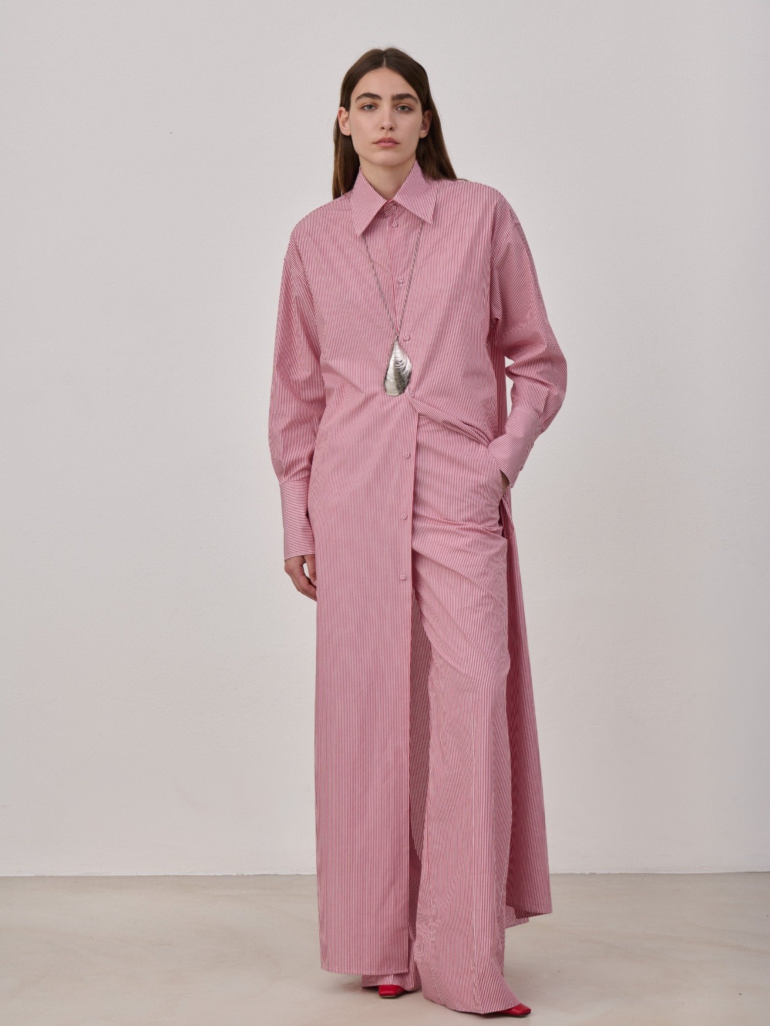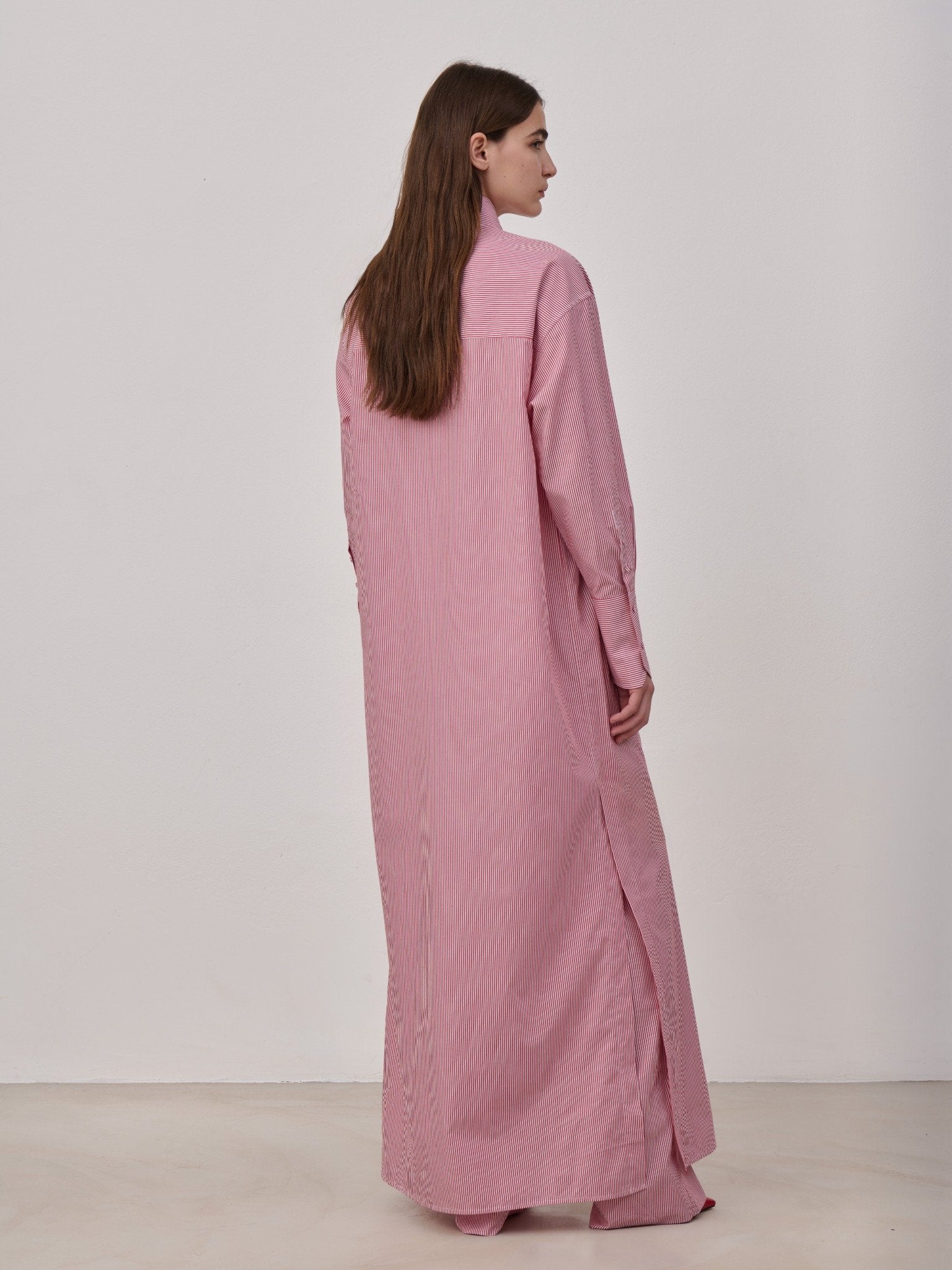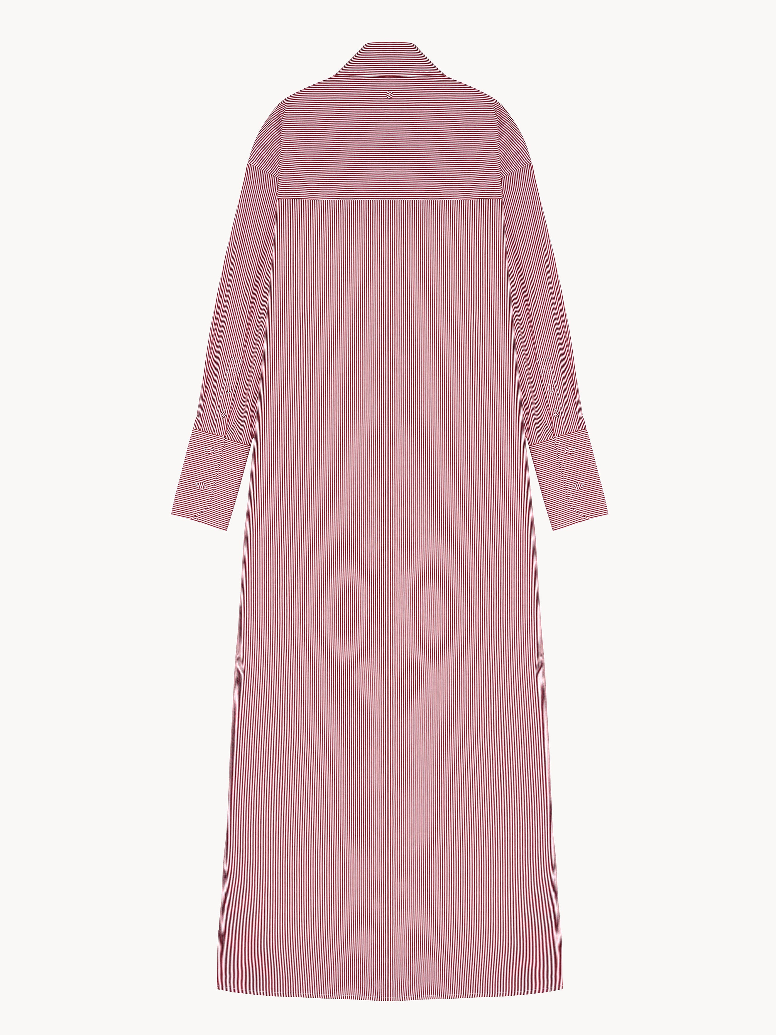 Oversized menswear-inspired button up shirt dress in cotton popeline with exposed front button placket and classic hem finish, characterized by an exposed collar stay channel with collar stays in palladium pleated brass. Covered buttons in cotton. Made in Italy.