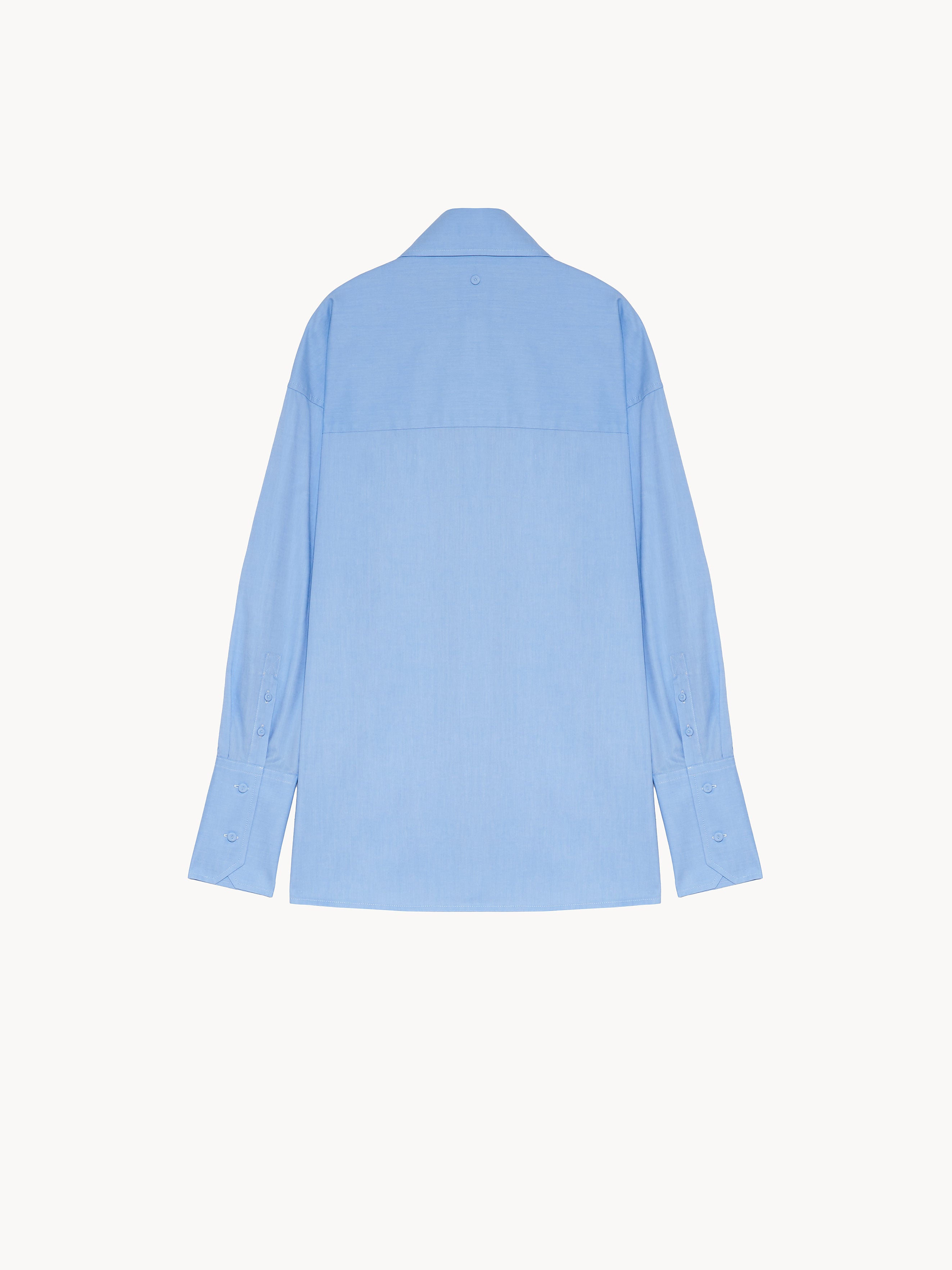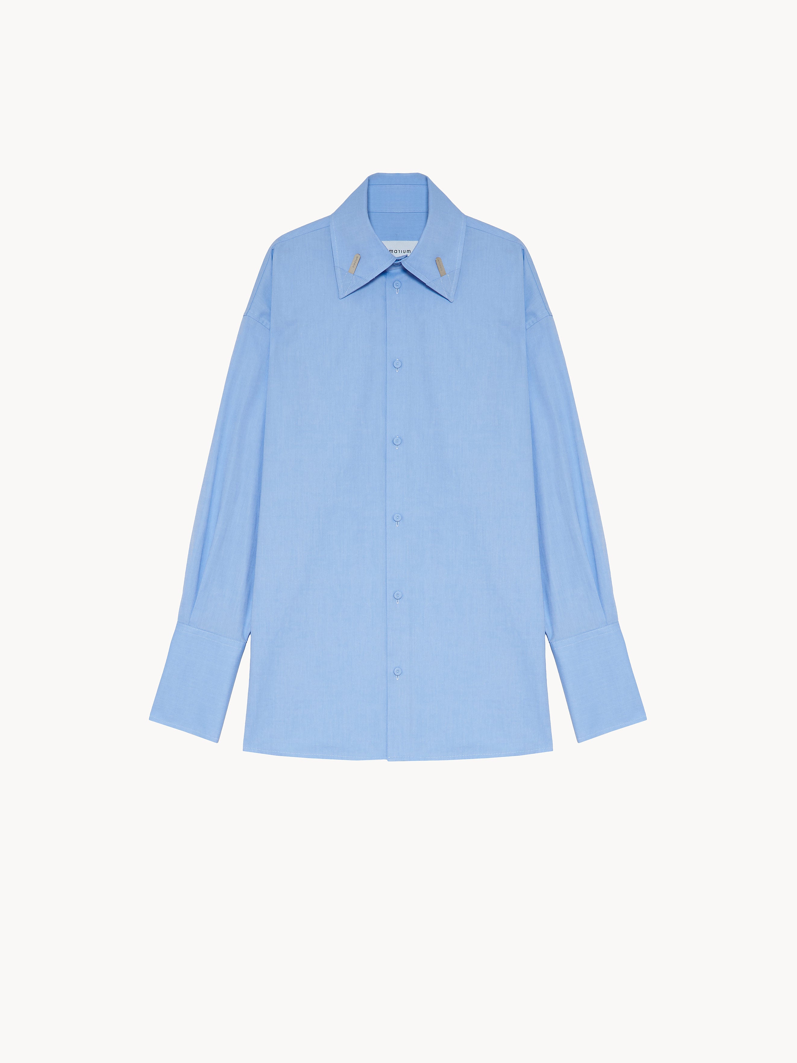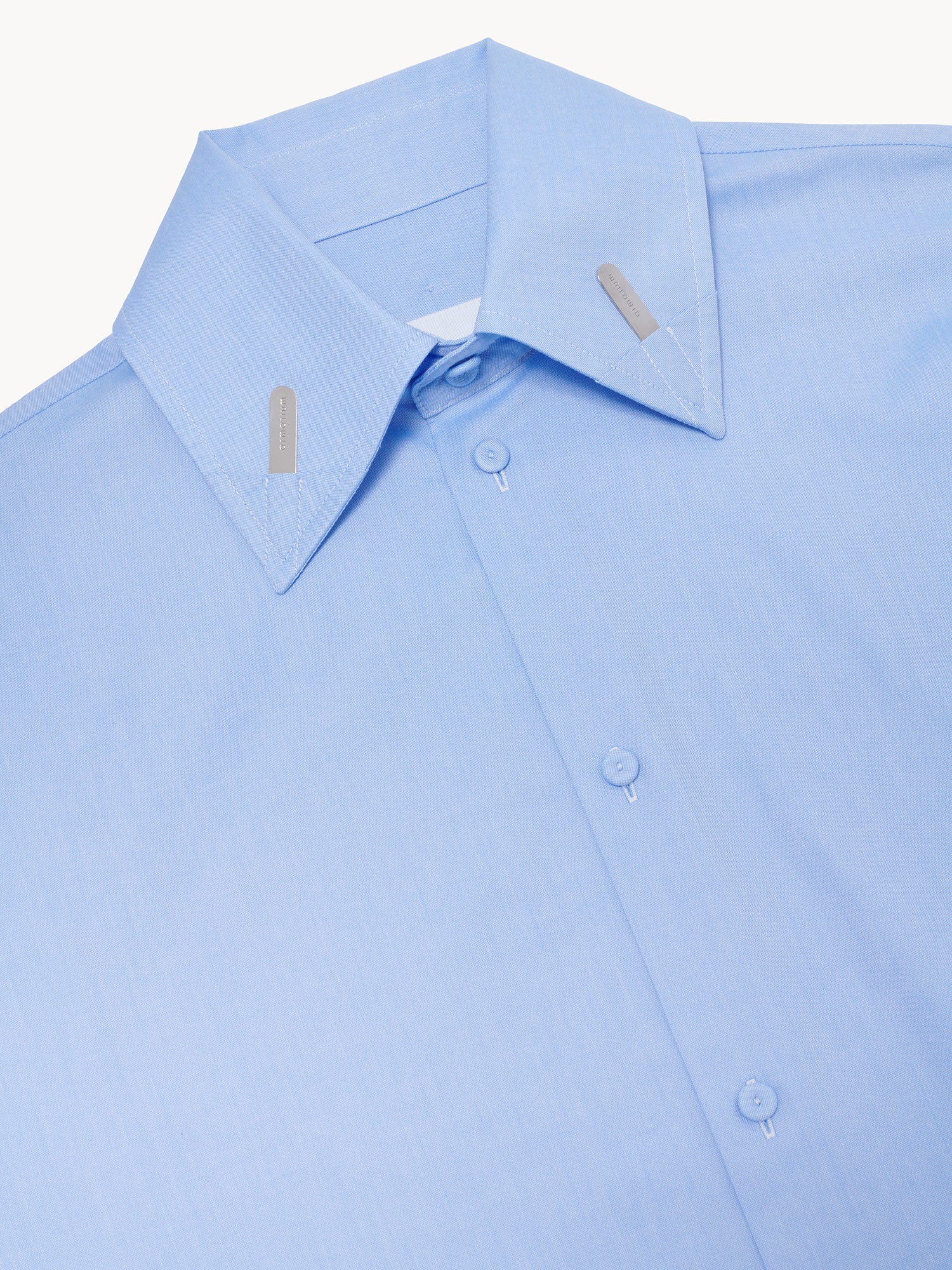 Oversized menswear-inspired button up shirt in cotton popeline with exposed front button placket and classic hem finish, characterized by an exposed collar stay channel with collar stays in palladium pleated brass. Covered buttons in cotton. Made in Italy
