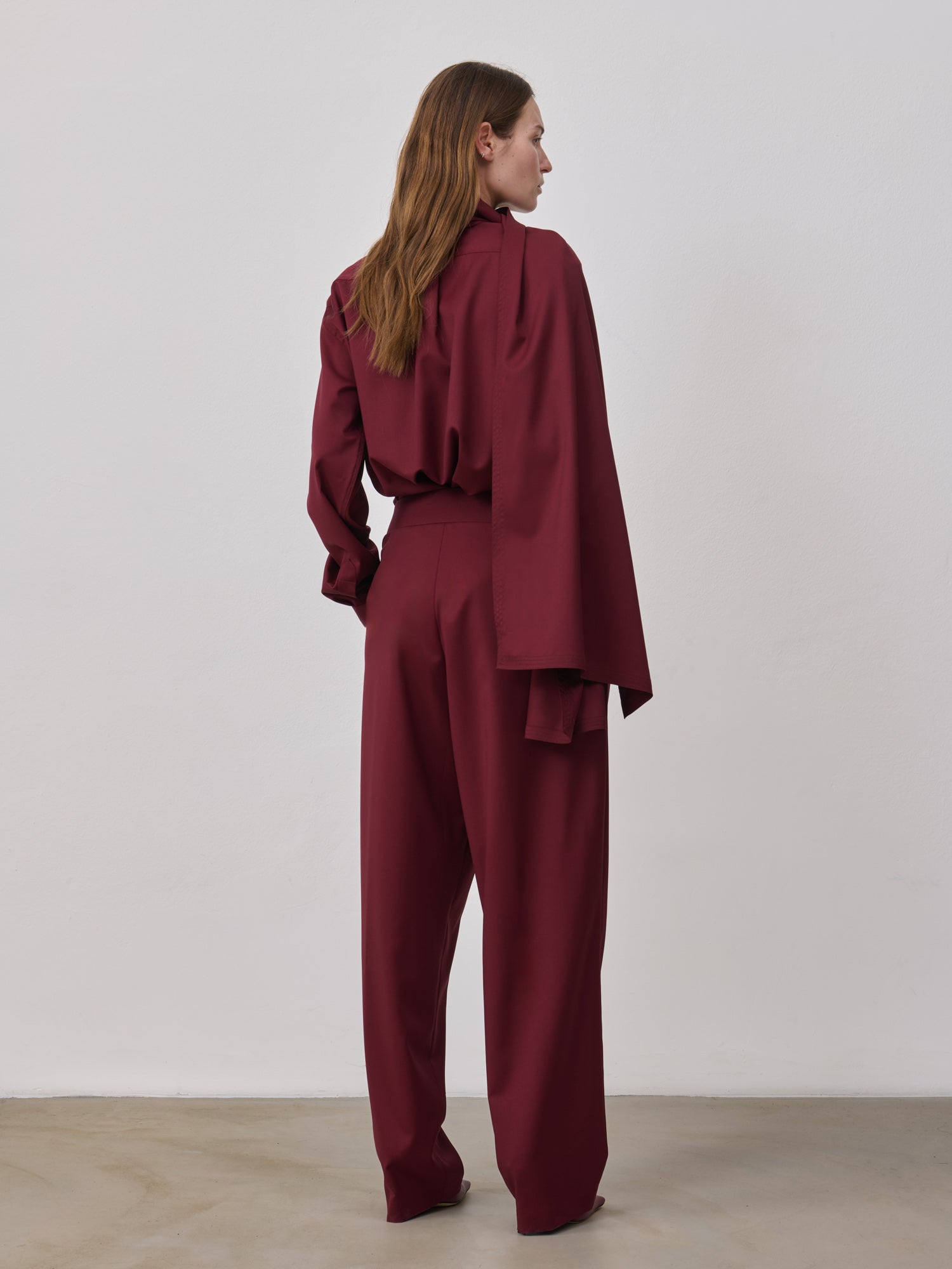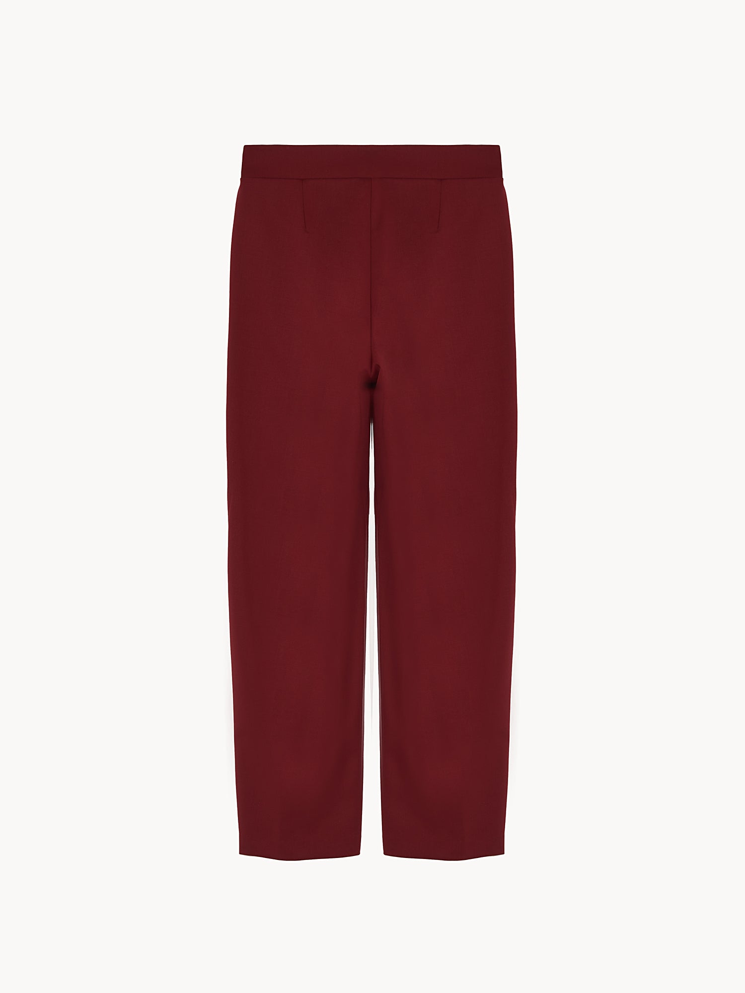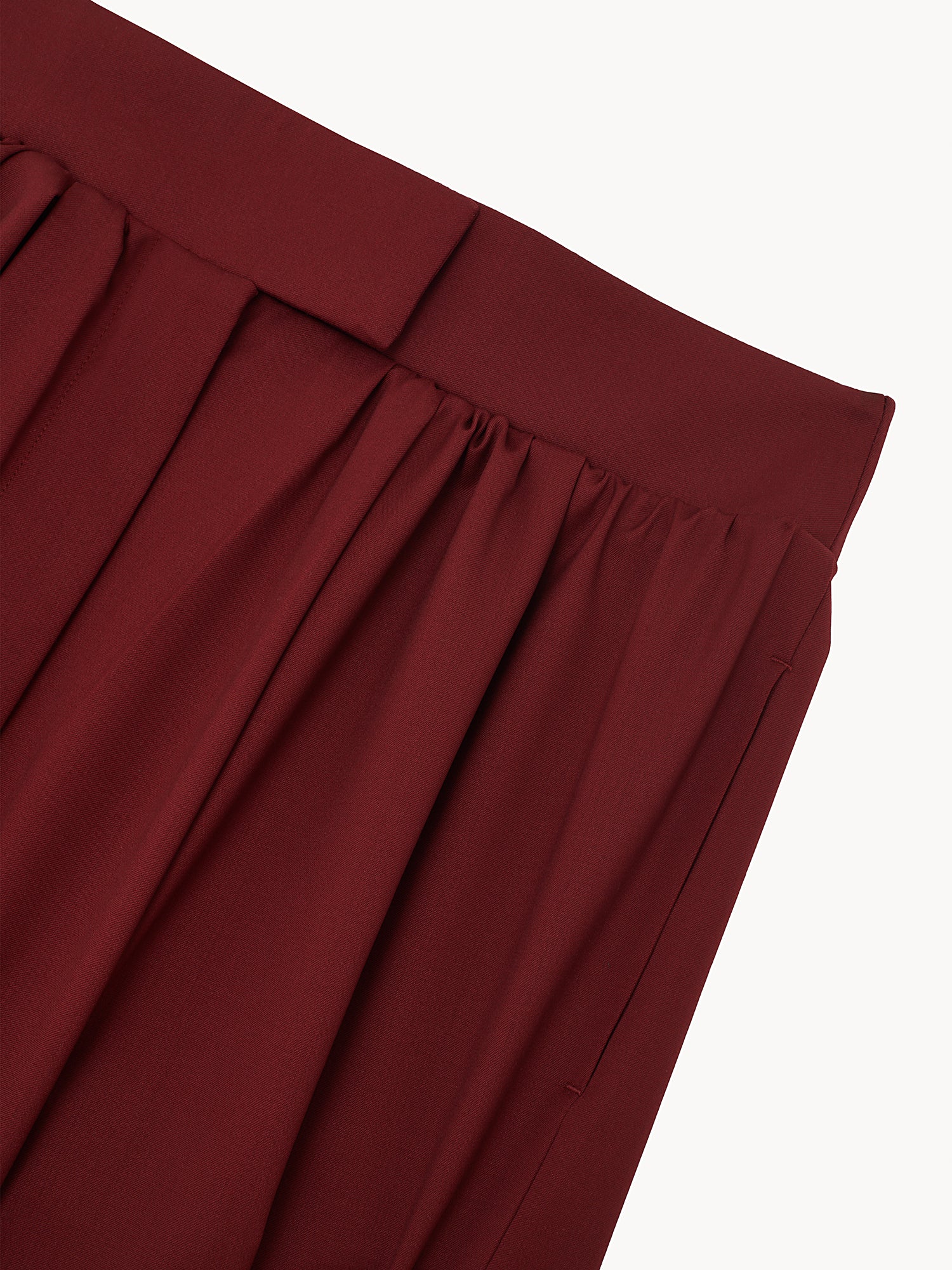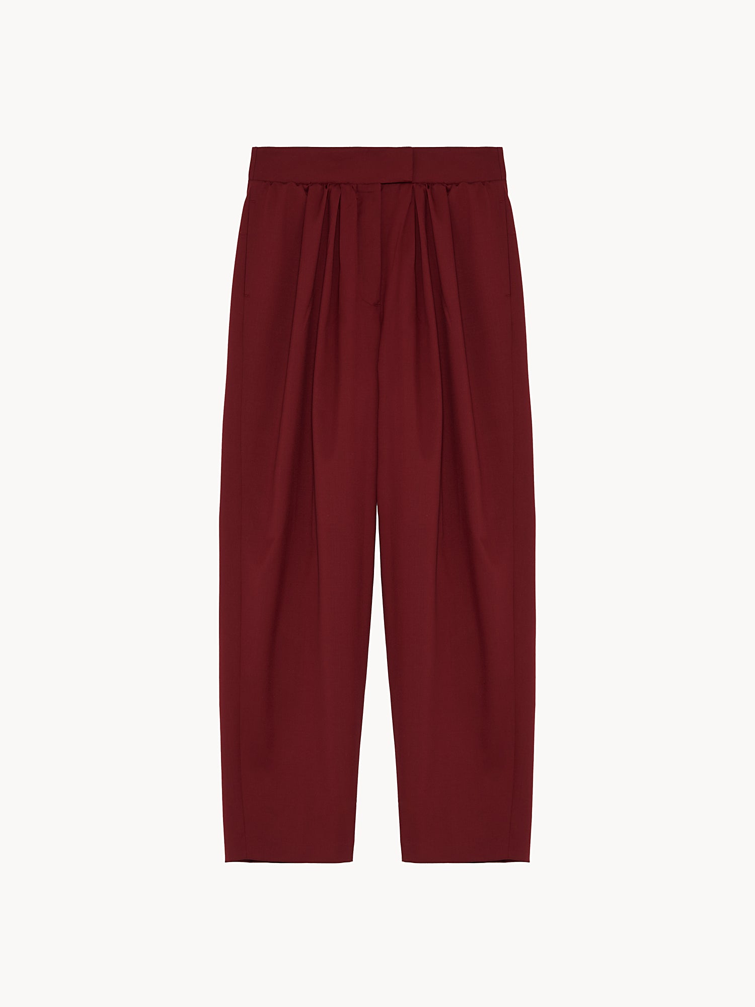Low-rise pant in lightweight wool with pleats and gathering, loose fluid leg and side seam pockets. 100% Wool. Inside horn button. Made in Italy
