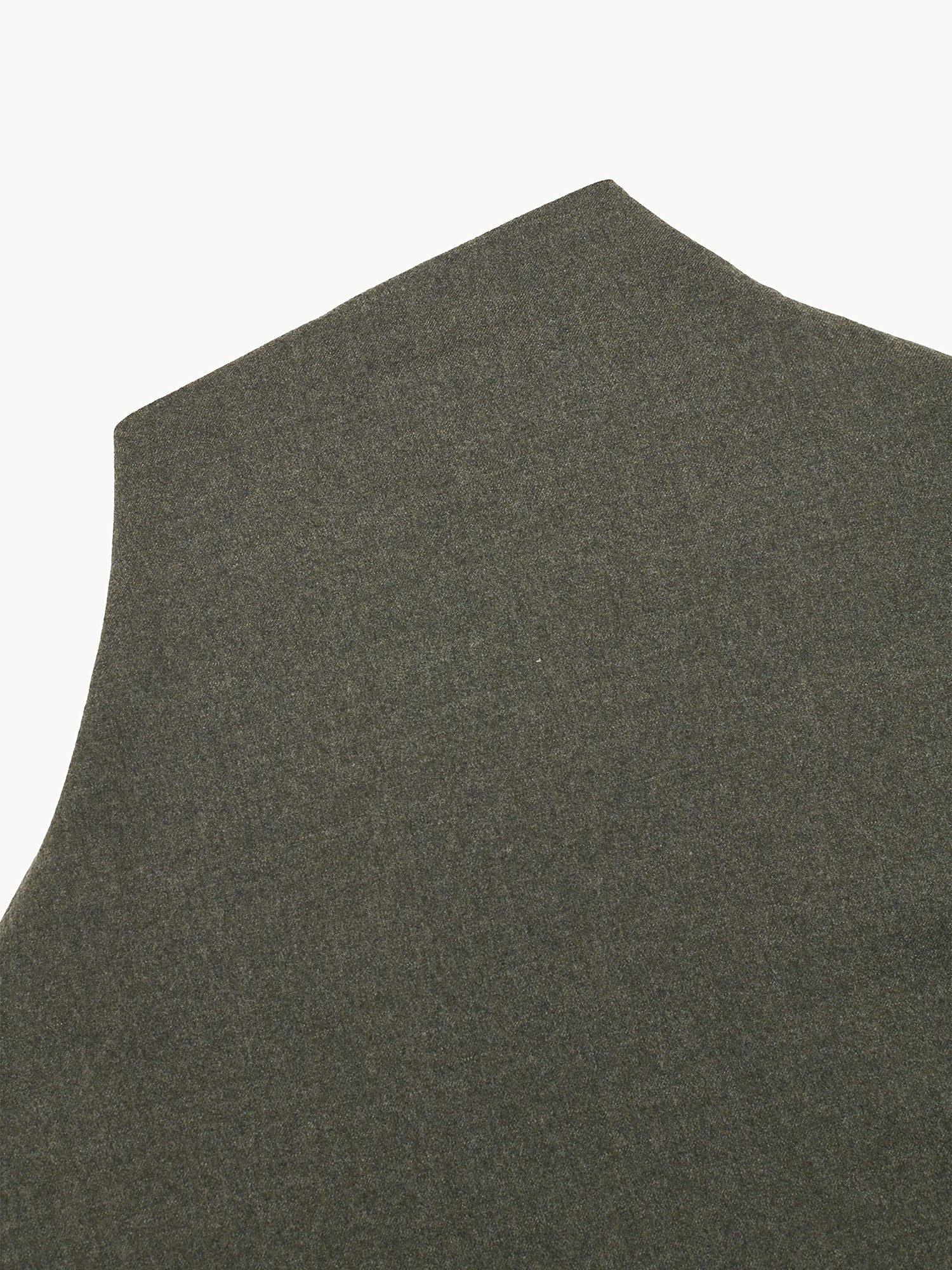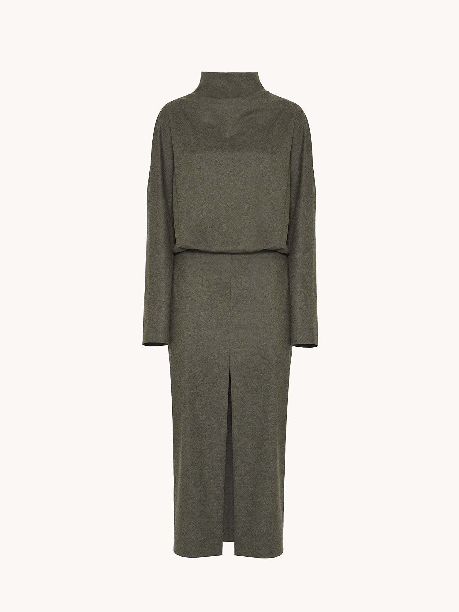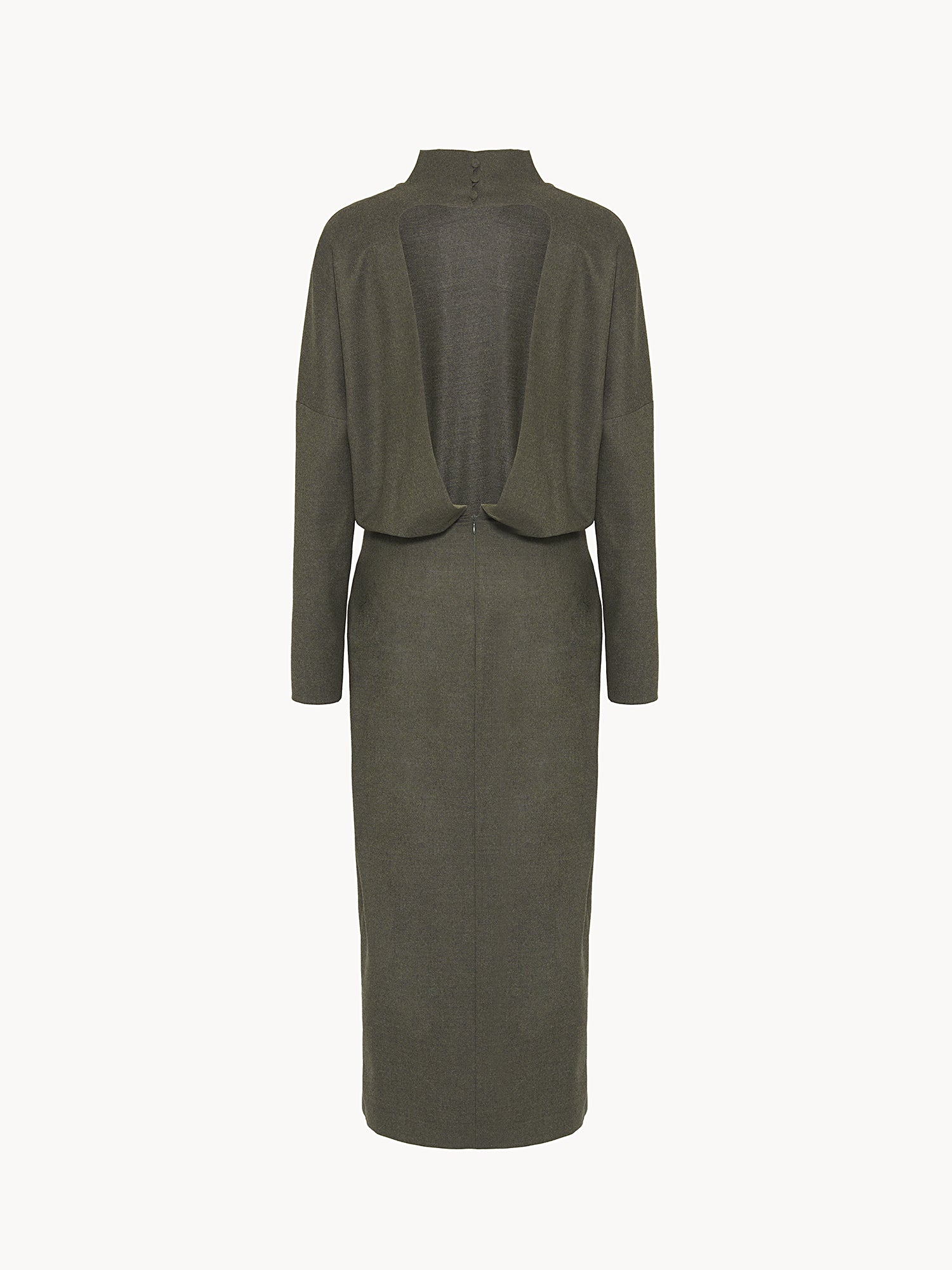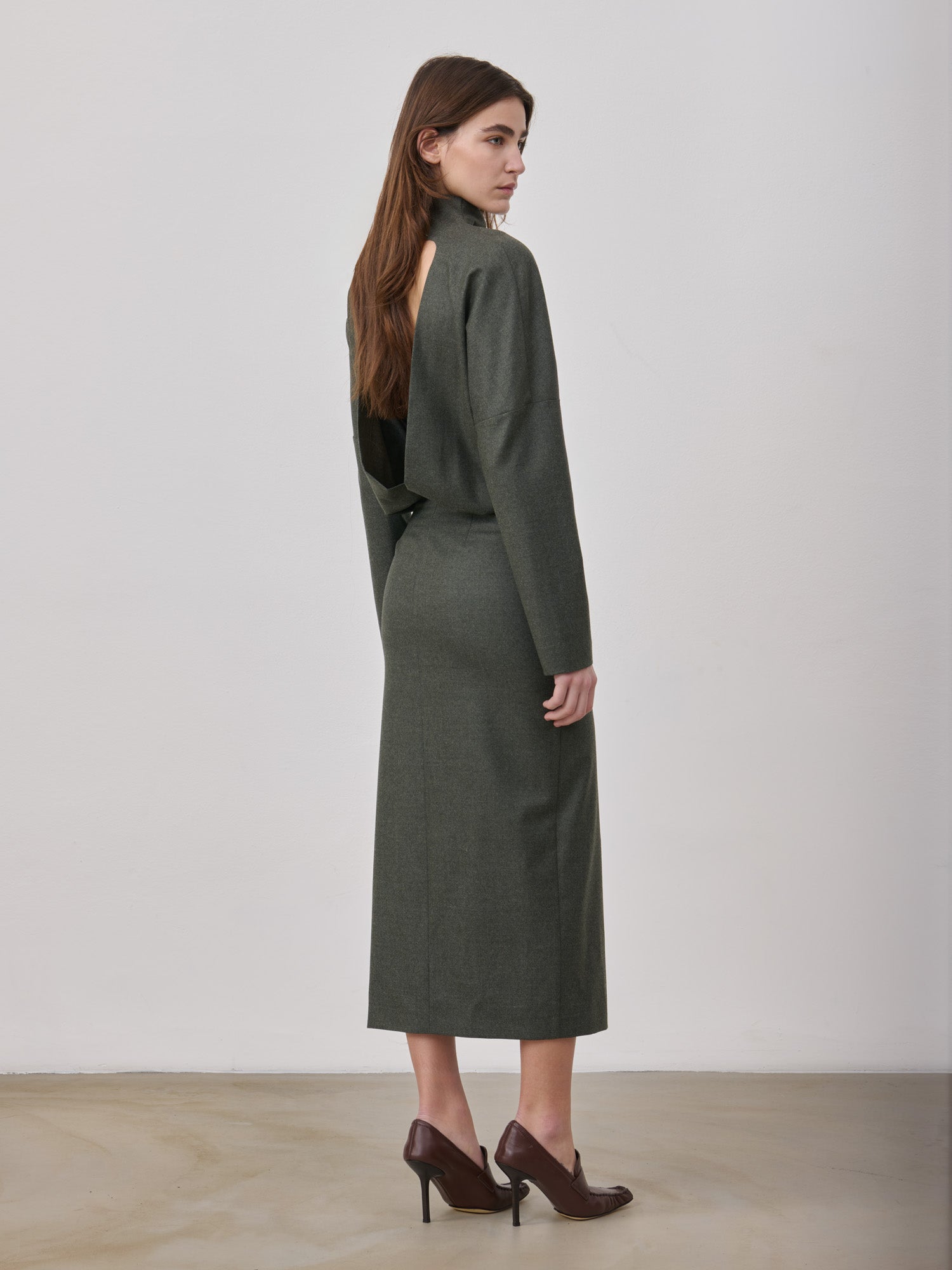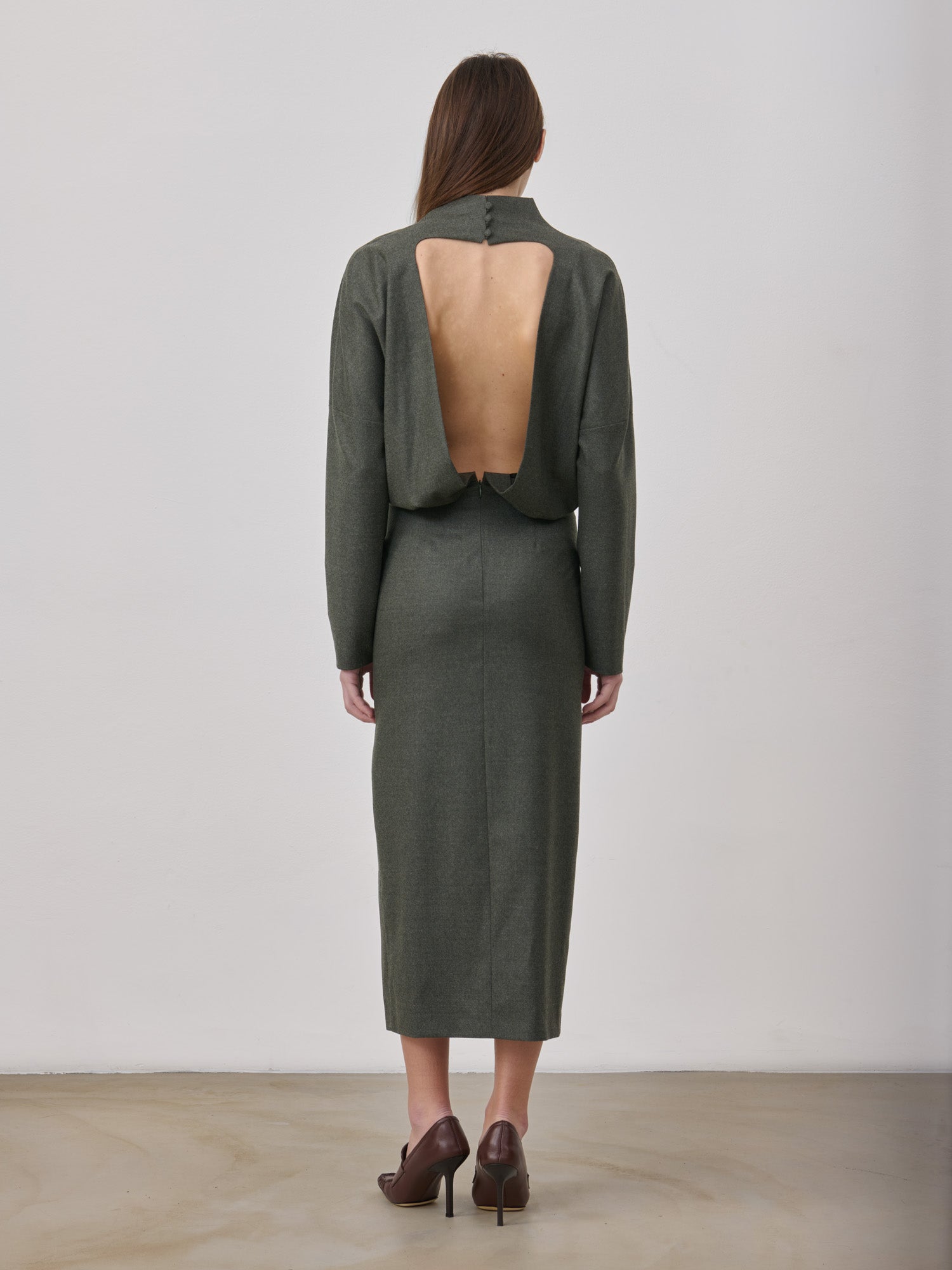 Long sleeved fluid midi dress in light-weight virgin wool with backless design, crater neck, central front slit and invisible zipper closure. 100% Virgin Wool. Unlined. Made in Italy.