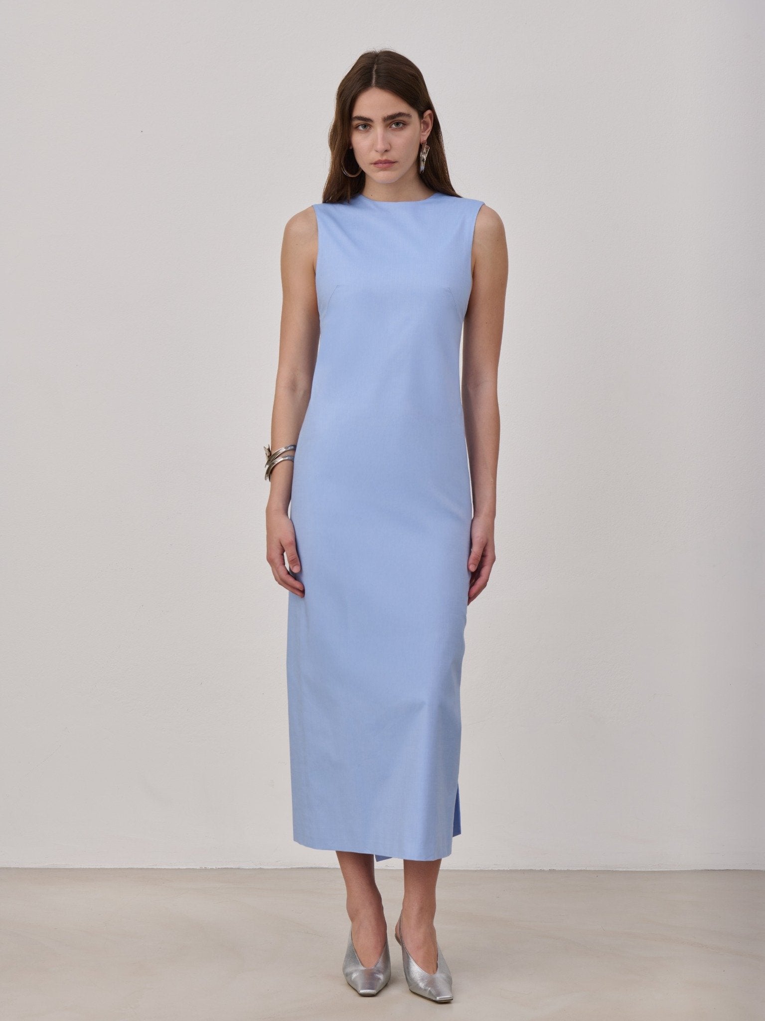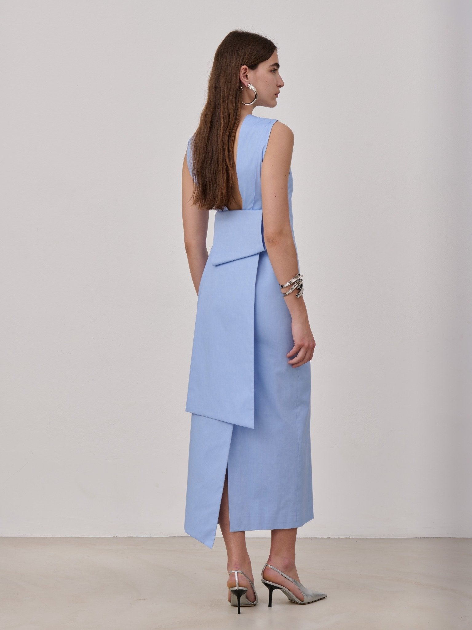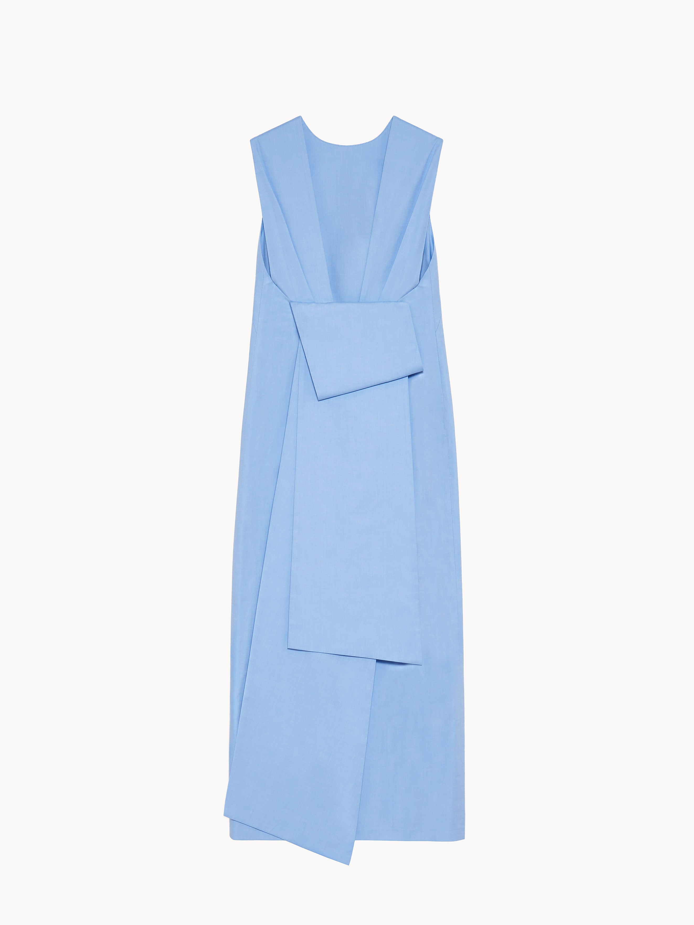 Midi dress in cotton popeline with a back slit embellished with a half bow detail with long tails. Made in Italy.