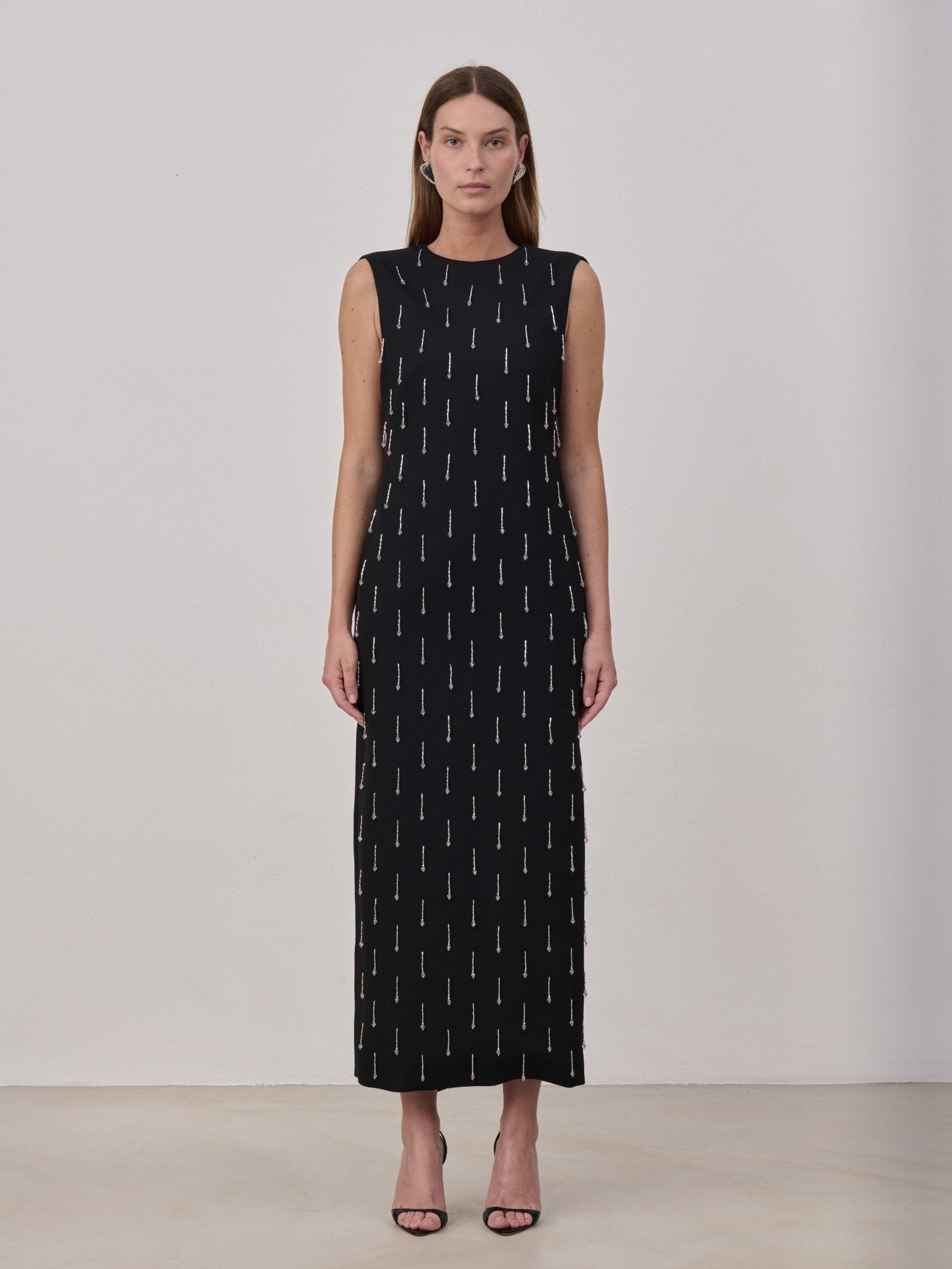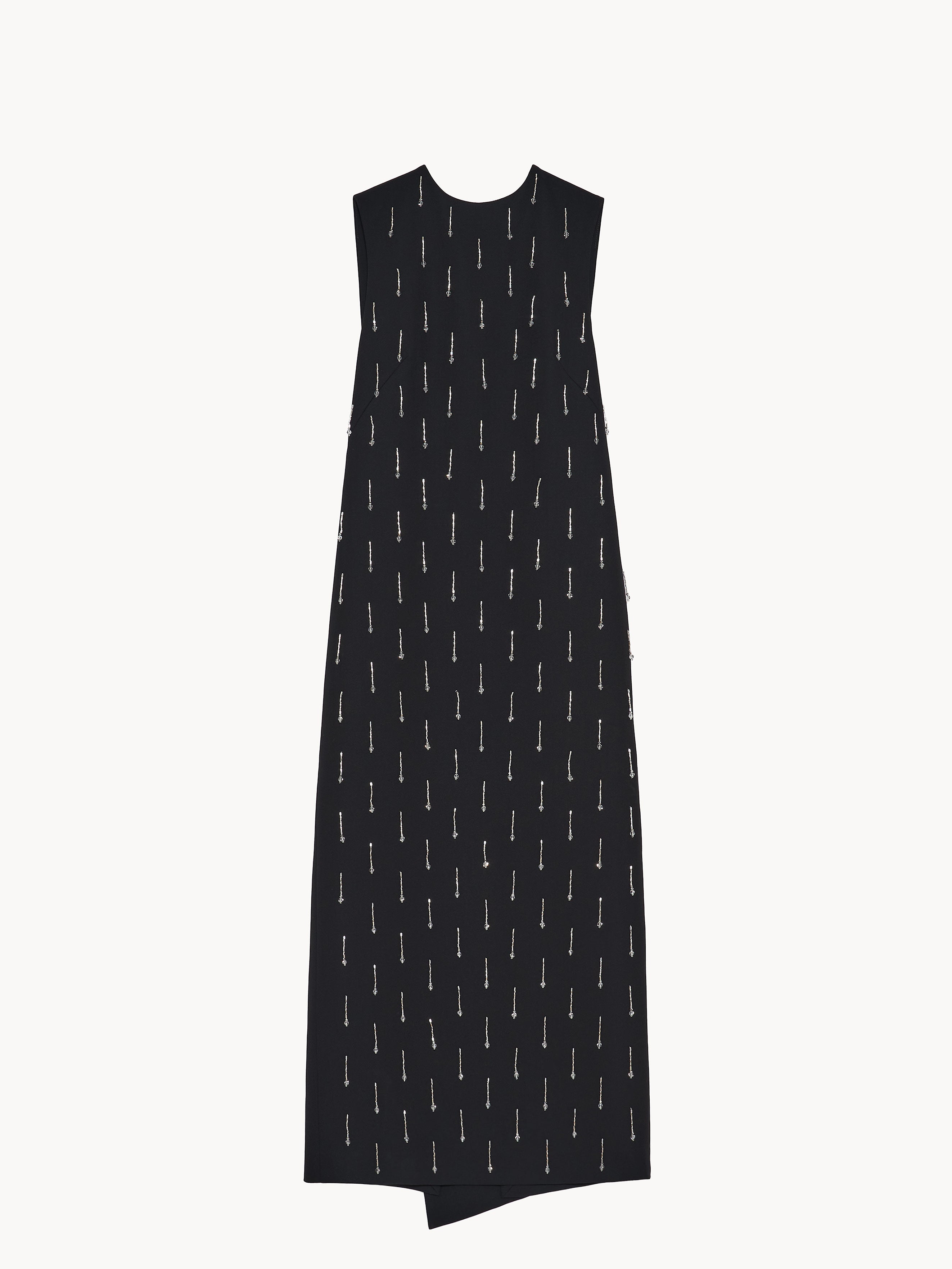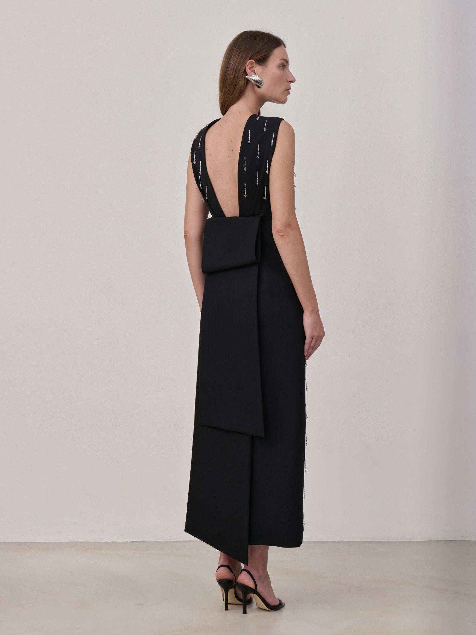Midi dress in virgin wool with a back slit, featuring a half bow detail with long tails and embellished with hand embroidered tube beads and glass spheres. Made in Italy.