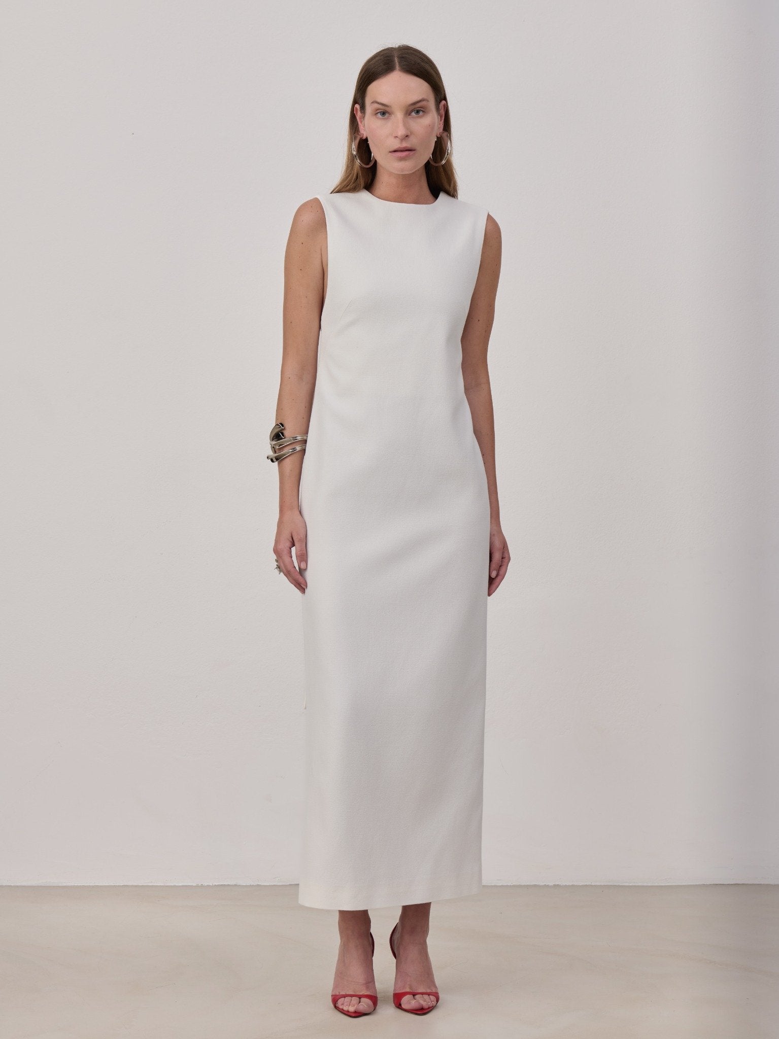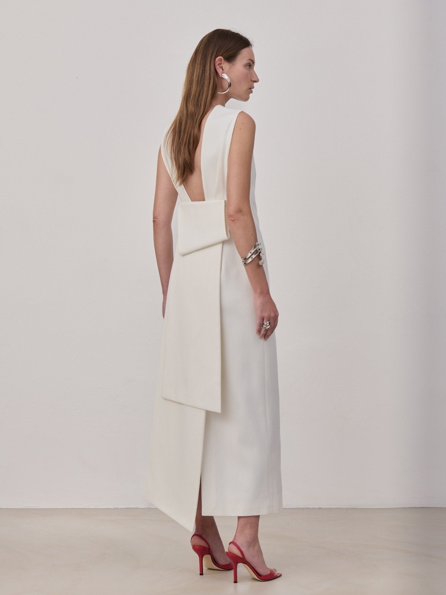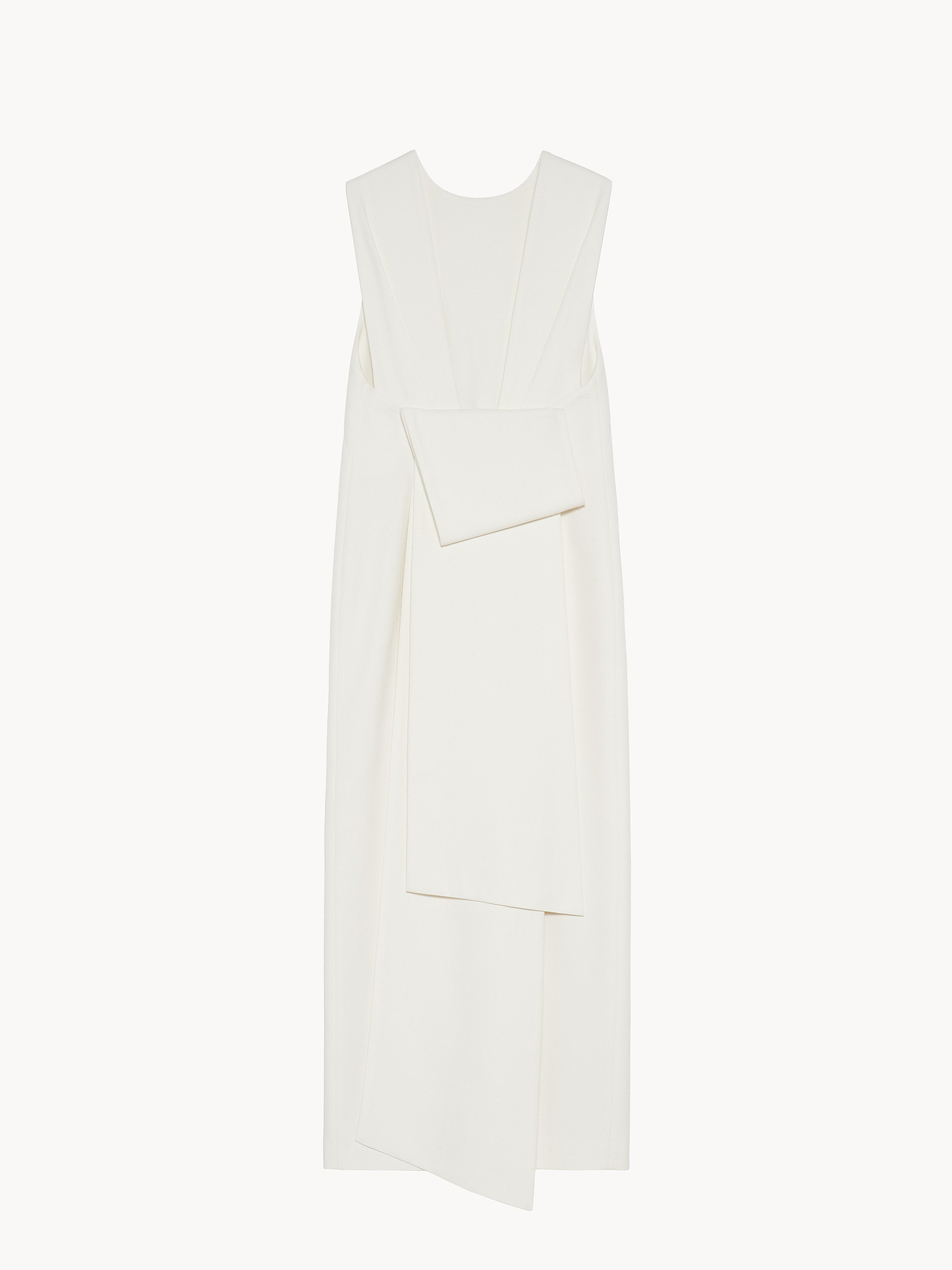 Midi dress in viscose with a back slit embellished with a half bow detail with long tails. Made in Italy.
