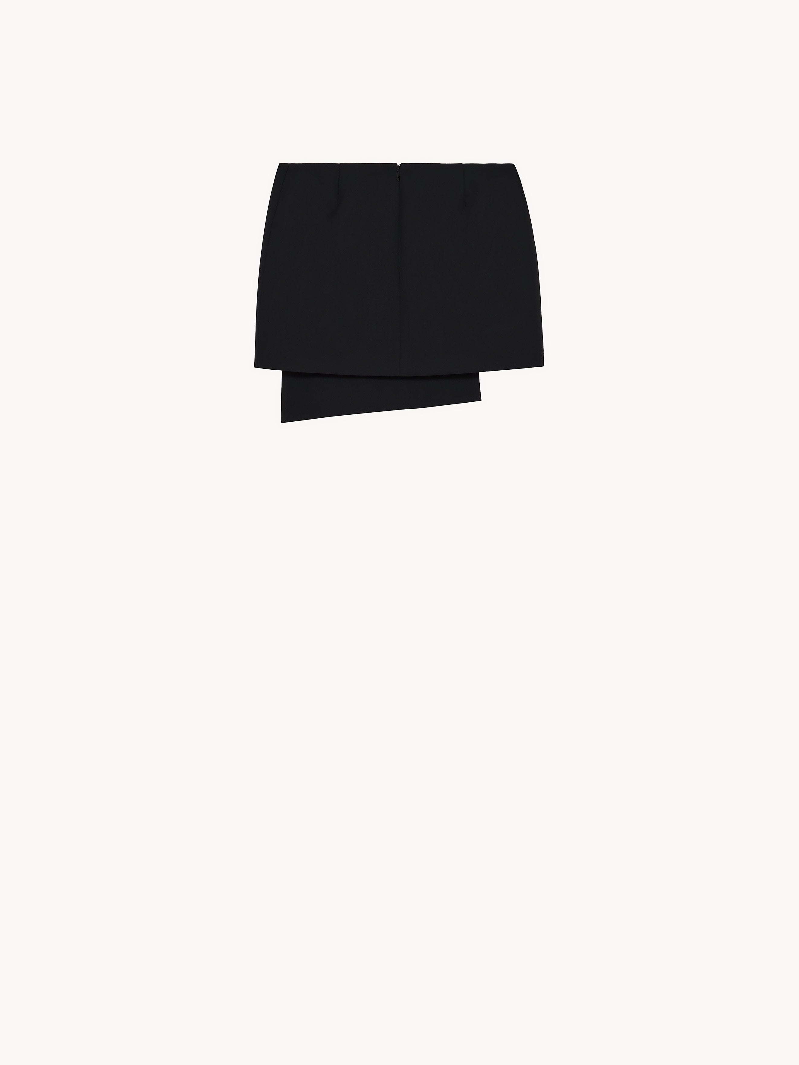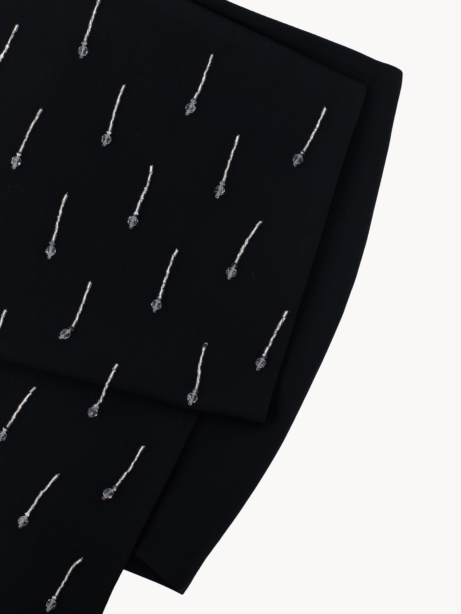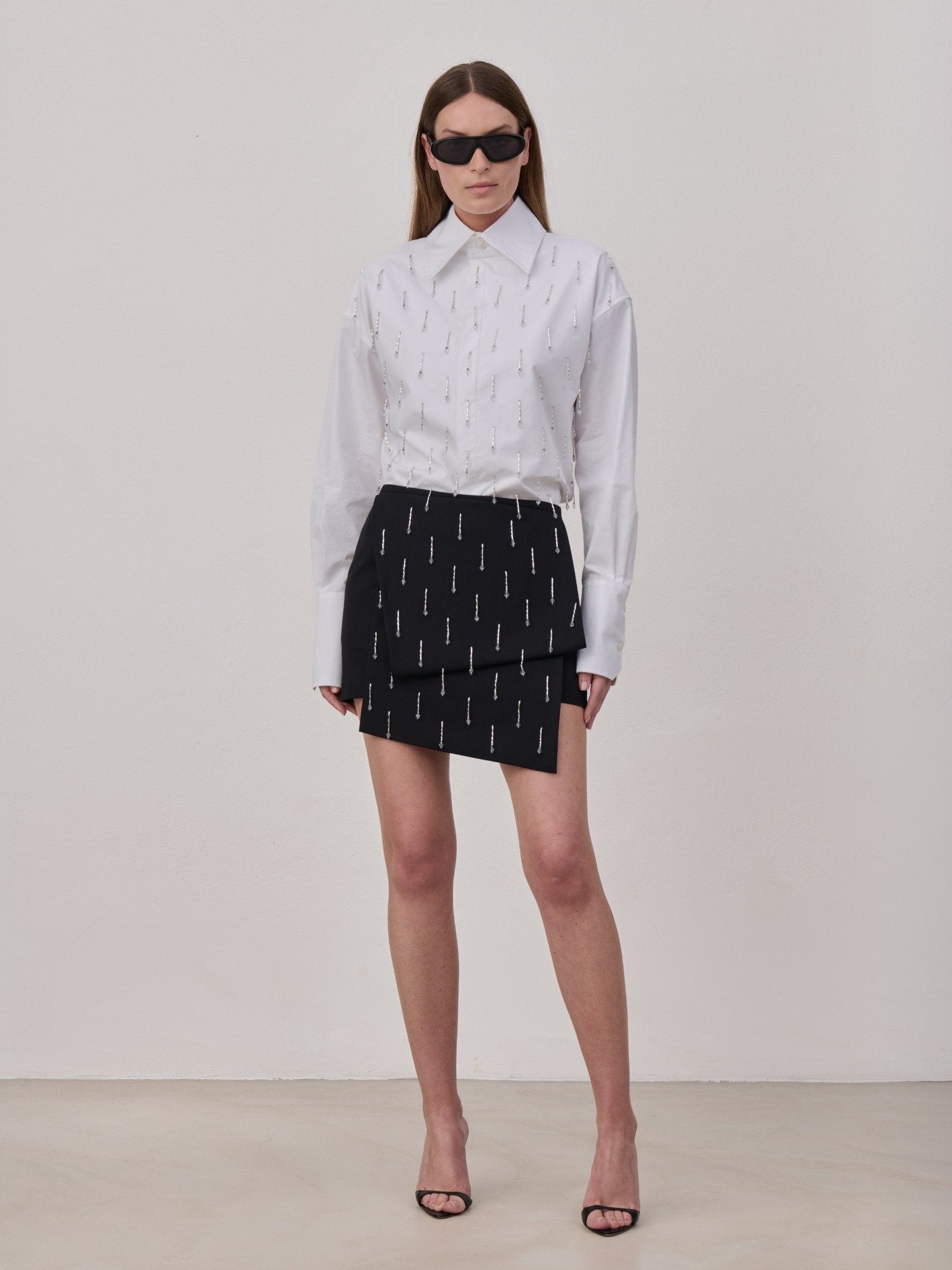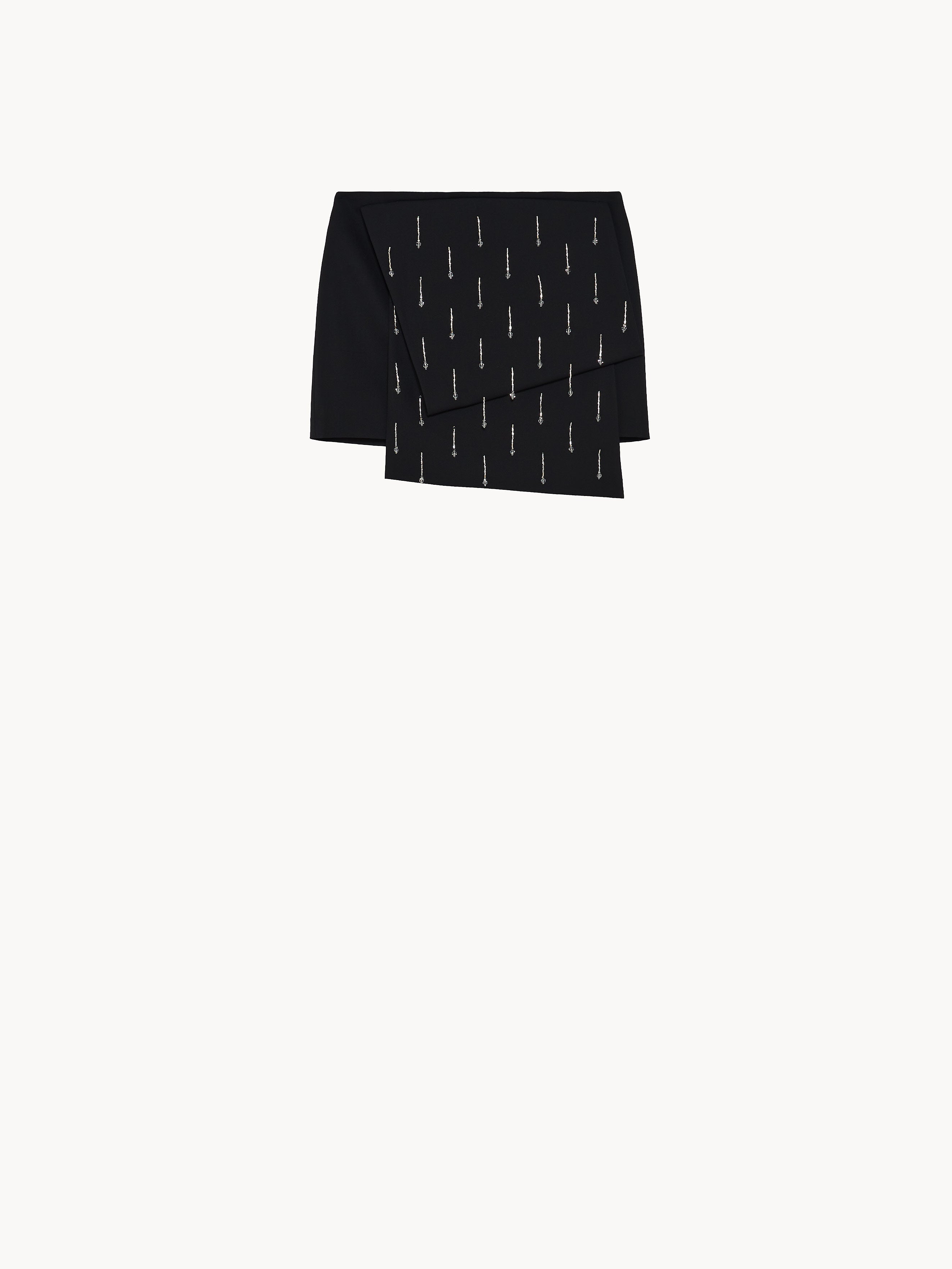 Mini skirt in virgin wool, designed with a double front panel and elevated by hand-embroidered glass bead pendants. 100% Virgin Wool. Lining 100% Cupro. Made in Italy.