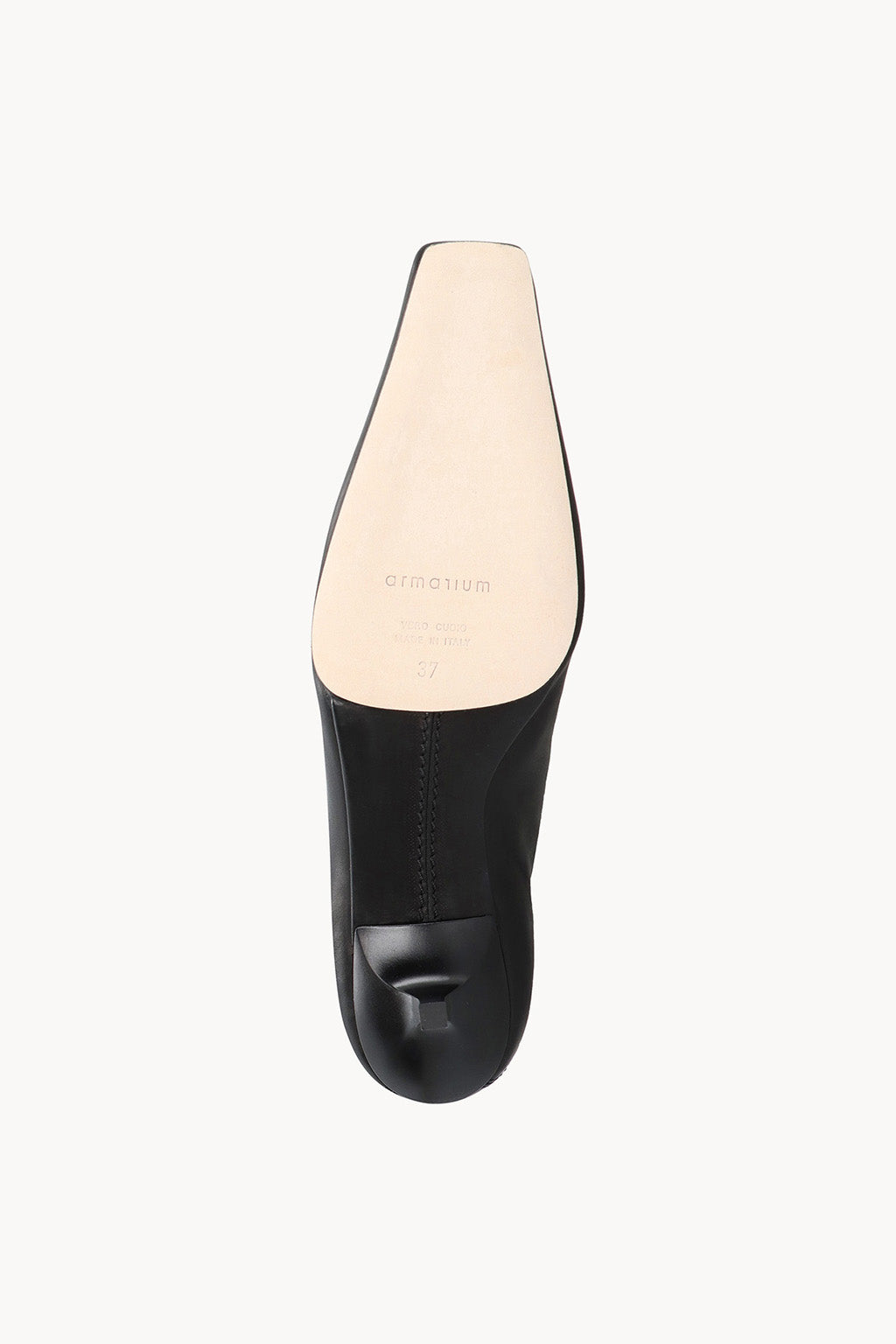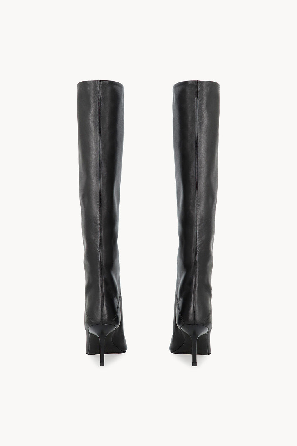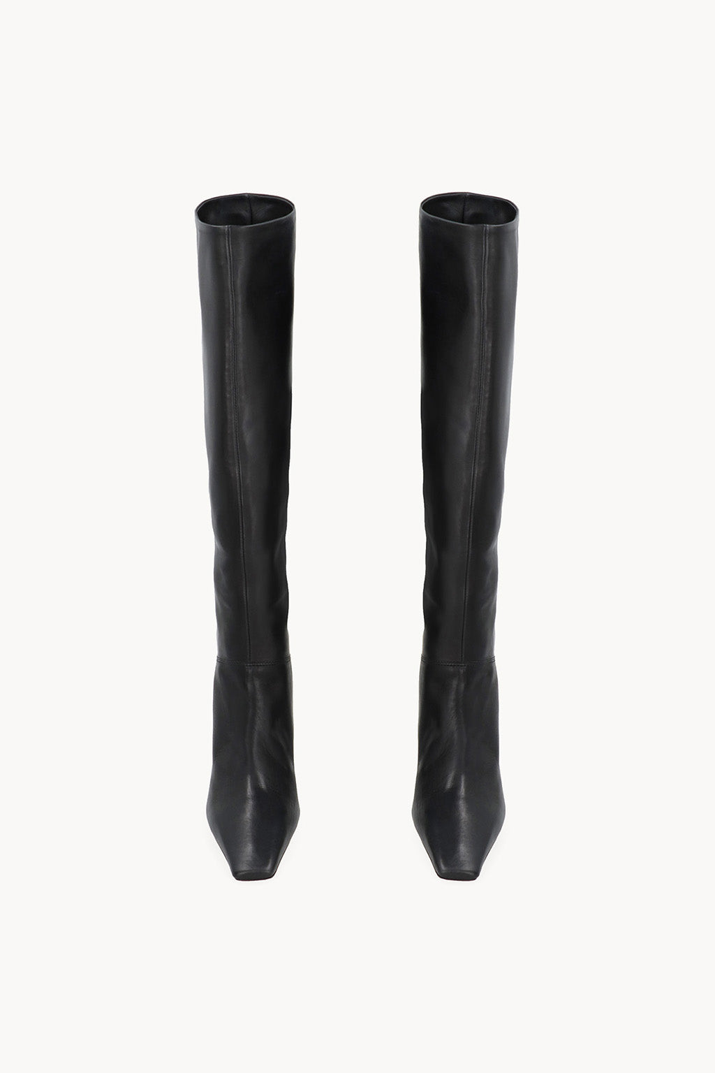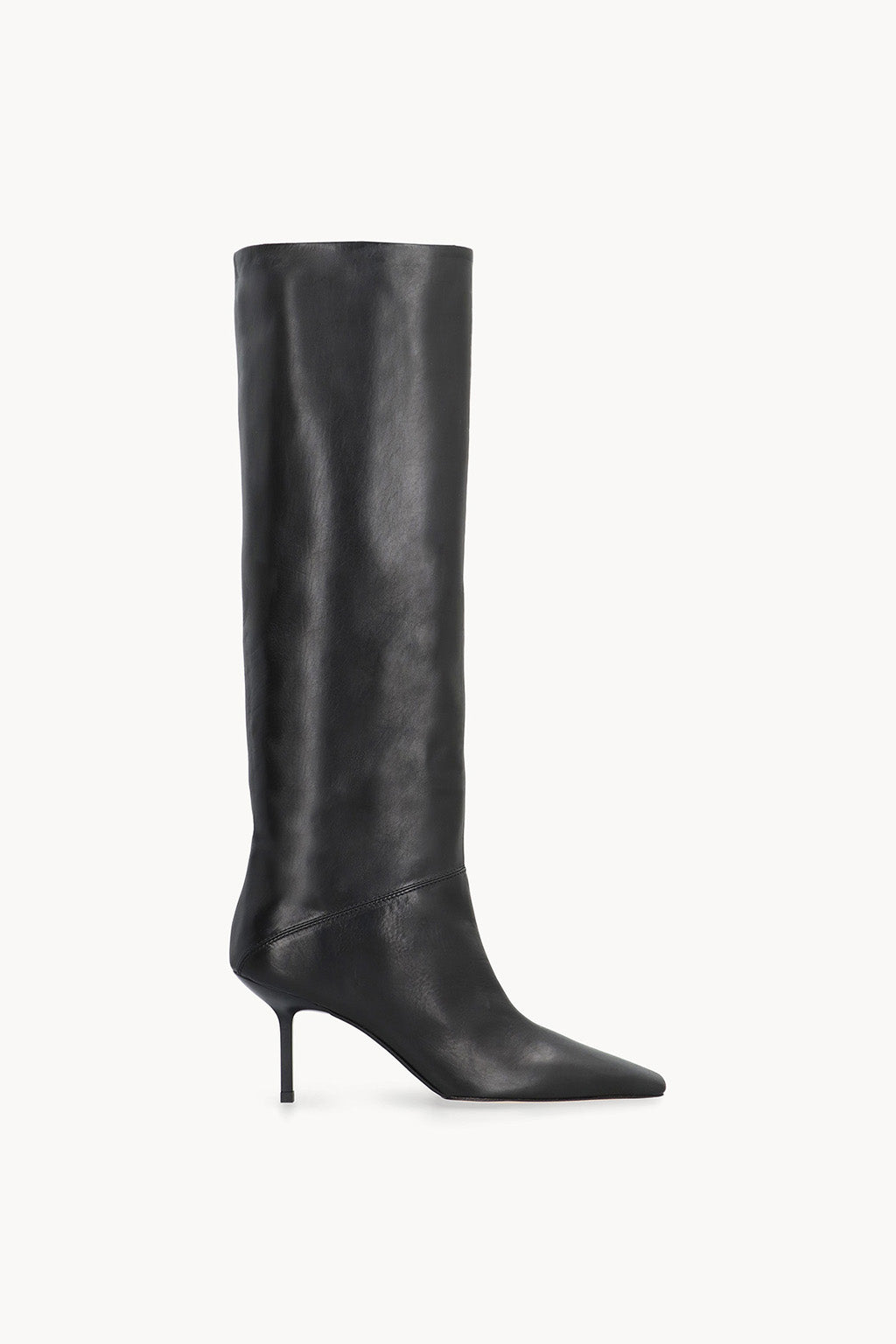 Below-the-knee soft tube boot, with a square toe and a 75 mm tone-on-tone lacquered heel. This shoe is realized in naturally tanned calfskin that reveals all the qualities of an unfinished, fine leather. The sole is divided into two parts; the ball of the foot is covered with a natural pumice leather island sole, while the arch of the foot is covered with the same material as the upper, enriched with a central hand stitch which adds a touch of craftsmanship and refinement to the overall design.