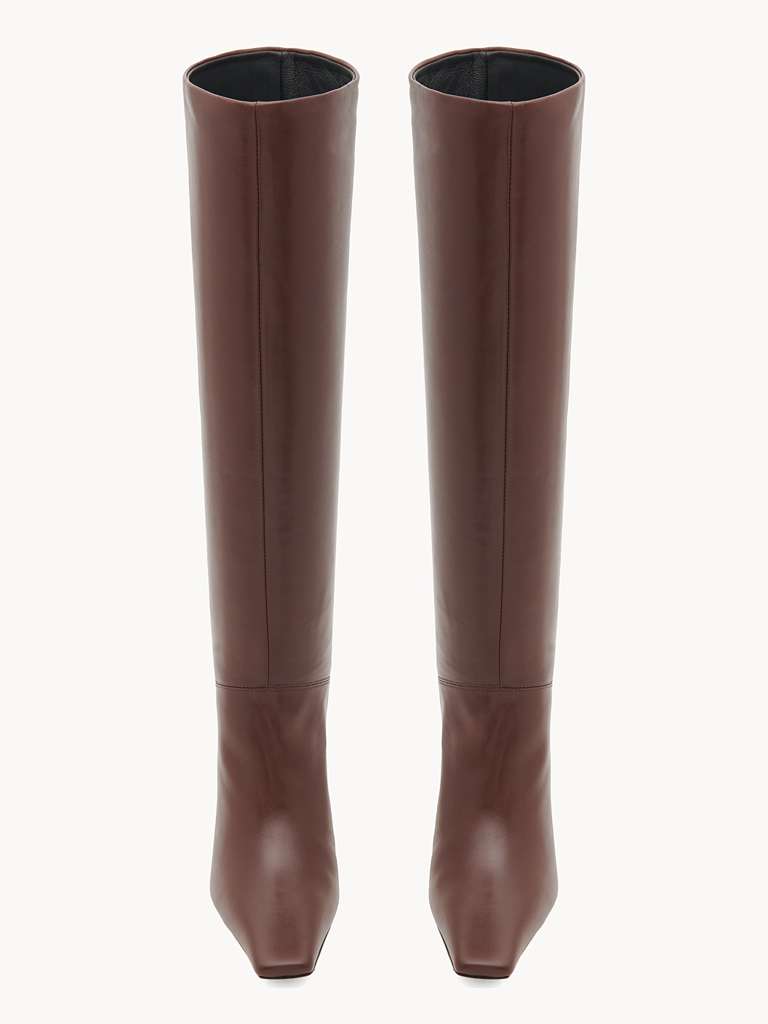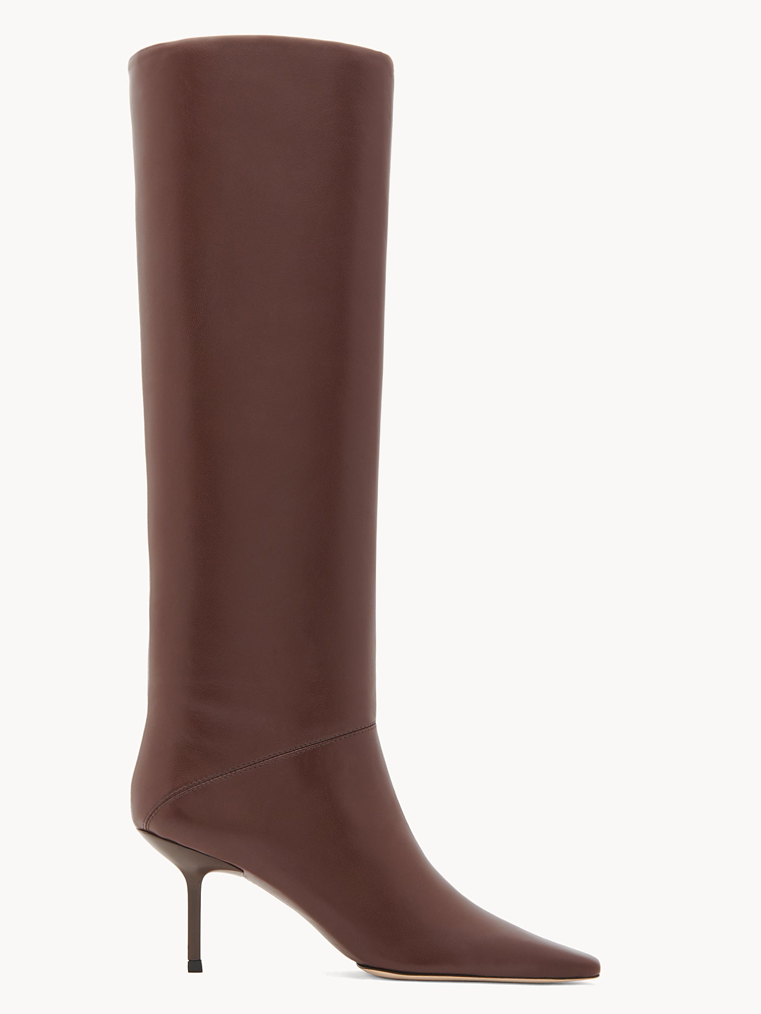 Orsola boot is a timeless expression of elegance. Made from sumptuous nappa leather, its sleek 42cm knee-high silhouette elongates the leg, while the pointed toe and sculpted 75mm laquered abs heel add a modern edge. It features a hand-finished natural leather sole and double stitched detailing for durability. 100% Nappa Lambskin. Made in Italy.