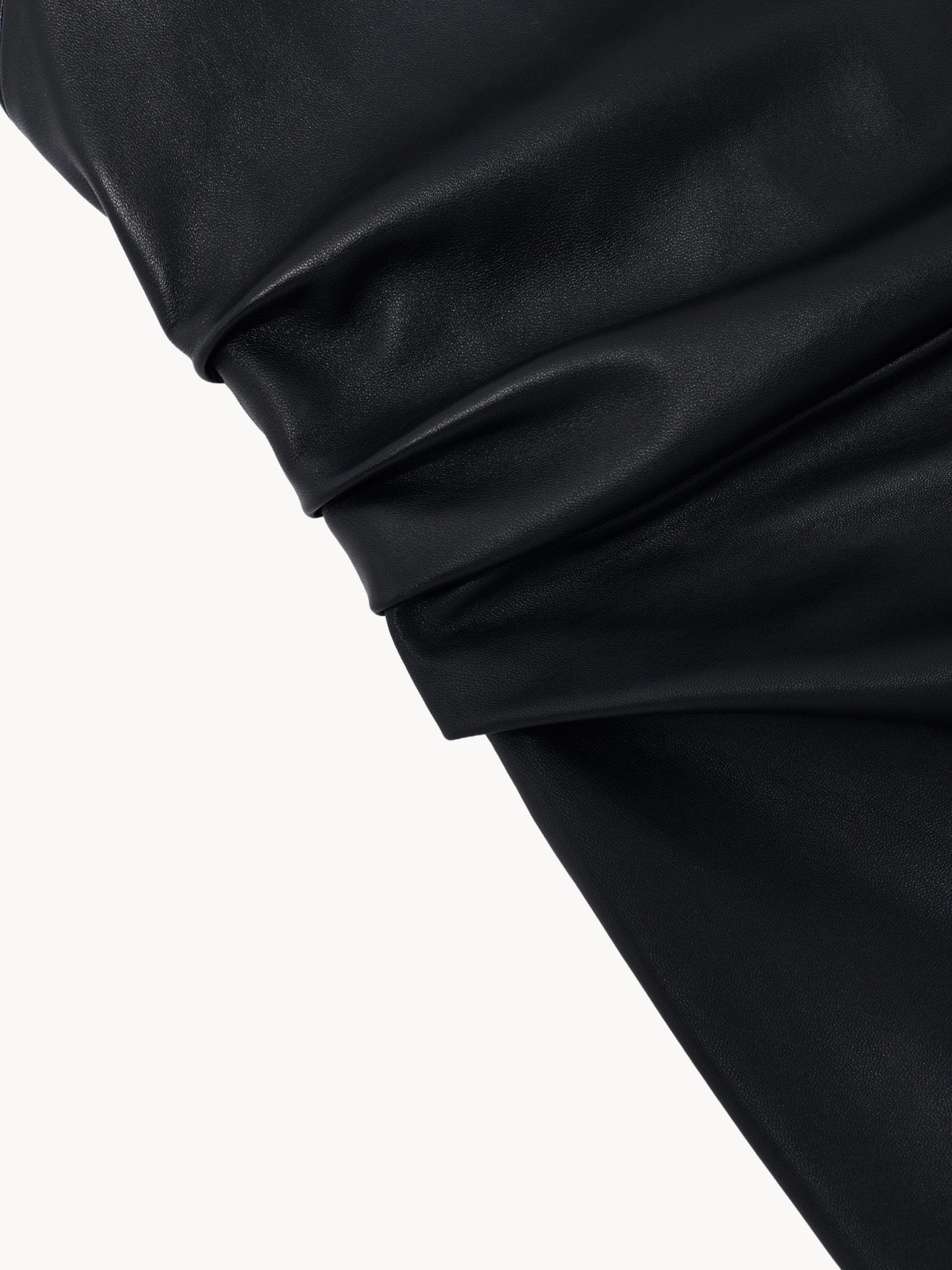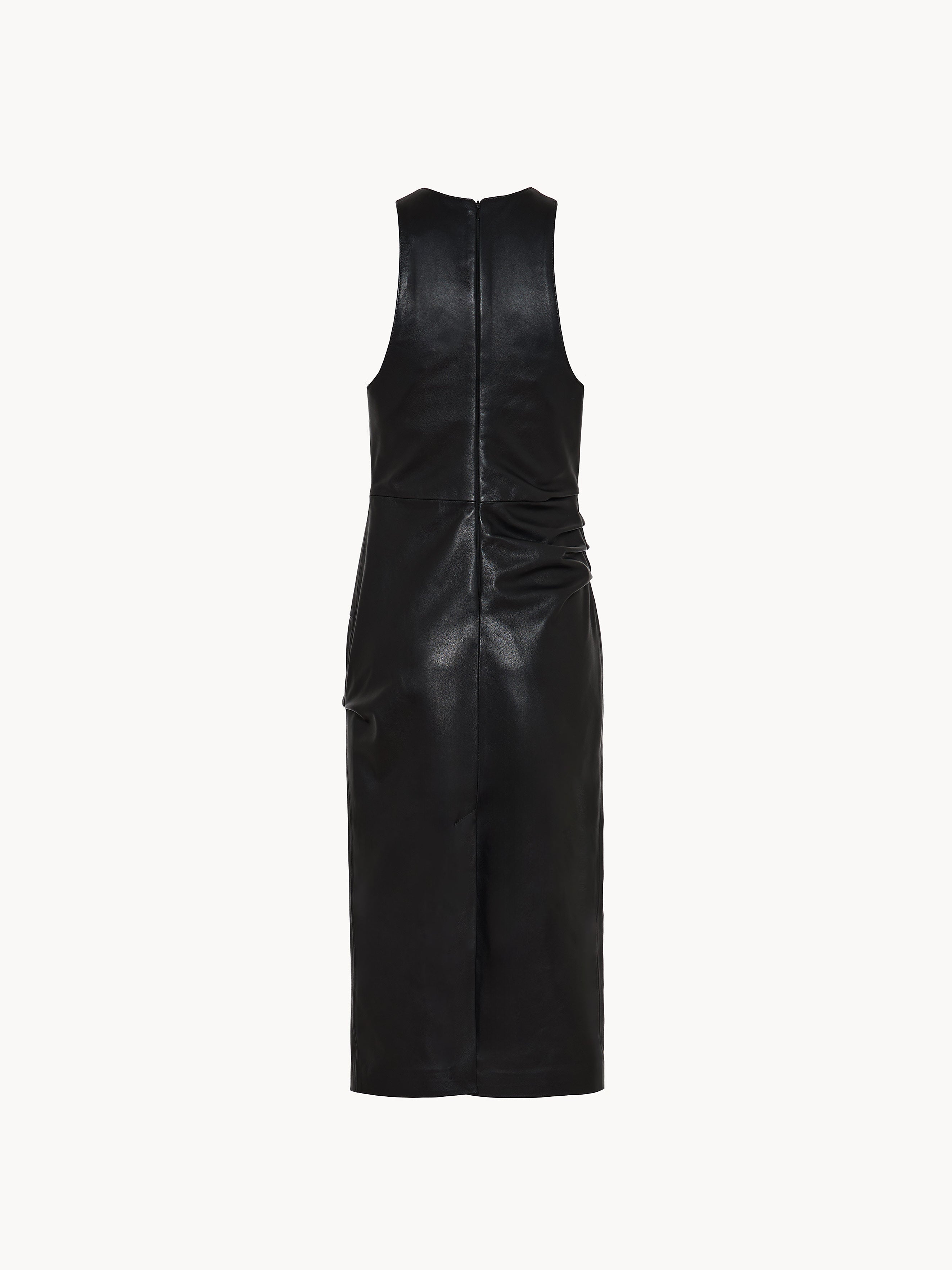 Fitted crew-neck midi dress in leather with draped detailing at the hips and invisible back zipper closure. 100% Leather. Lining 100% Cupro. Made in Italy.