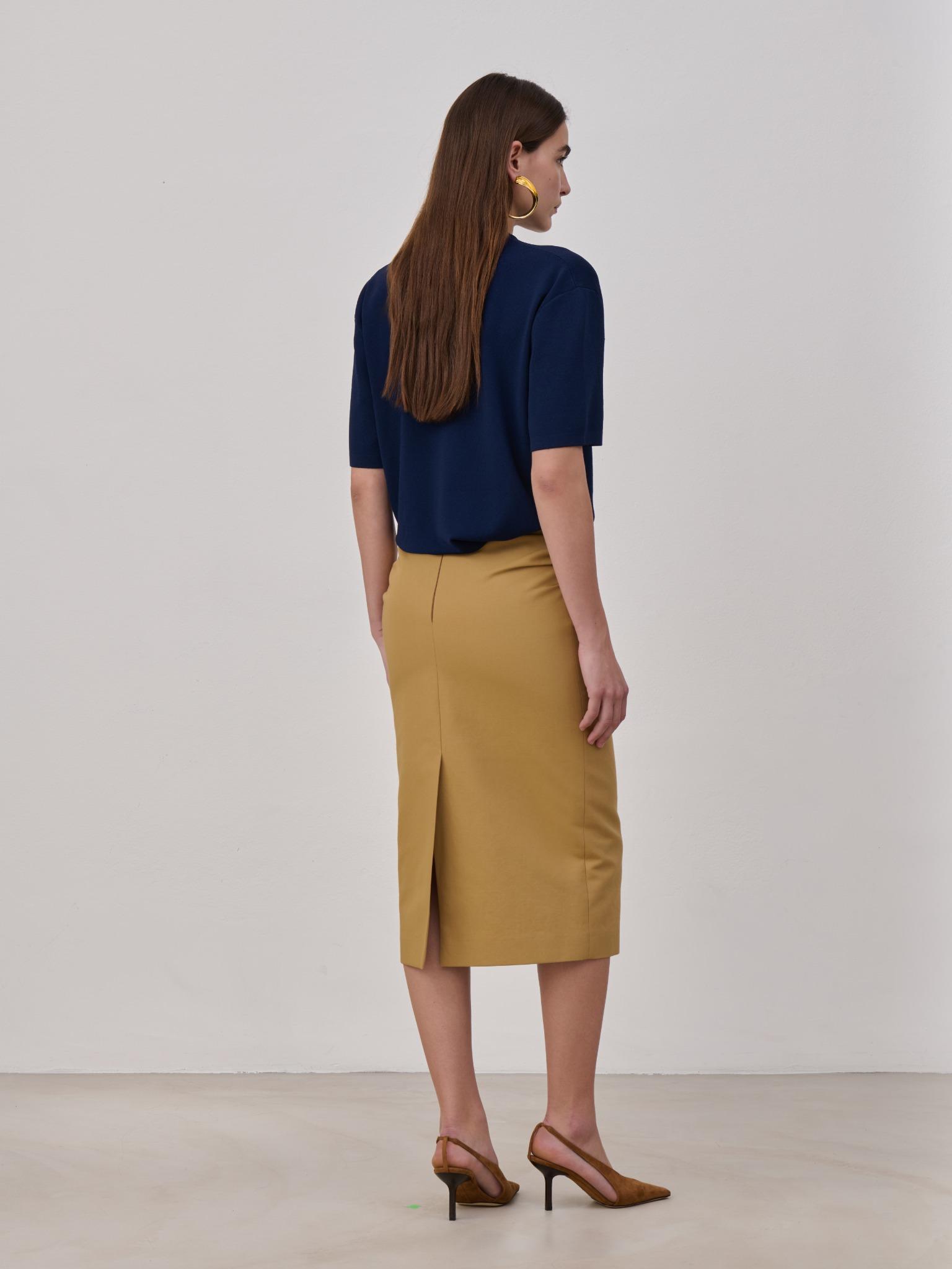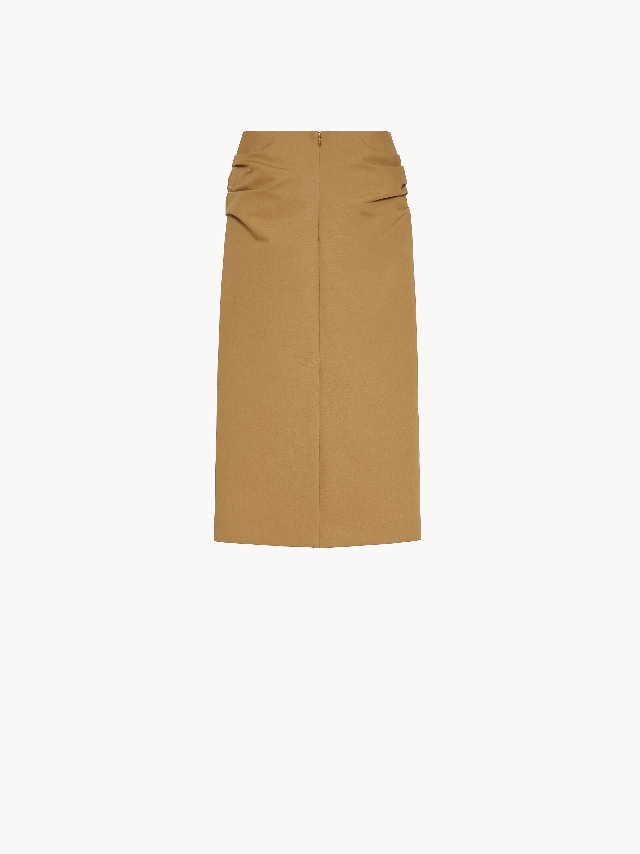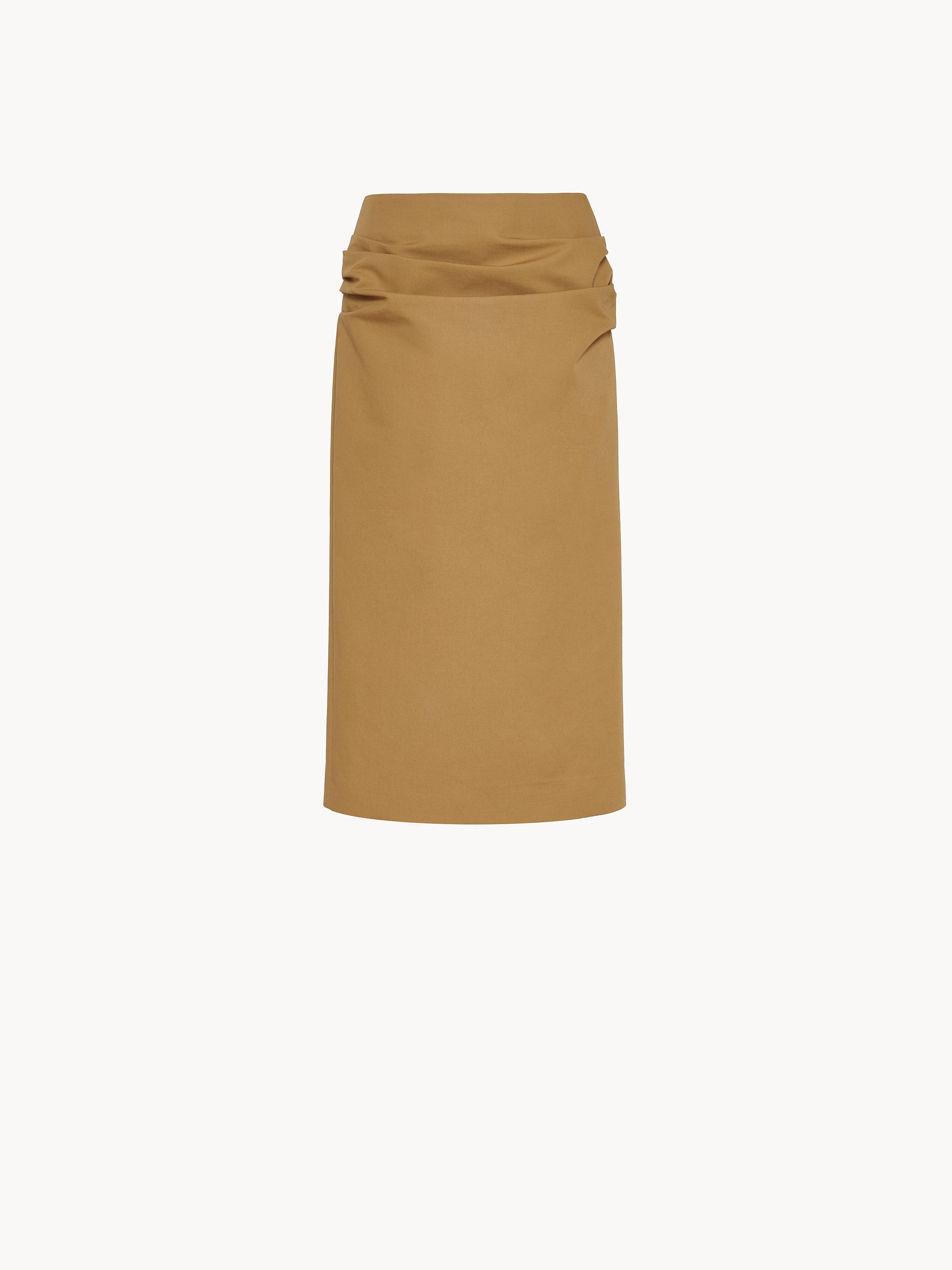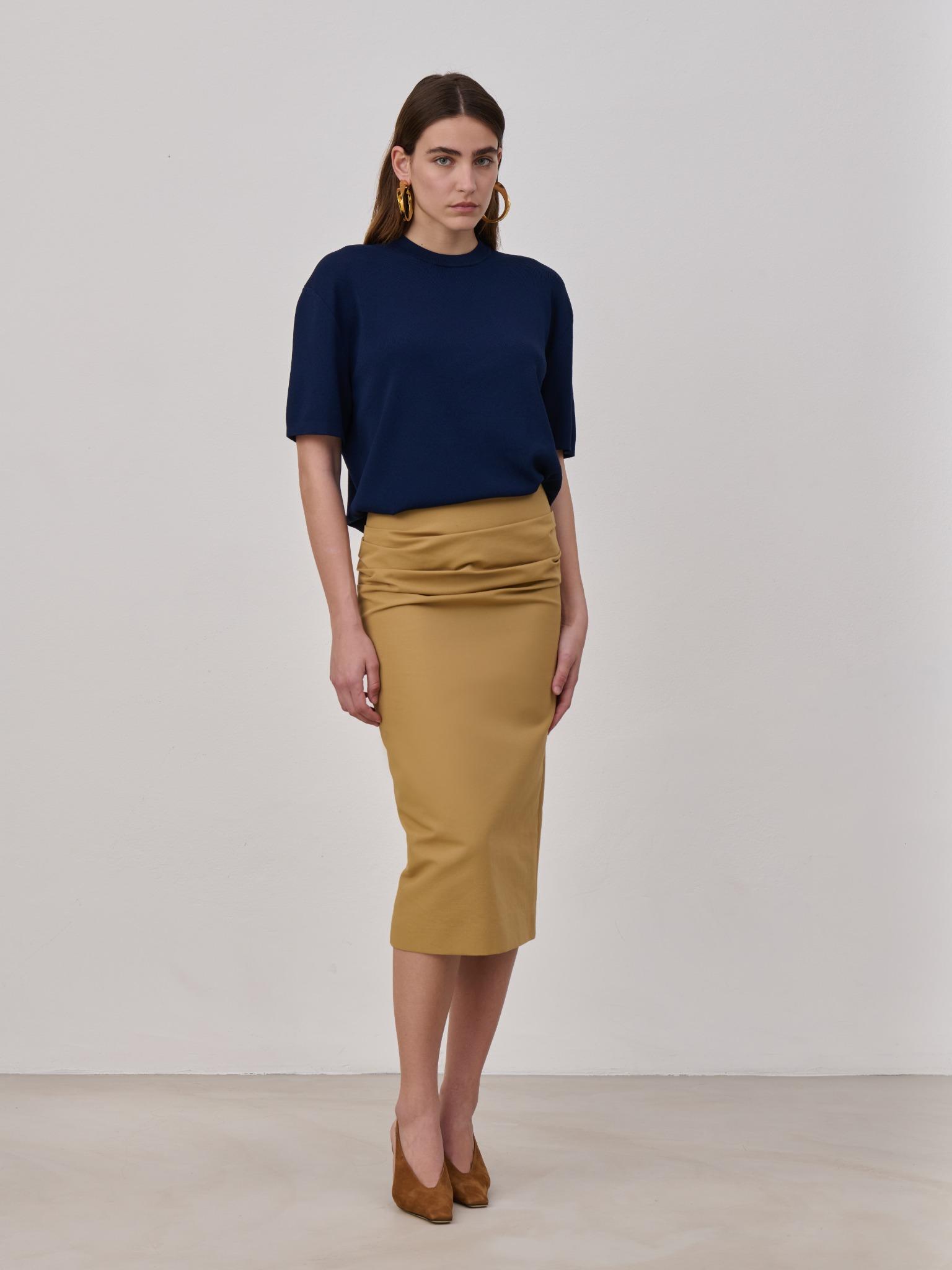 High waisted midi pencil skirt in cotton with draped detailing at the hips, back slit and invisible back zipper closure. Made in Italy.