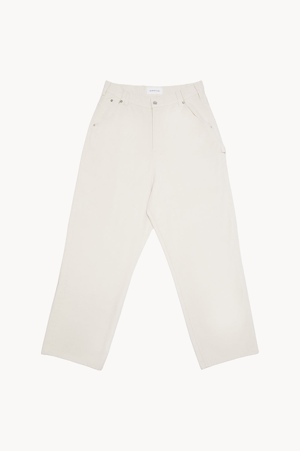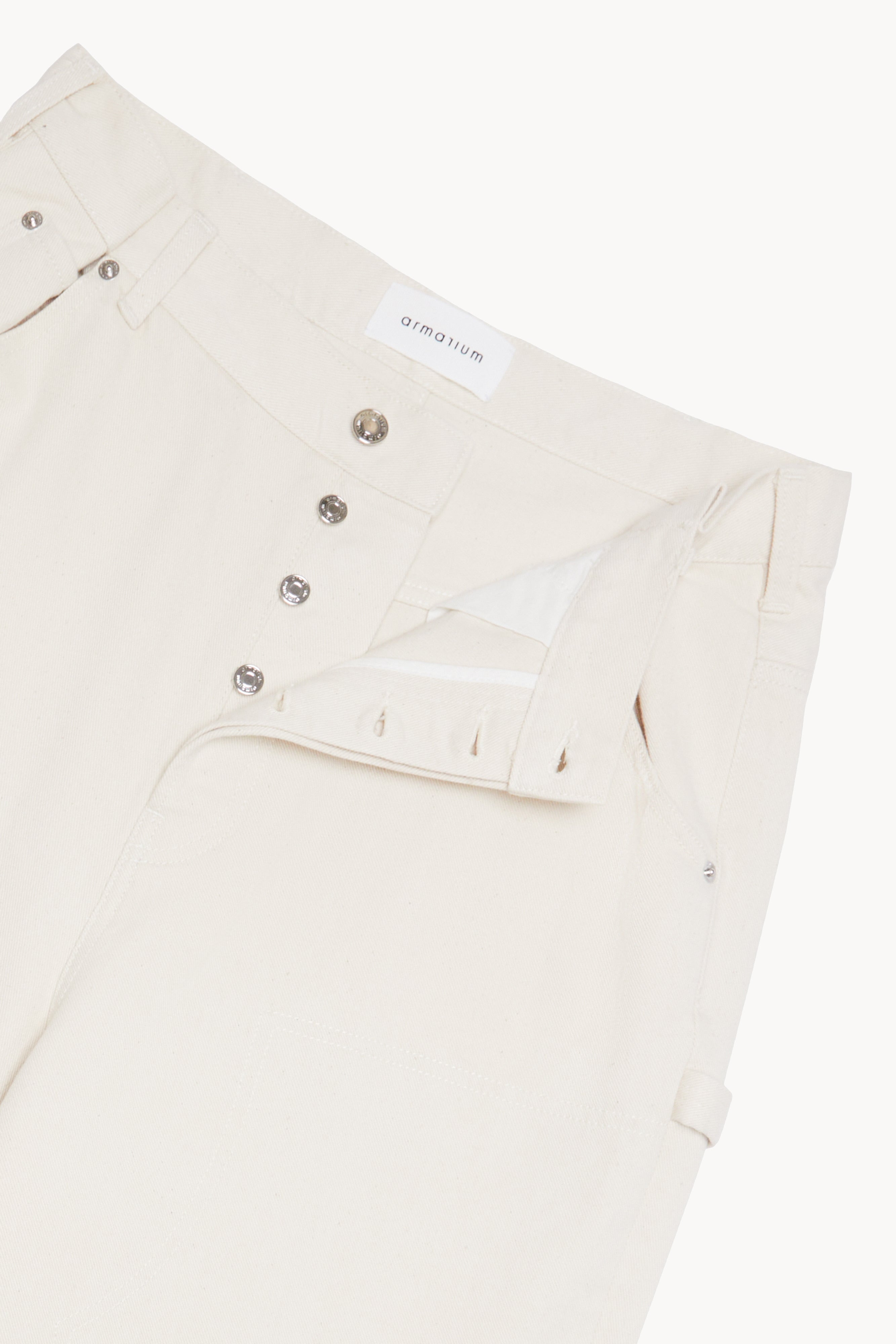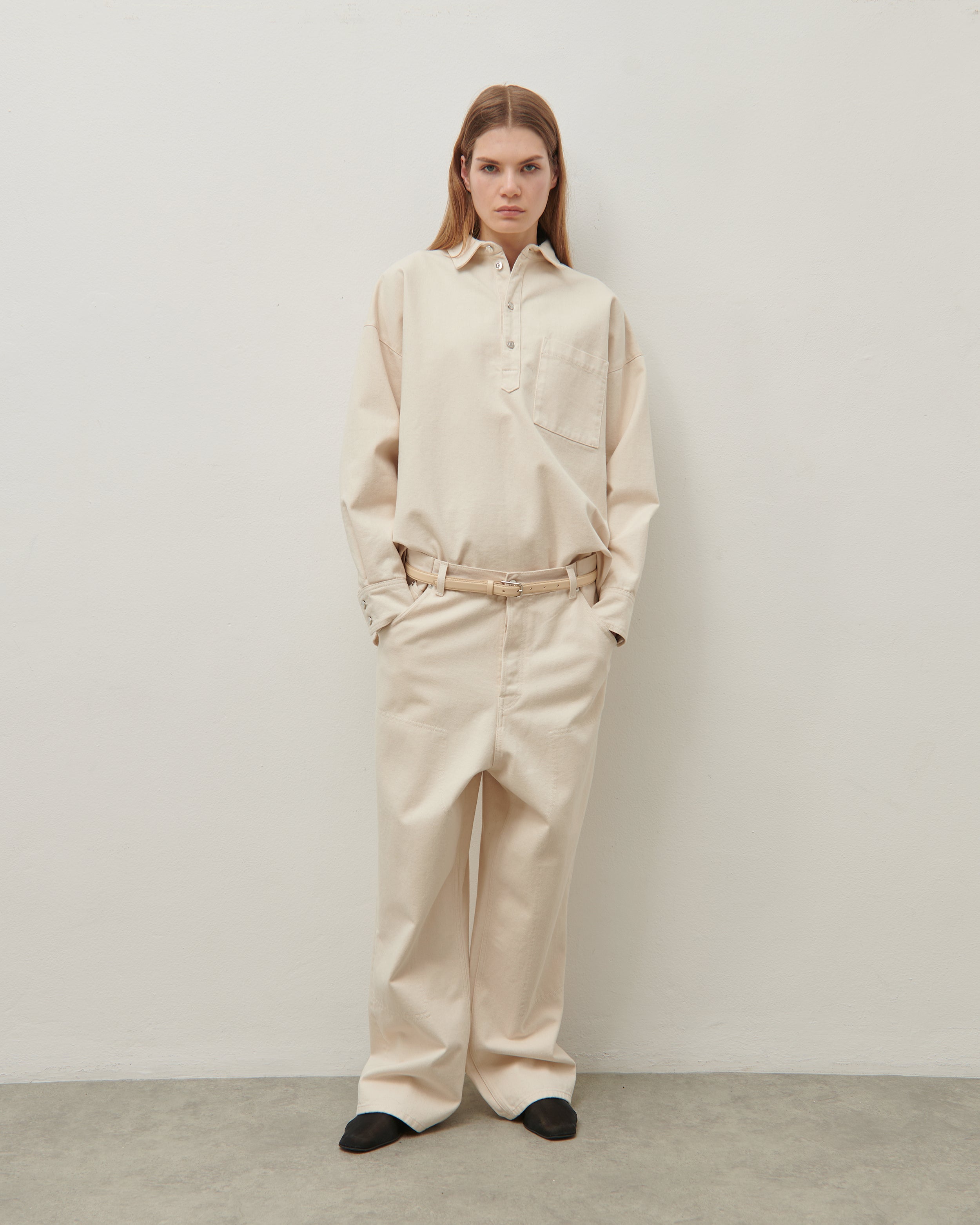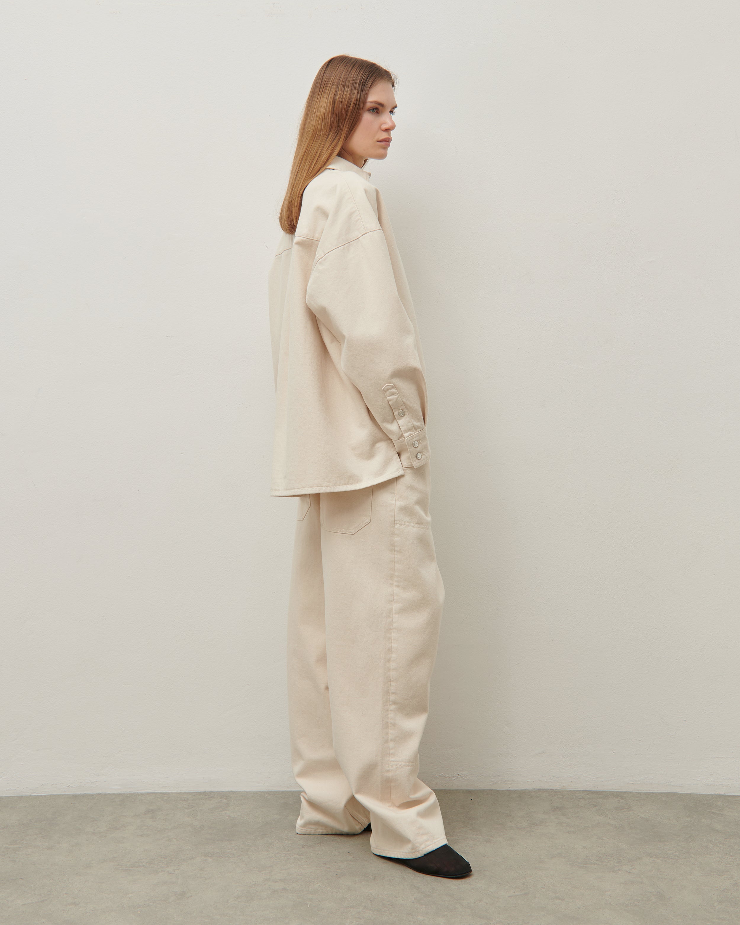 Low rise jean in lightweight natural cotton denim, oversized fit, wide-leg silhouette and 5 pocket styling. Metal buttons.