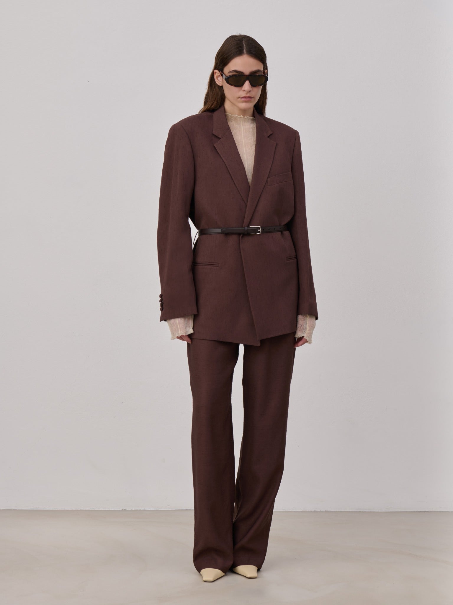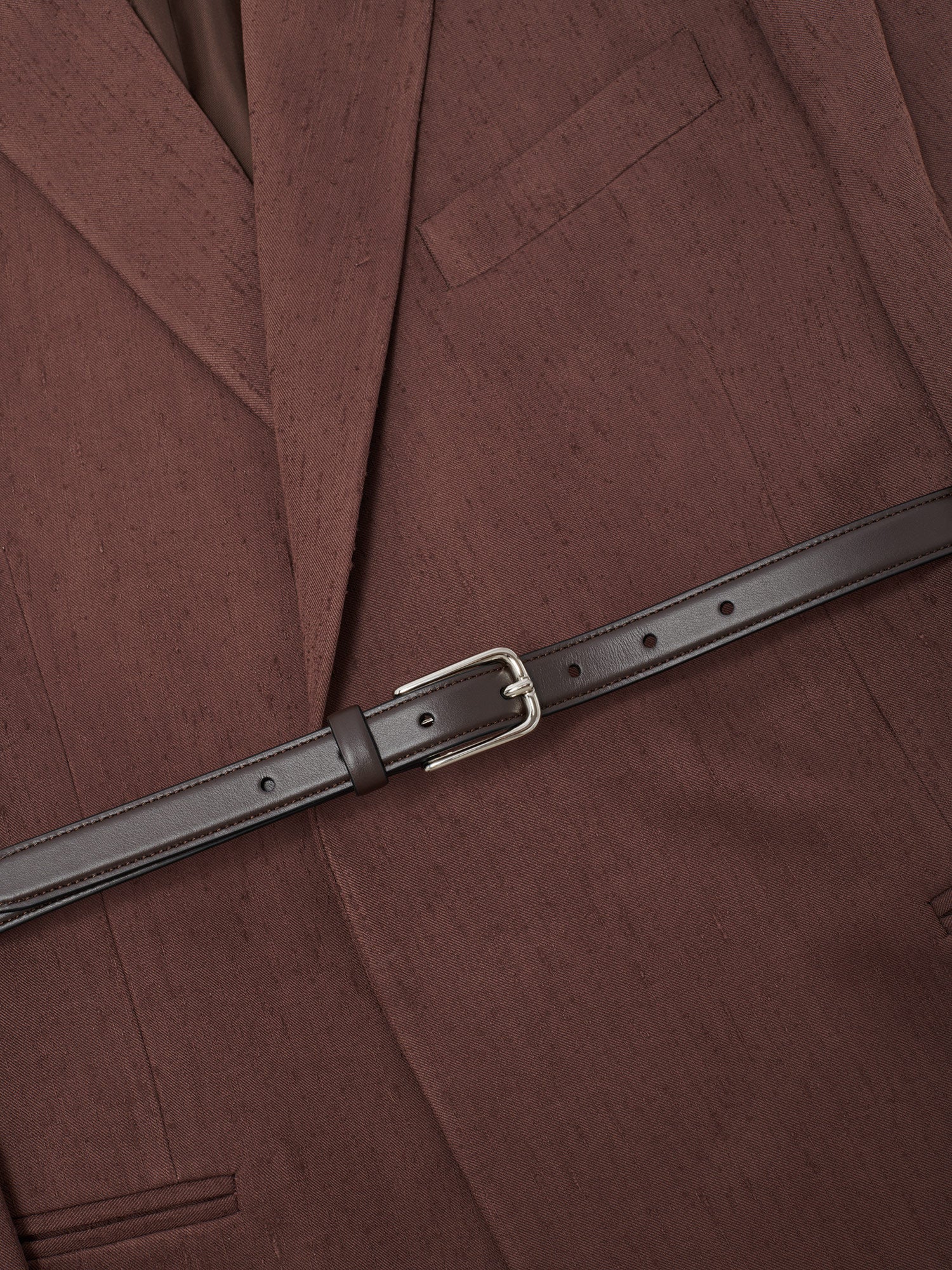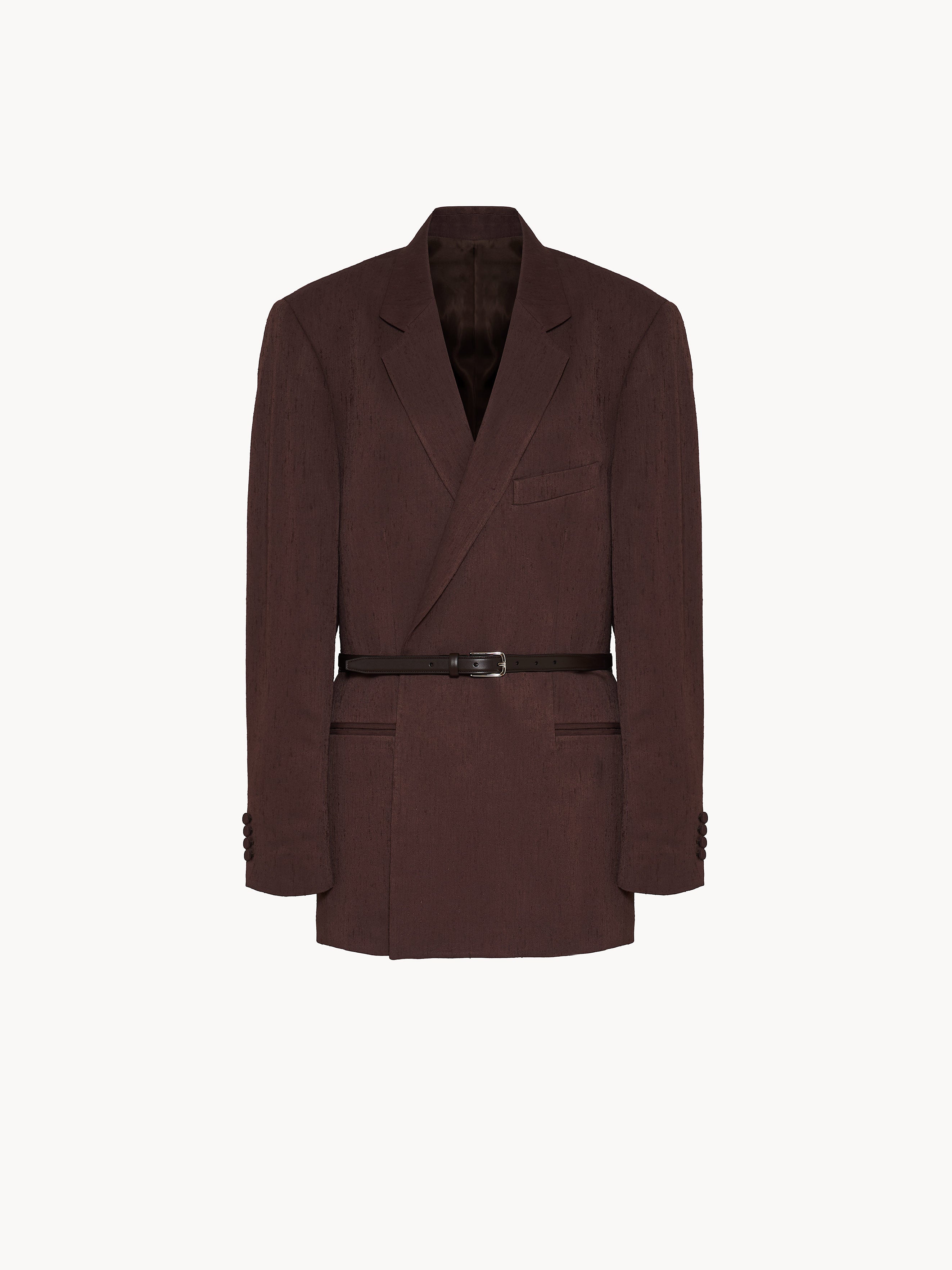 Tailored jacket in viscose with notch lapel, chest pocket, besom pockets, interior pockets, finished with a slim belt in calf leather. Horn buttons. Inside horn buttons. Lining 100% Cupro. Made in Italy.