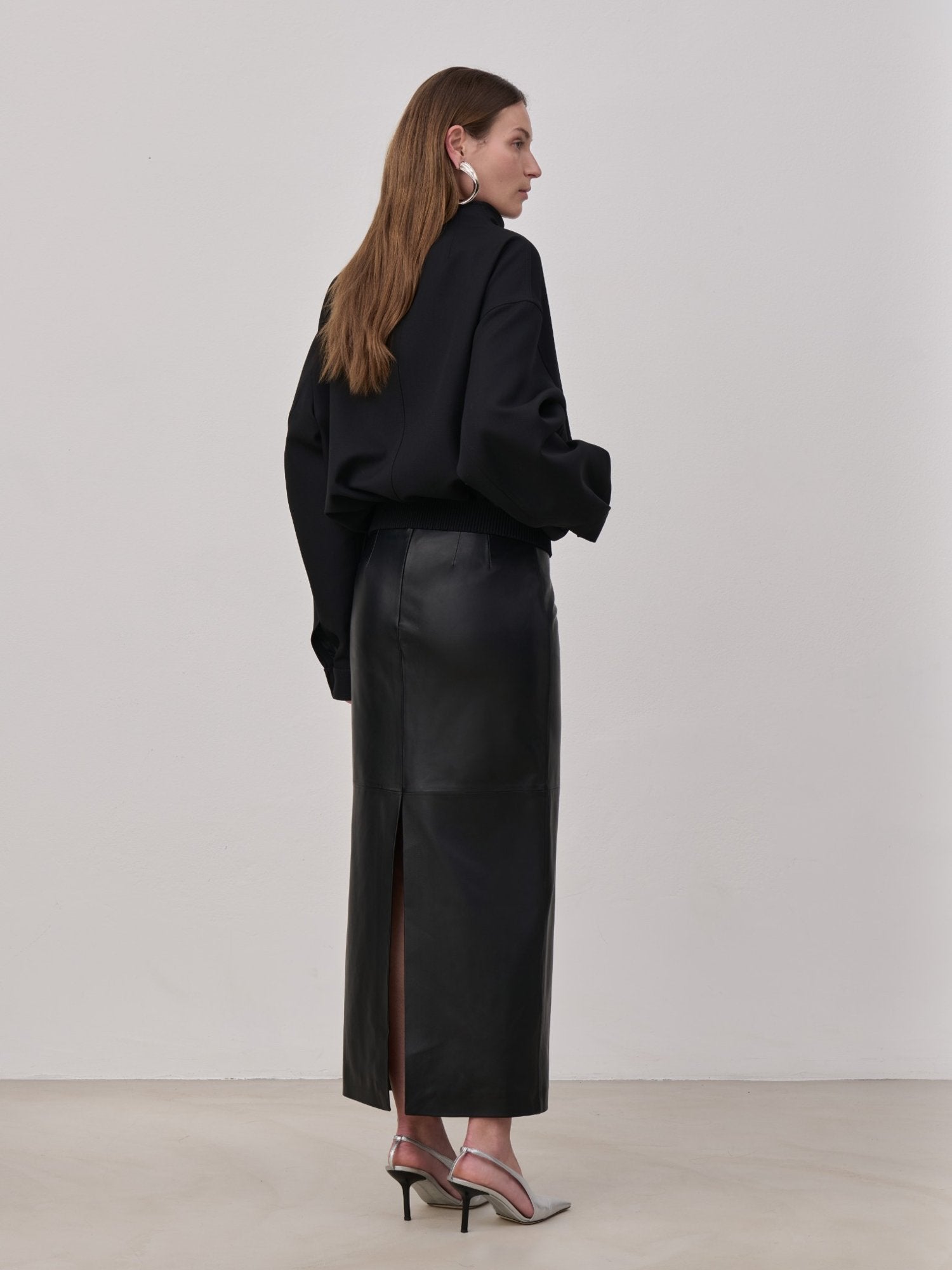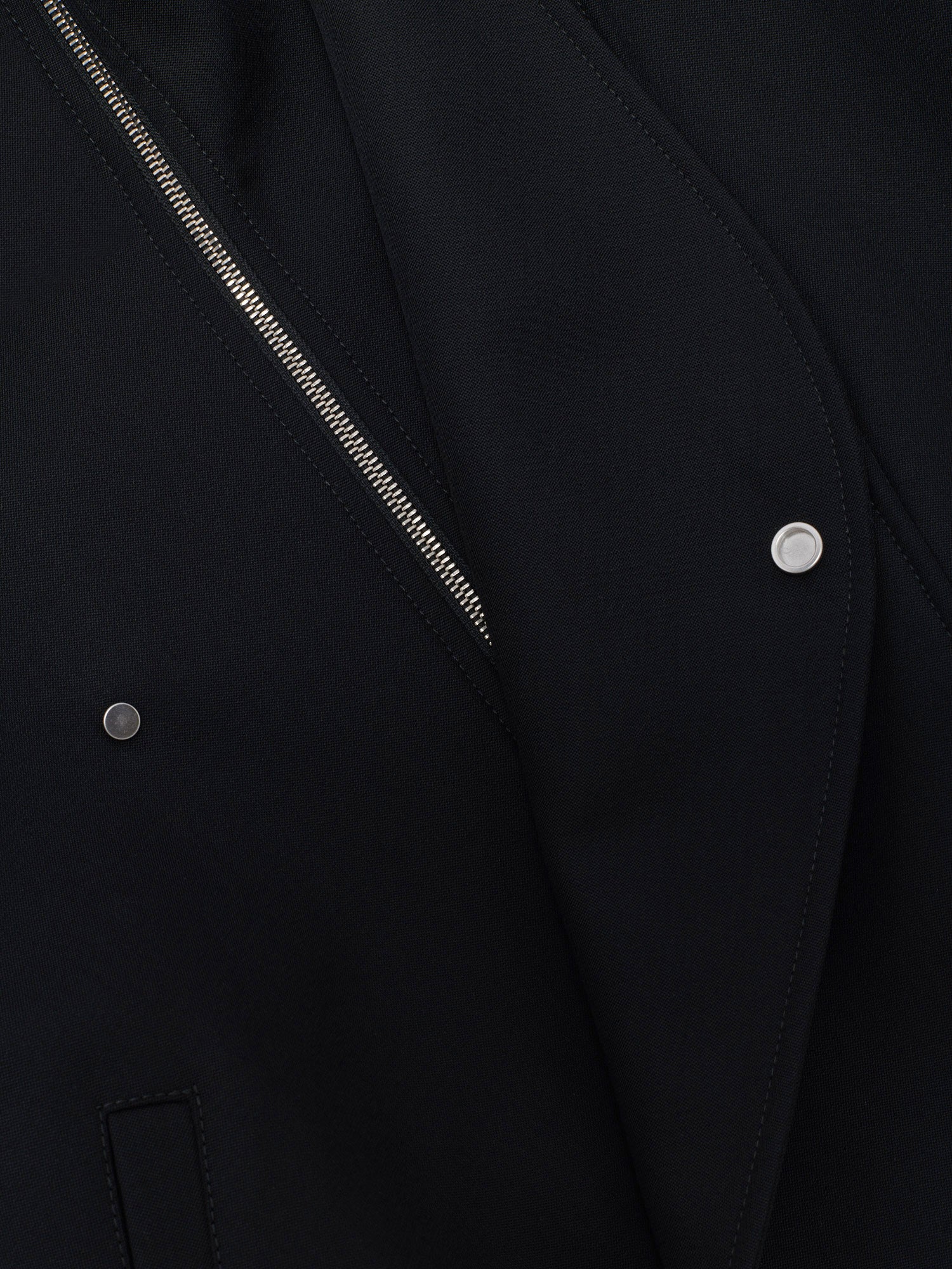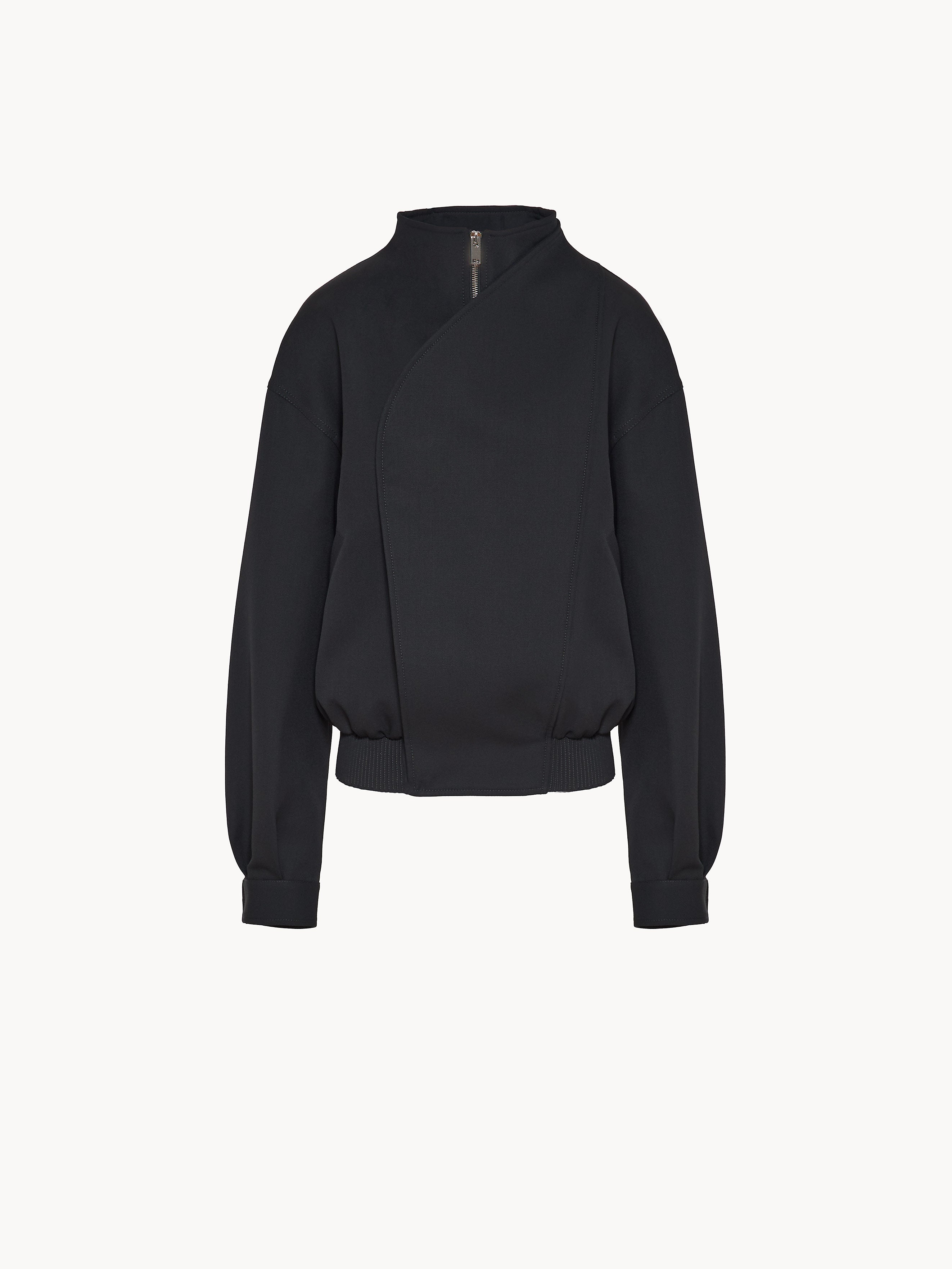 Oversize bomber jacket in virgin wool, featuring a crater collar, central zipper closure with a flap detail covering the zip with a snap fastening and welt side pockets. Leather elastic band on cuffs and hem. 100% Virgin Wool. Lining 100% Cupro. Made in Italy.