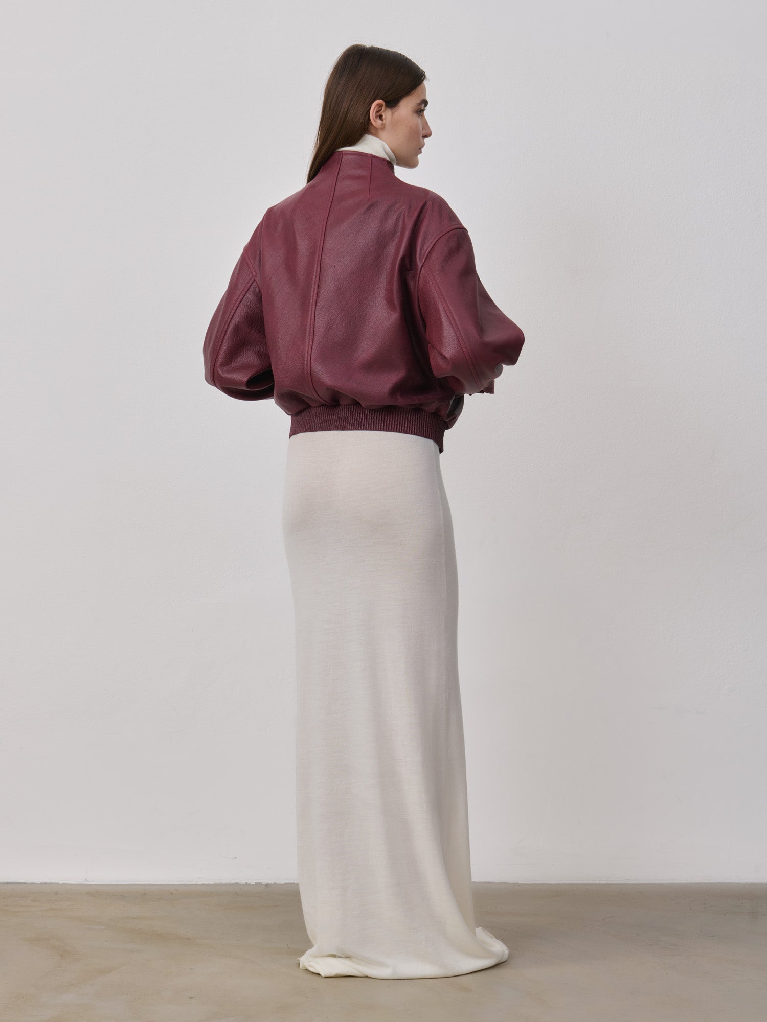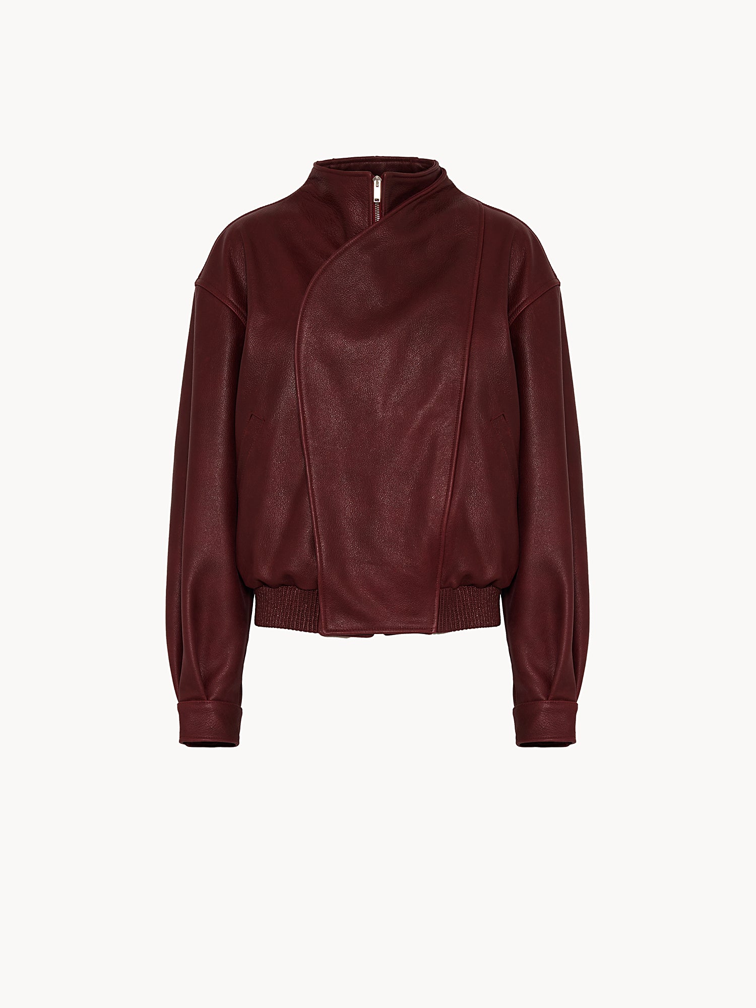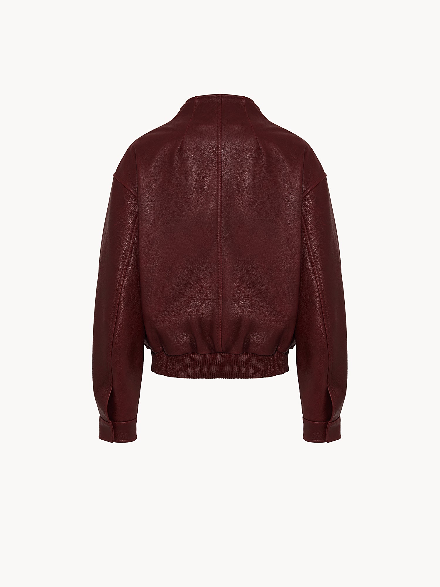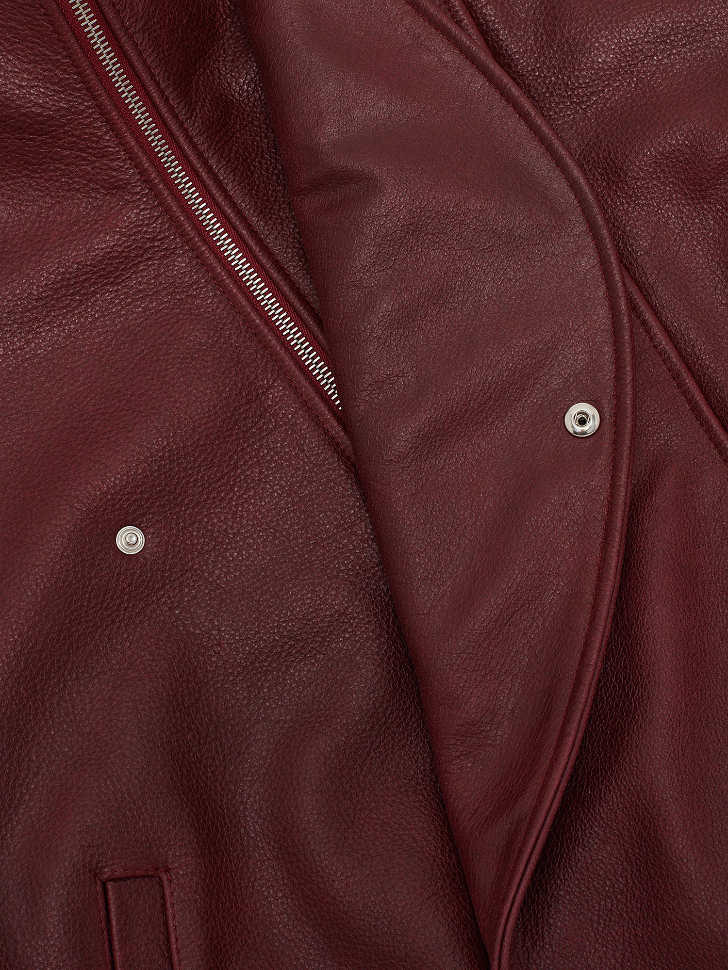 Oversized bomber jacket in drummed calf leather, featuring a crater collar, central zipper closure, welt side pockets and a flap detail covering the zip with a snap fastening. Leather elastic band on cuffs and hem. 100% Calfskin. Lining 100% Cupro. Made in Italy.