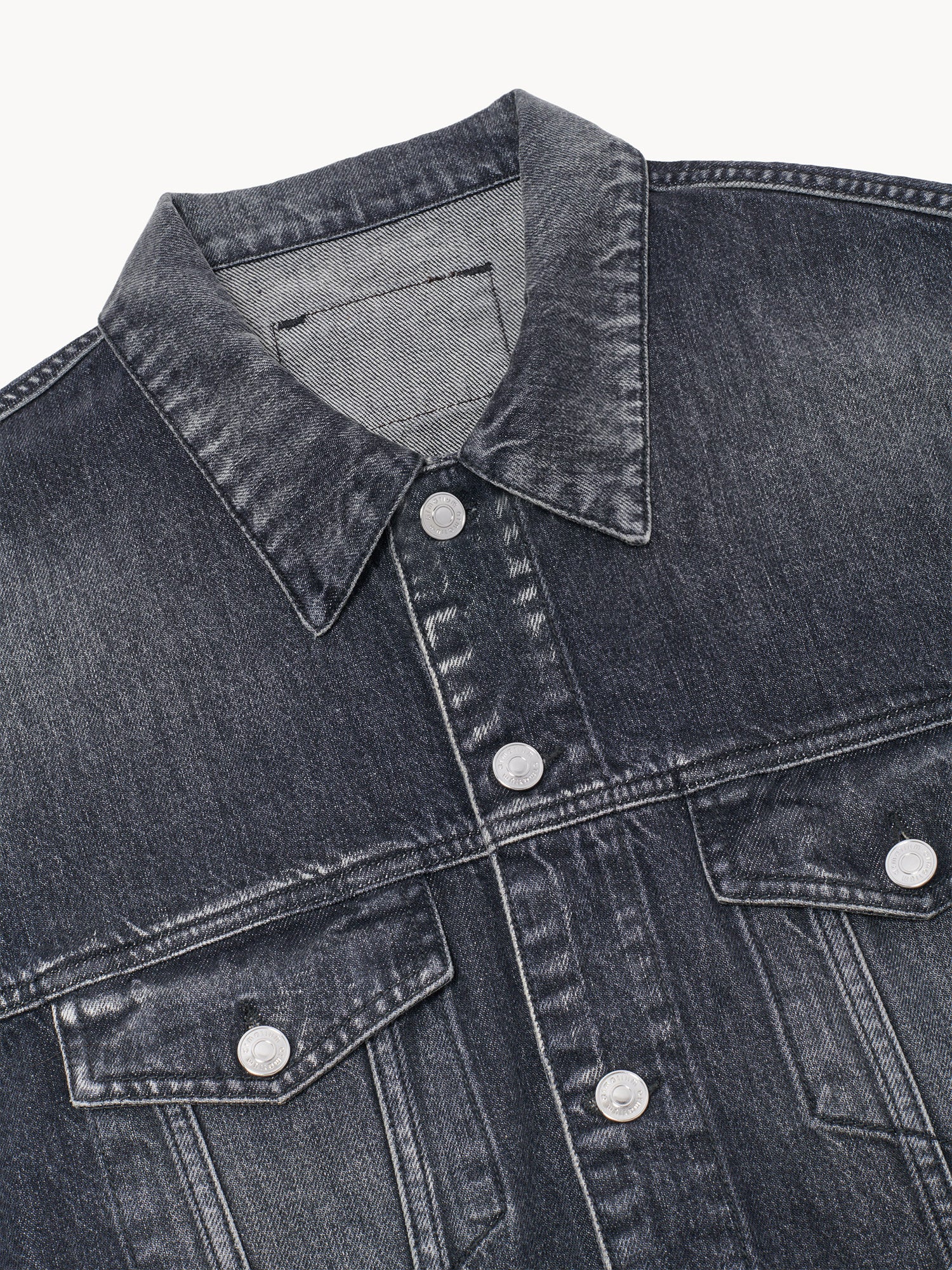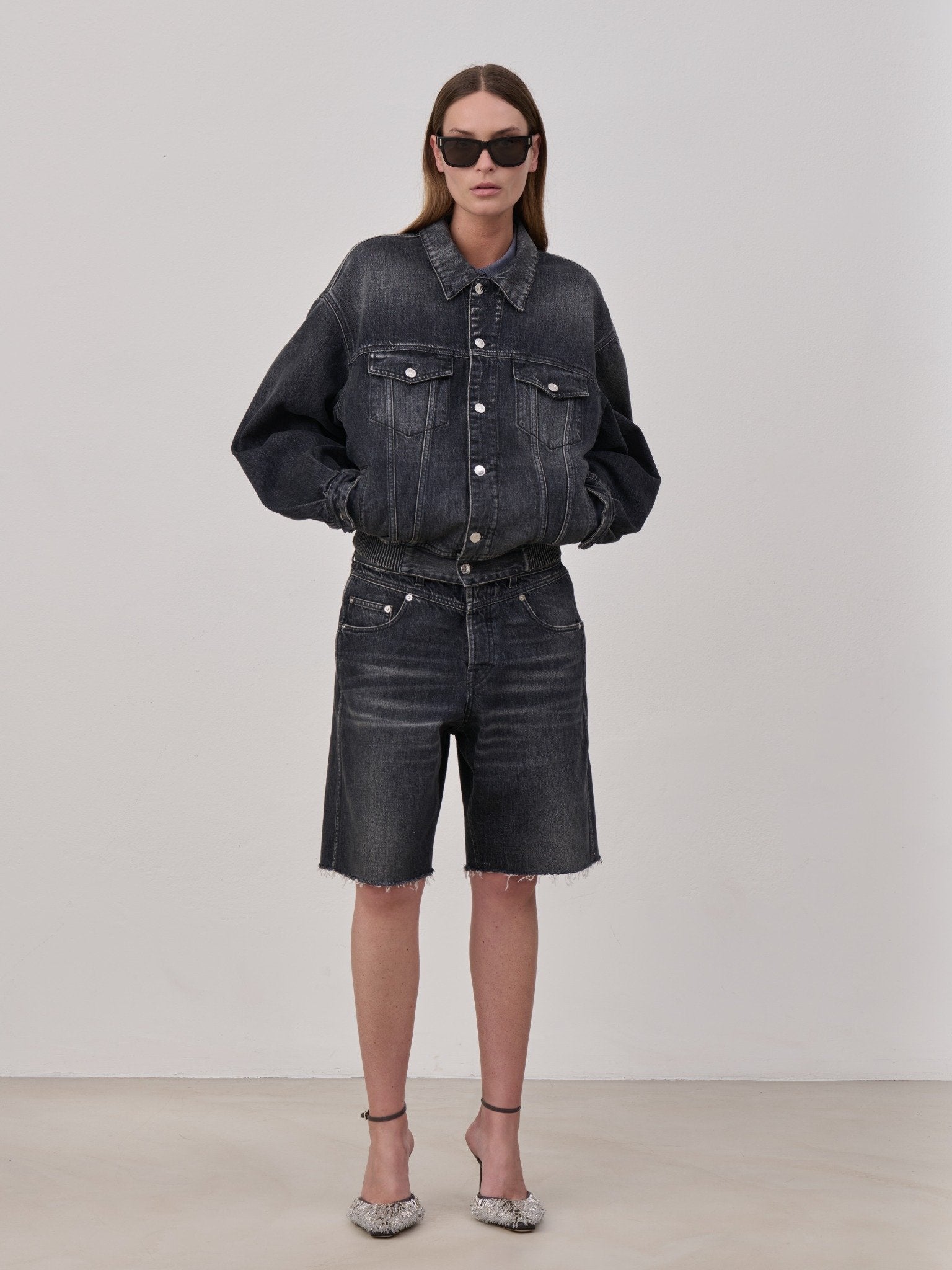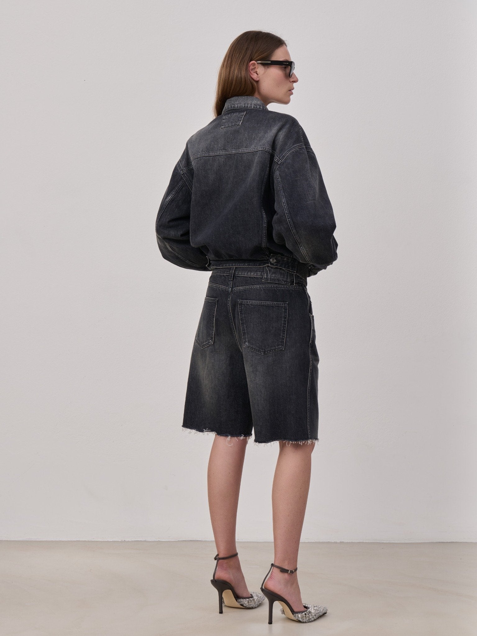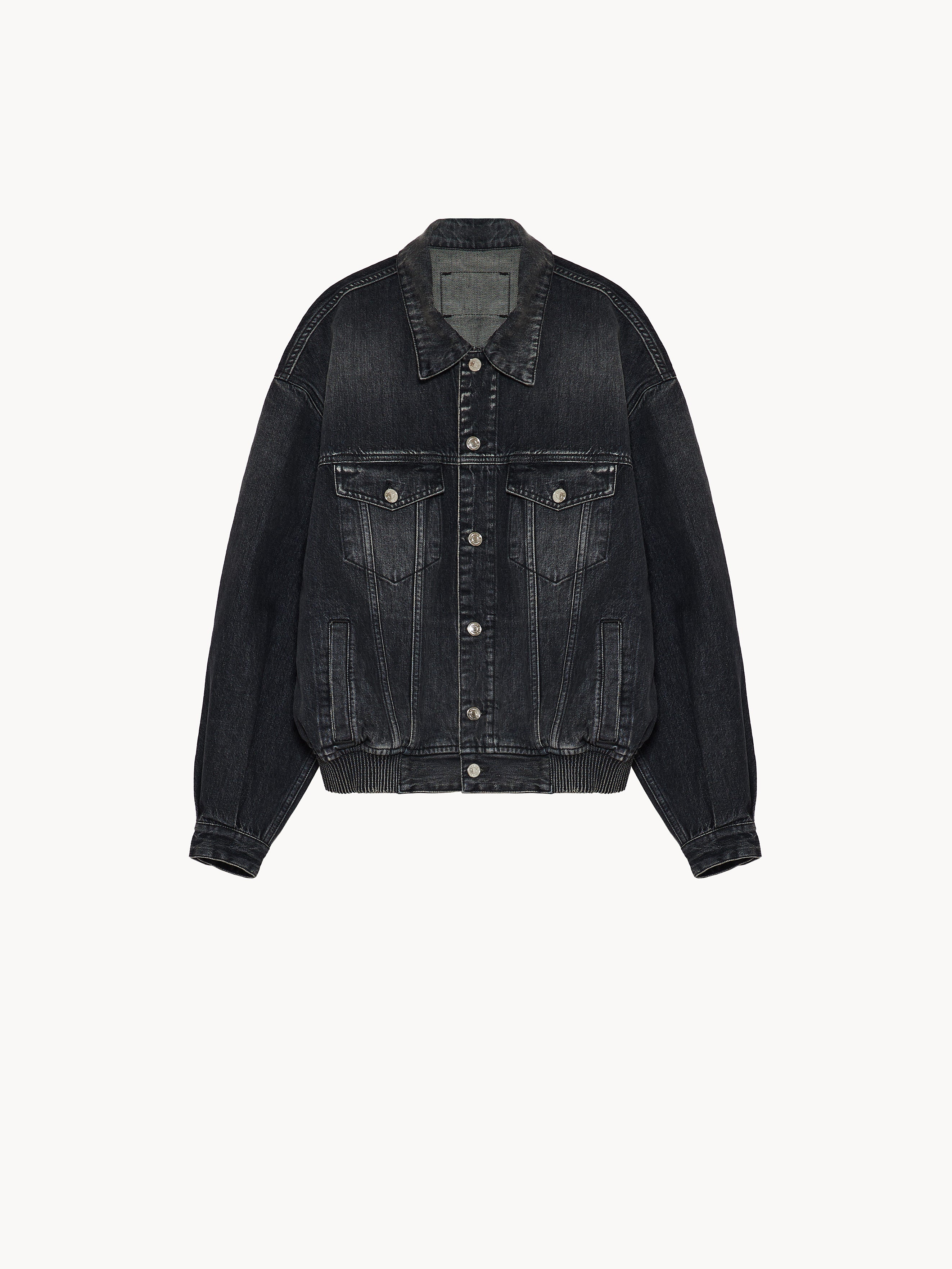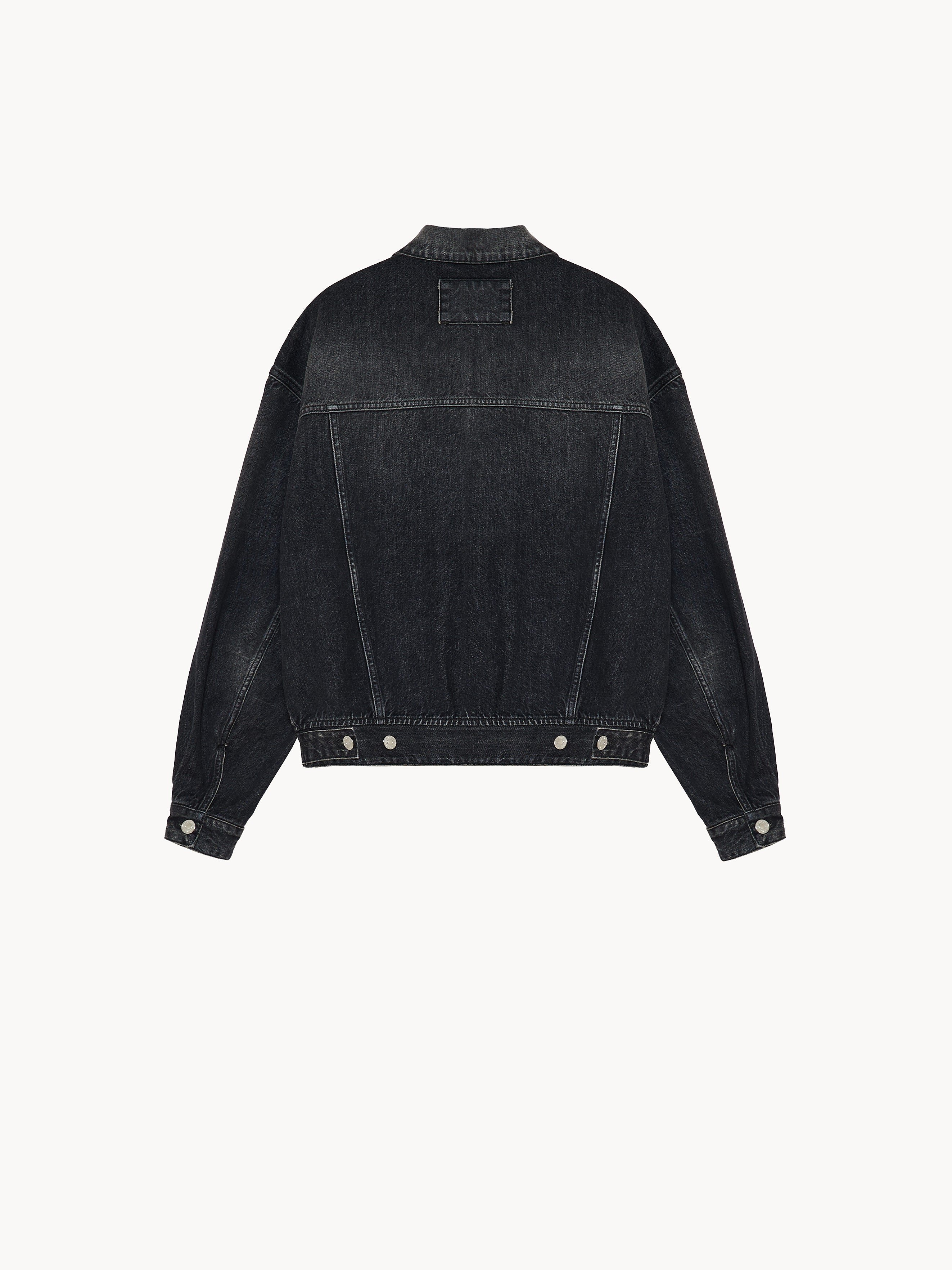 Bomber jacket in vintage washed denim featuring traditional trucker-style details with a front elasticated waistband and an adjustable back tabs with buckle for added comfort. Designed with a tonal denim back patch, side welt pockets and flap pockets seamlessly integrated into the front yoke. Metal buttons. Made in Italy.