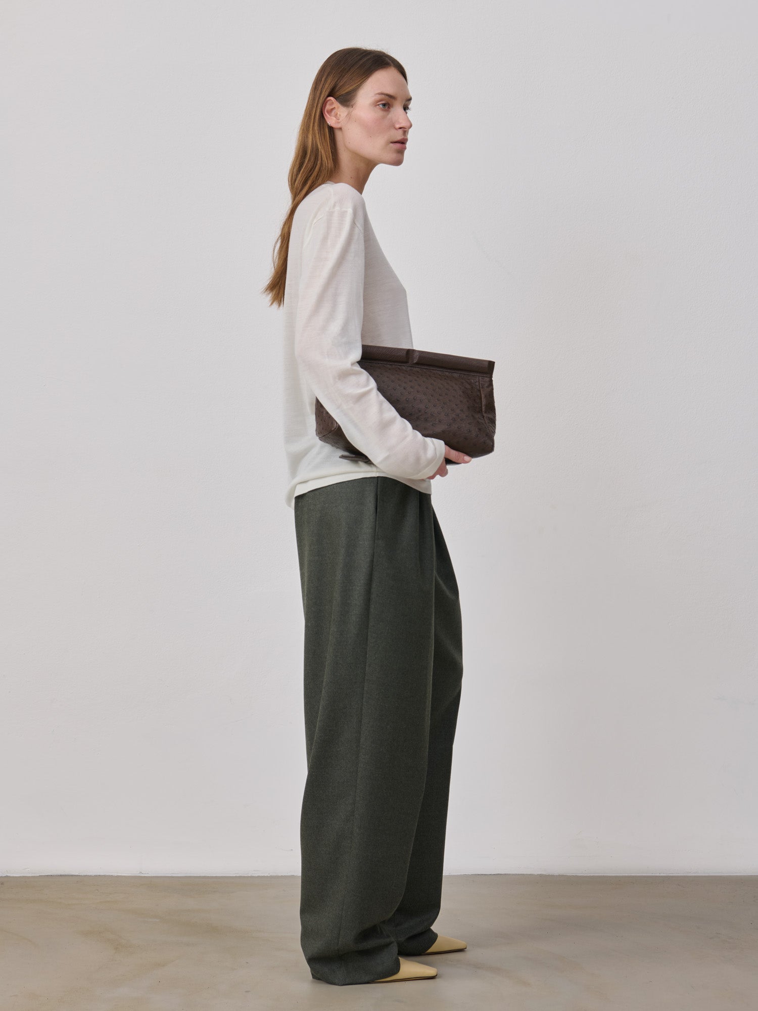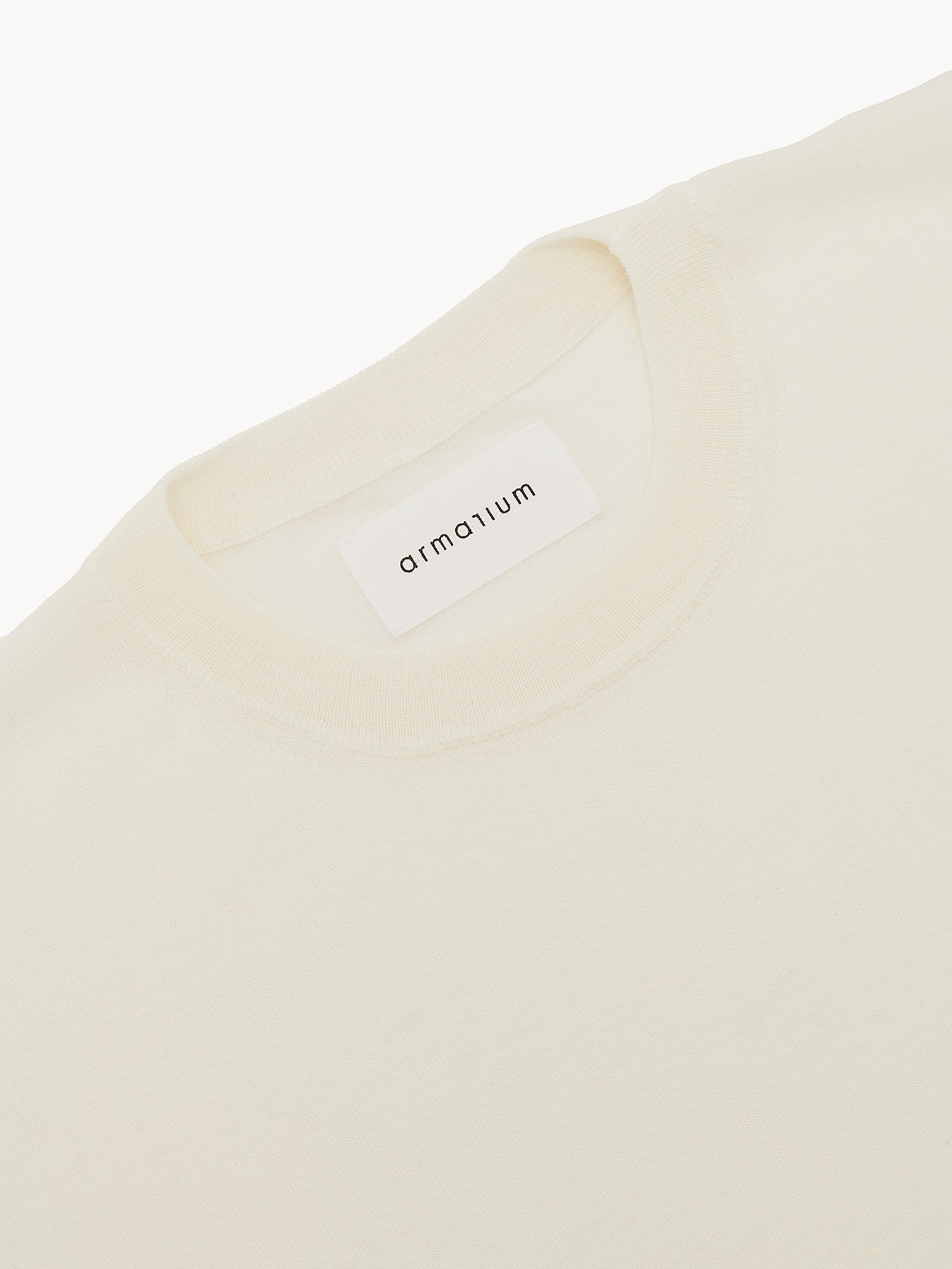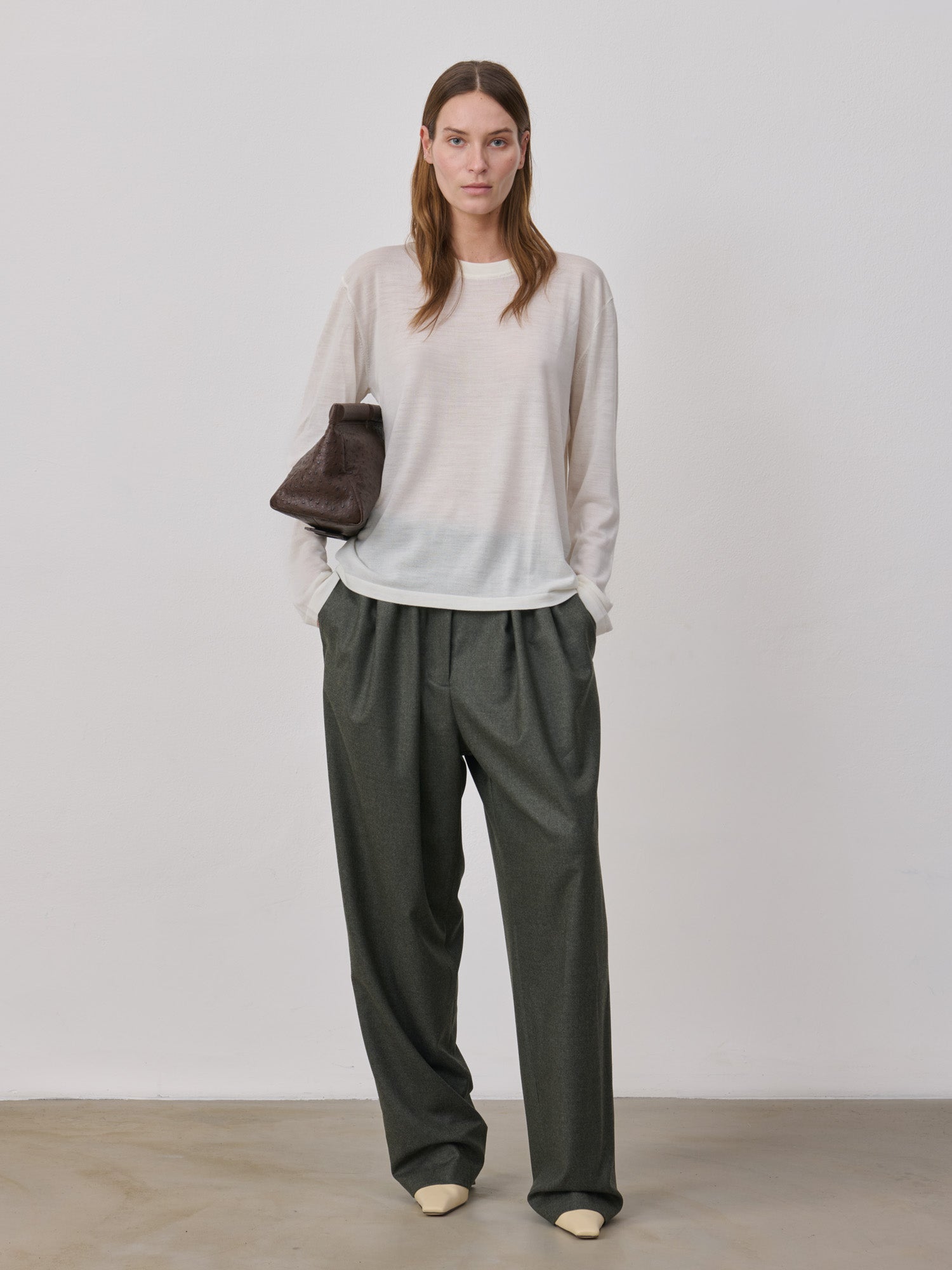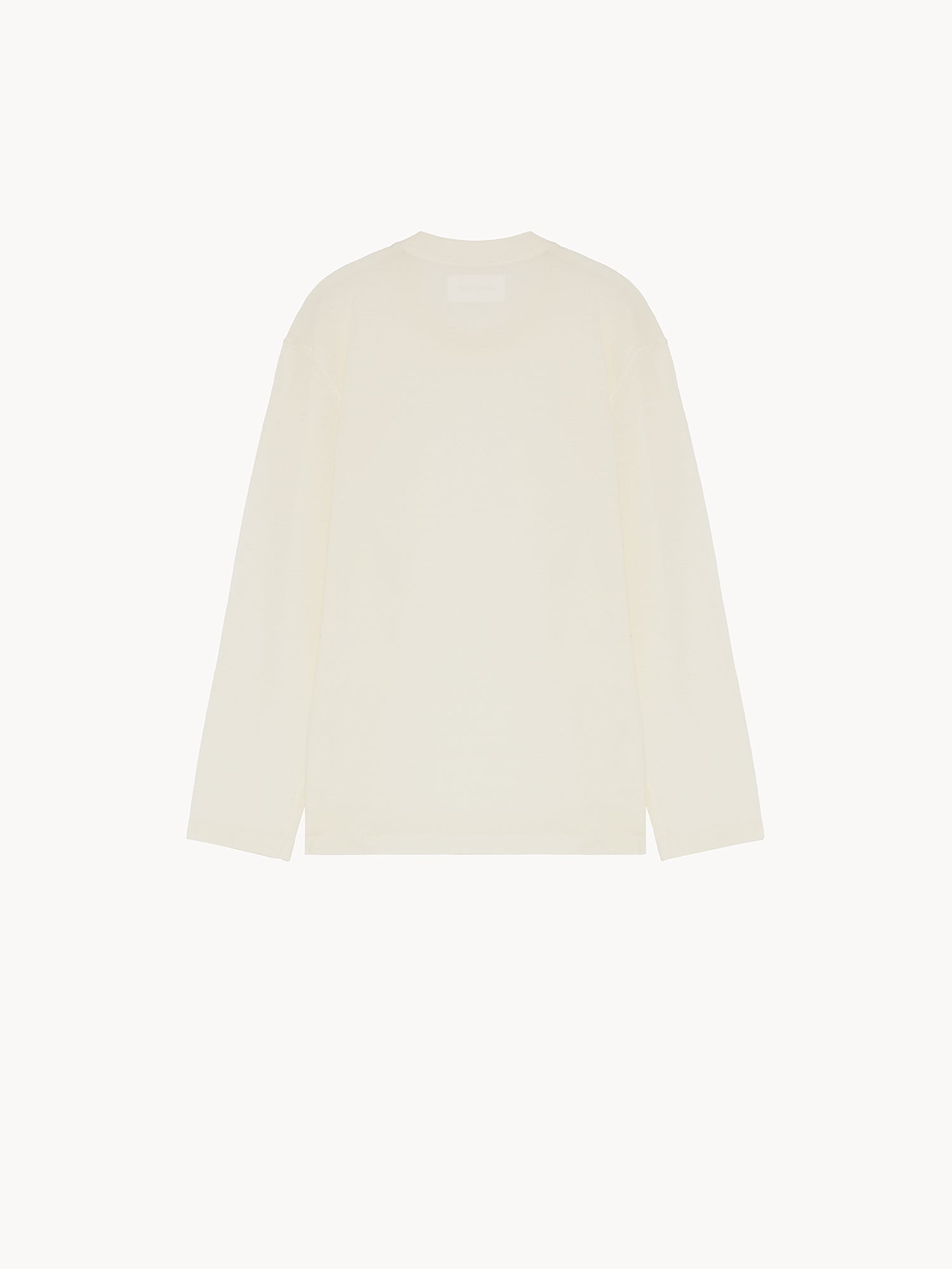 Unisex long-sleeved crewneck top in merino wool knit with relaxed fit and ribbed neck. 100% Merino Wool. Made in Italy.