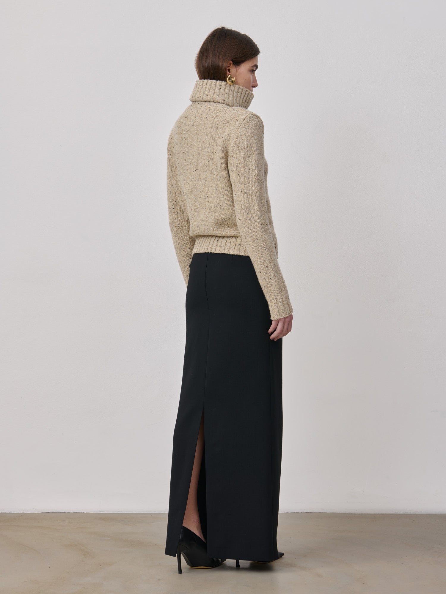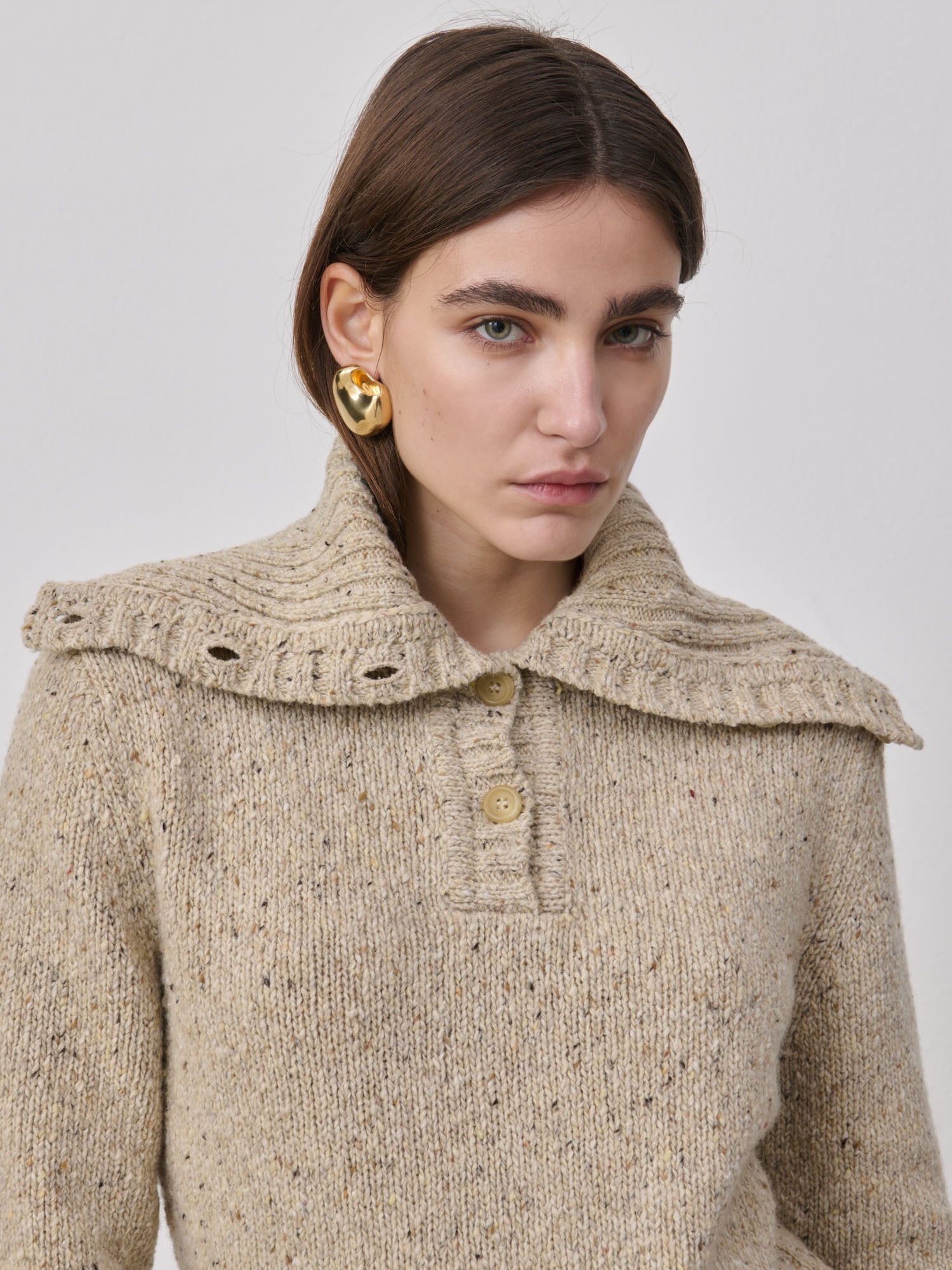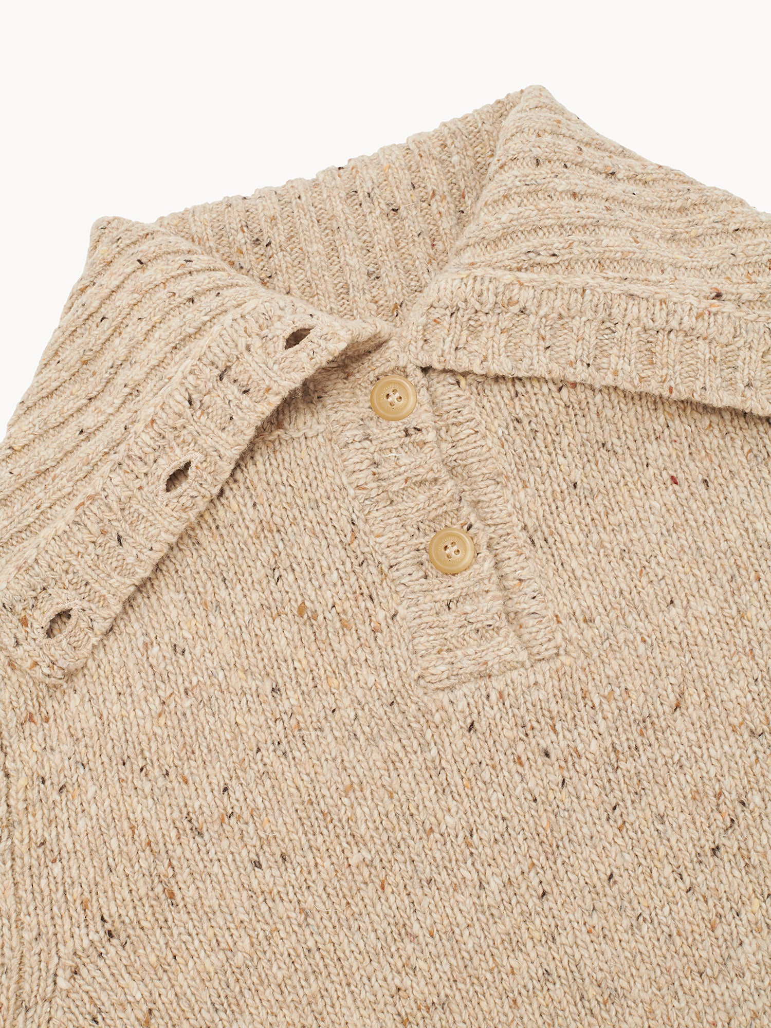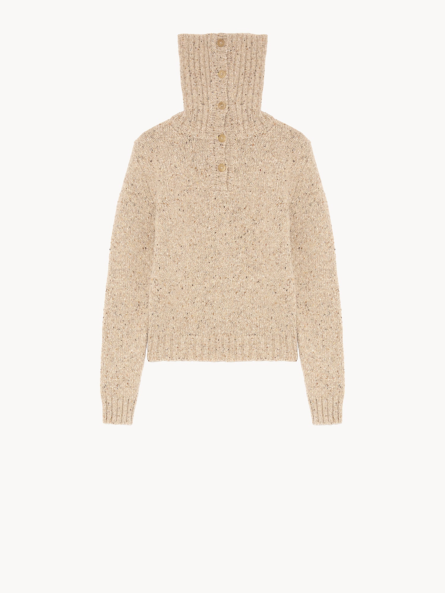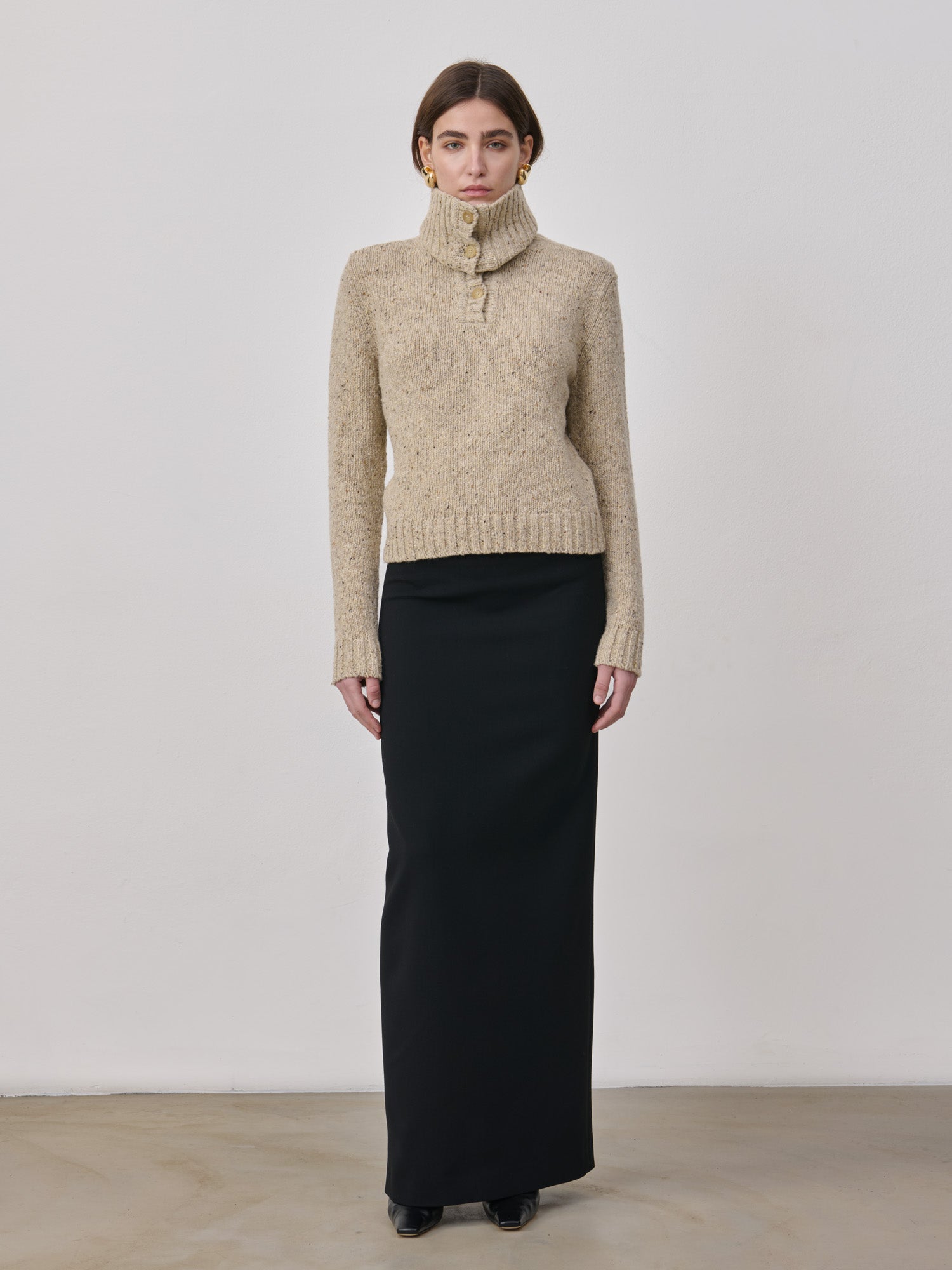 Long sleeved knit in knickerbocker fine merino wool with a regular fit, funnel neck, half-button fastening and ribbing at neck, cuffs and hem. 100% Fine Merino Wool. Horn buttons. Made in Italy.